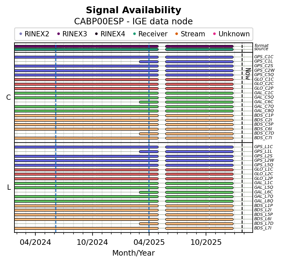 Red vertical lines, green and blue vertical dotted lines indicate respectively a change of antenna, receiver or receiver configuration (including firmware) as indicated by the station manager in the station site log available from the M3G GNSS Metadata Catalog. The purple points in the top of the plot indicate the daily RINEX data availability at the data node.
