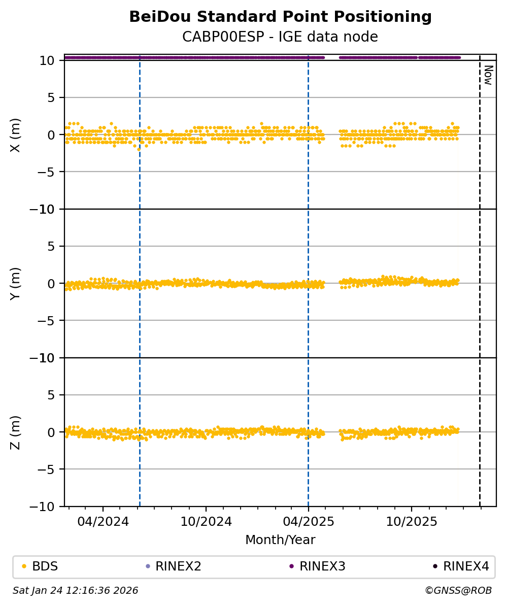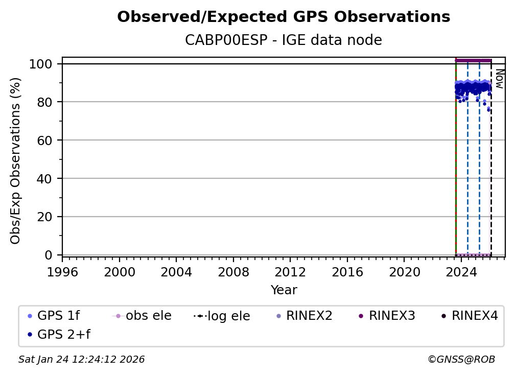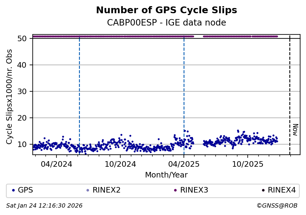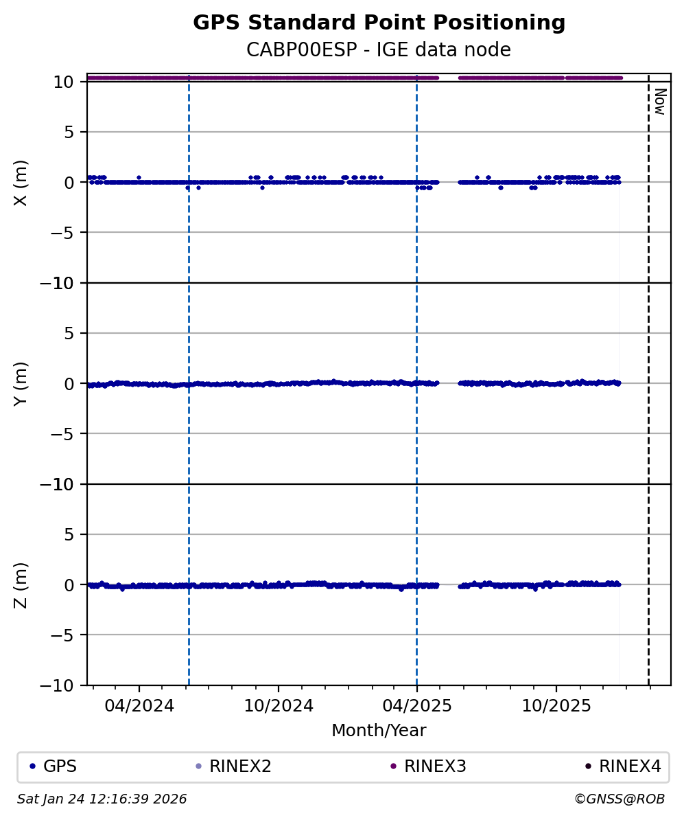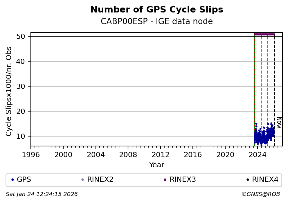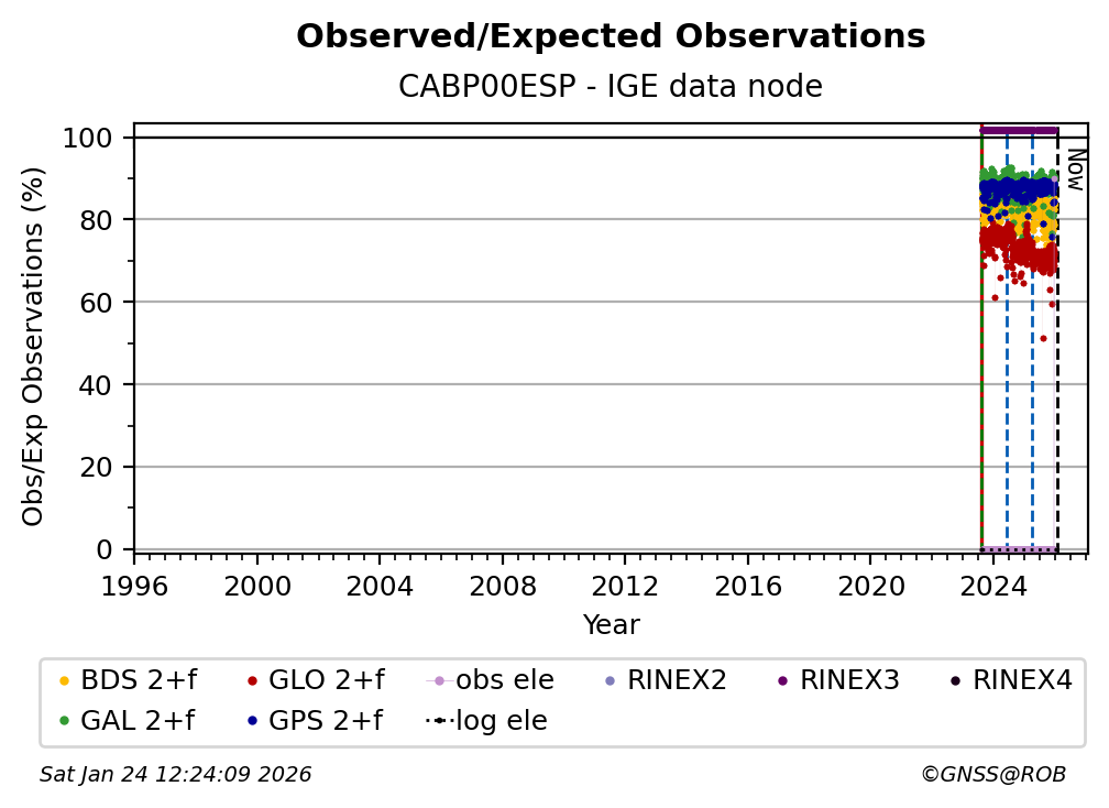 The plots below present the long-term tracking performance of the EPOS-GNSS station CABP00ESP based on the daily RINEX data available from the IGE EPOS-GNSS data node. The data quality metrics have been computed at the data node using the G-Nut/Anubis software.