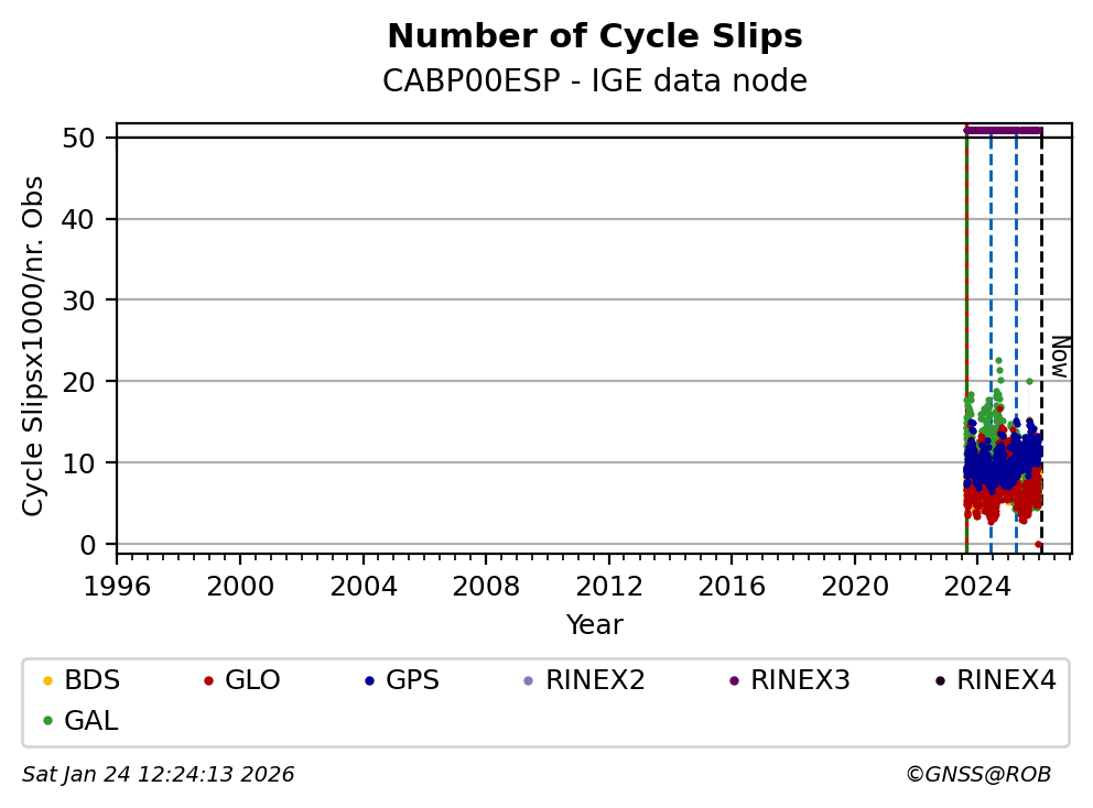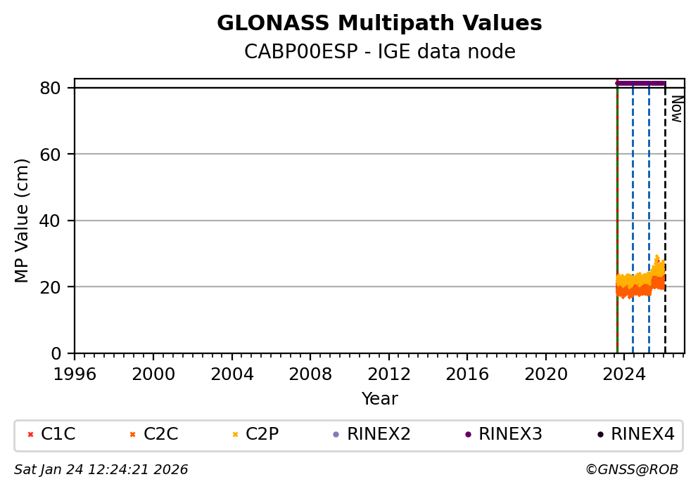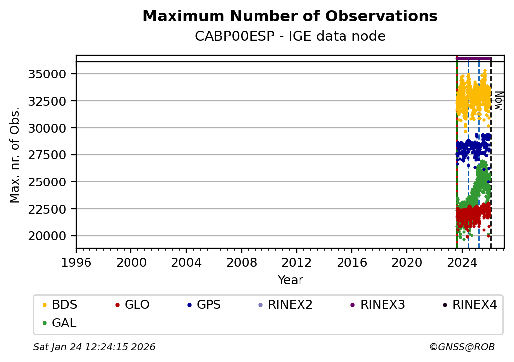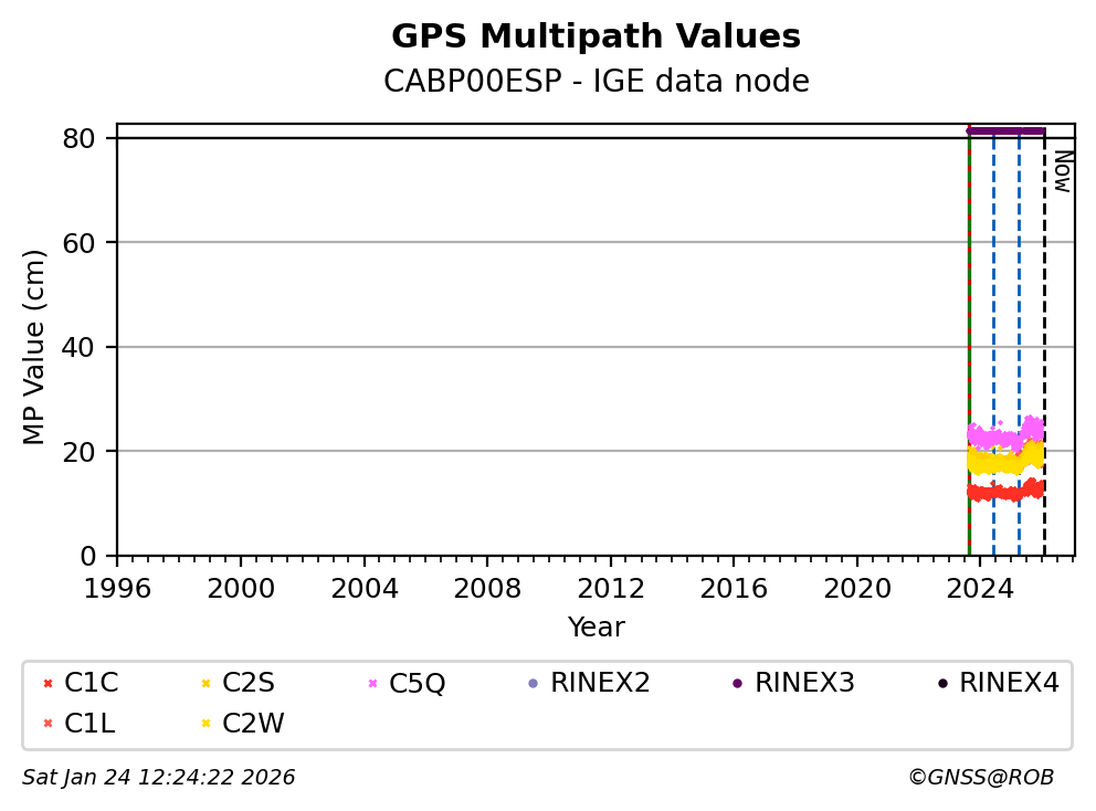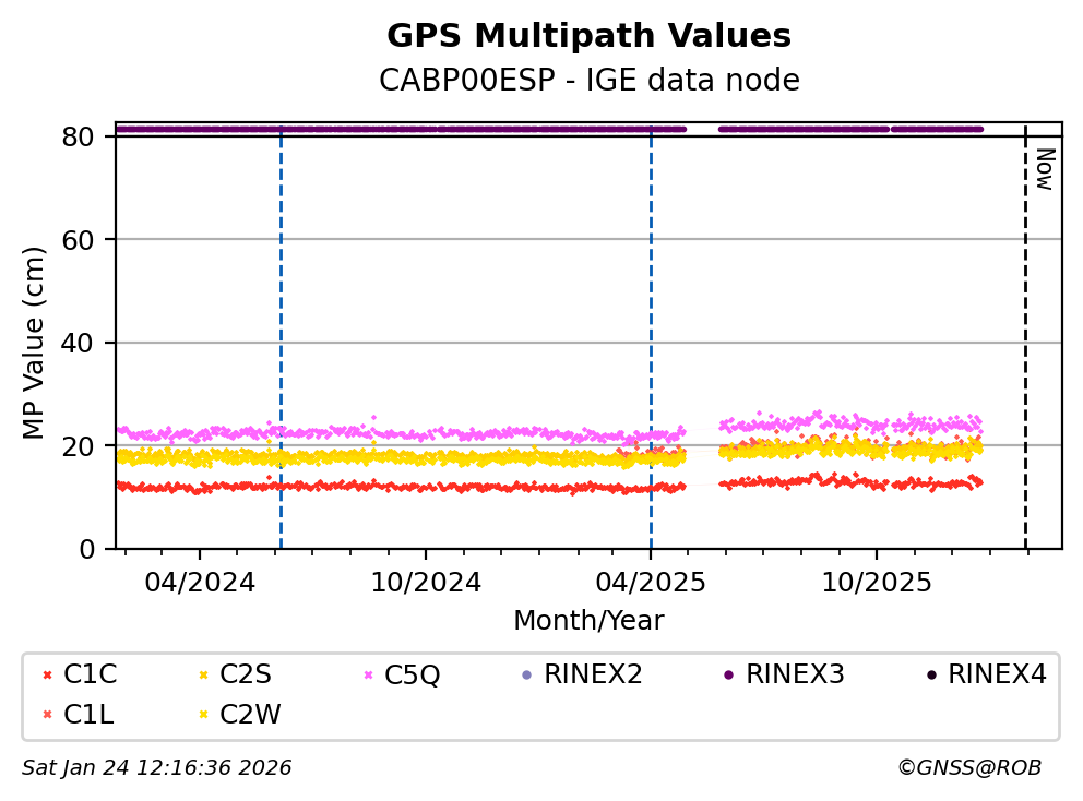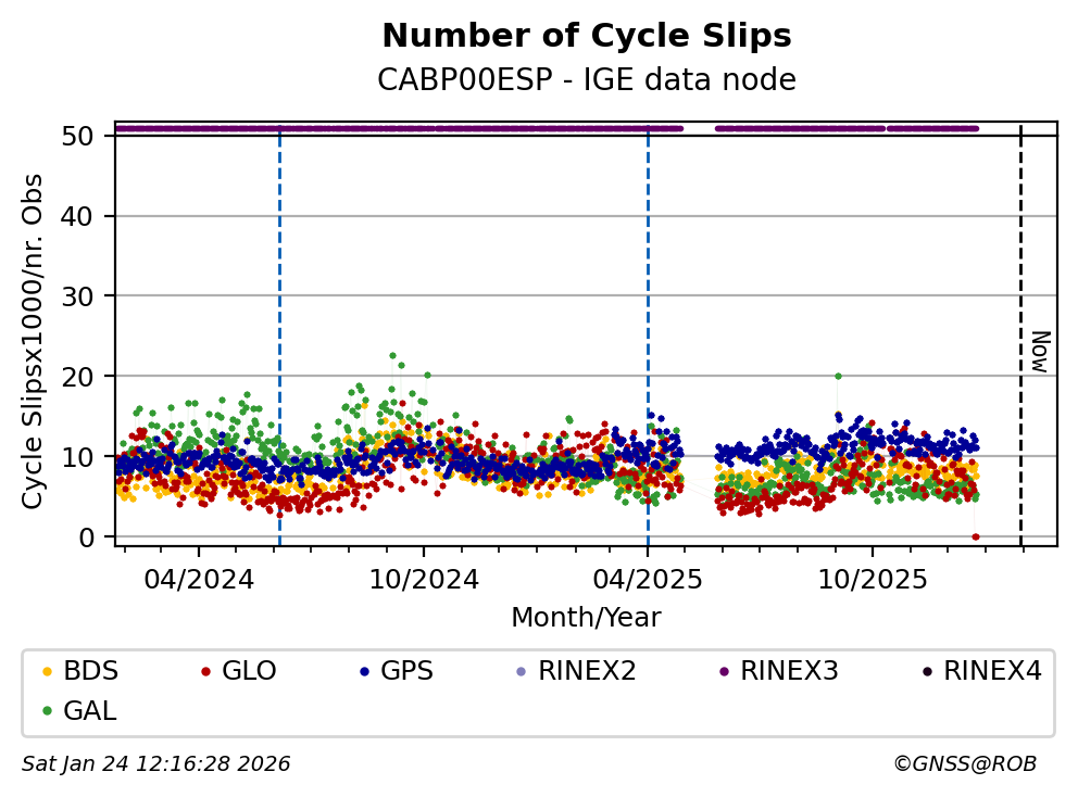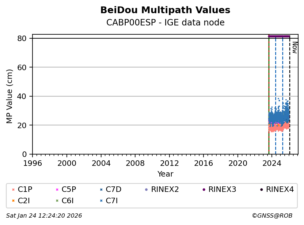 The plots below present the long-term tracking performance of the EPOS-GNSS station CABP00ESP based on the daily RINEX data available from the IGE EPOS-GNSS data node. The data quality metrics have been computed at the data node using the G-Nut/Anubis software.