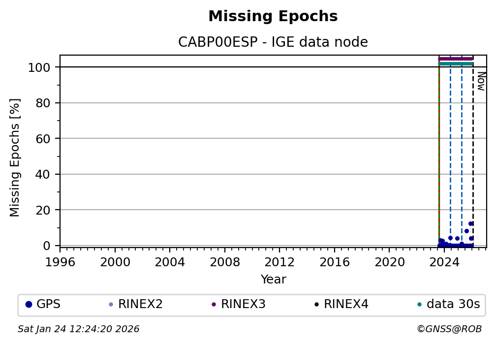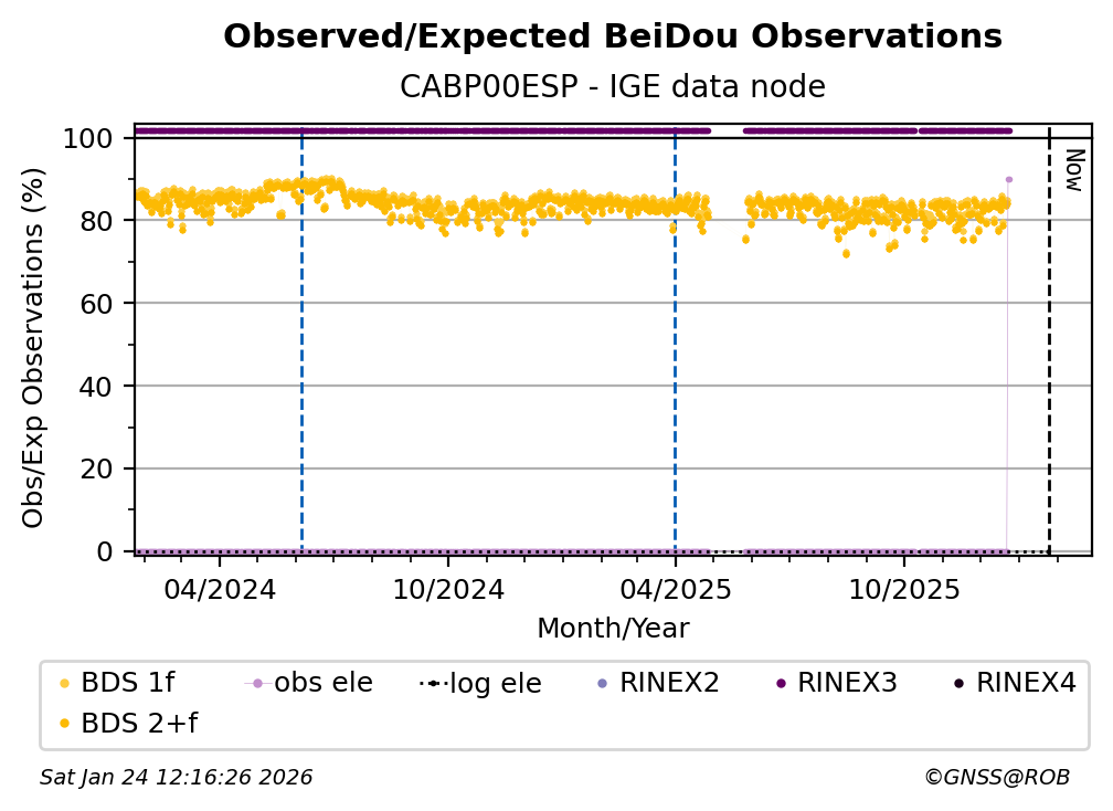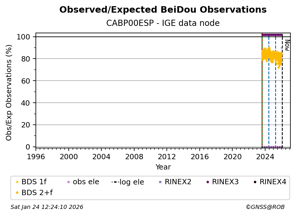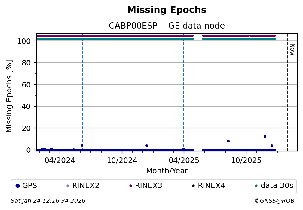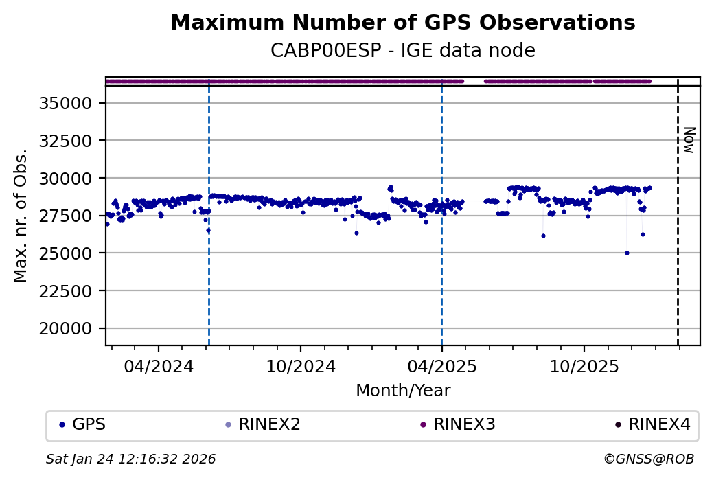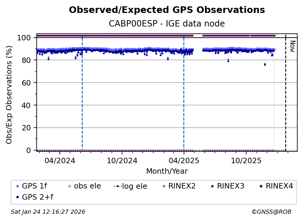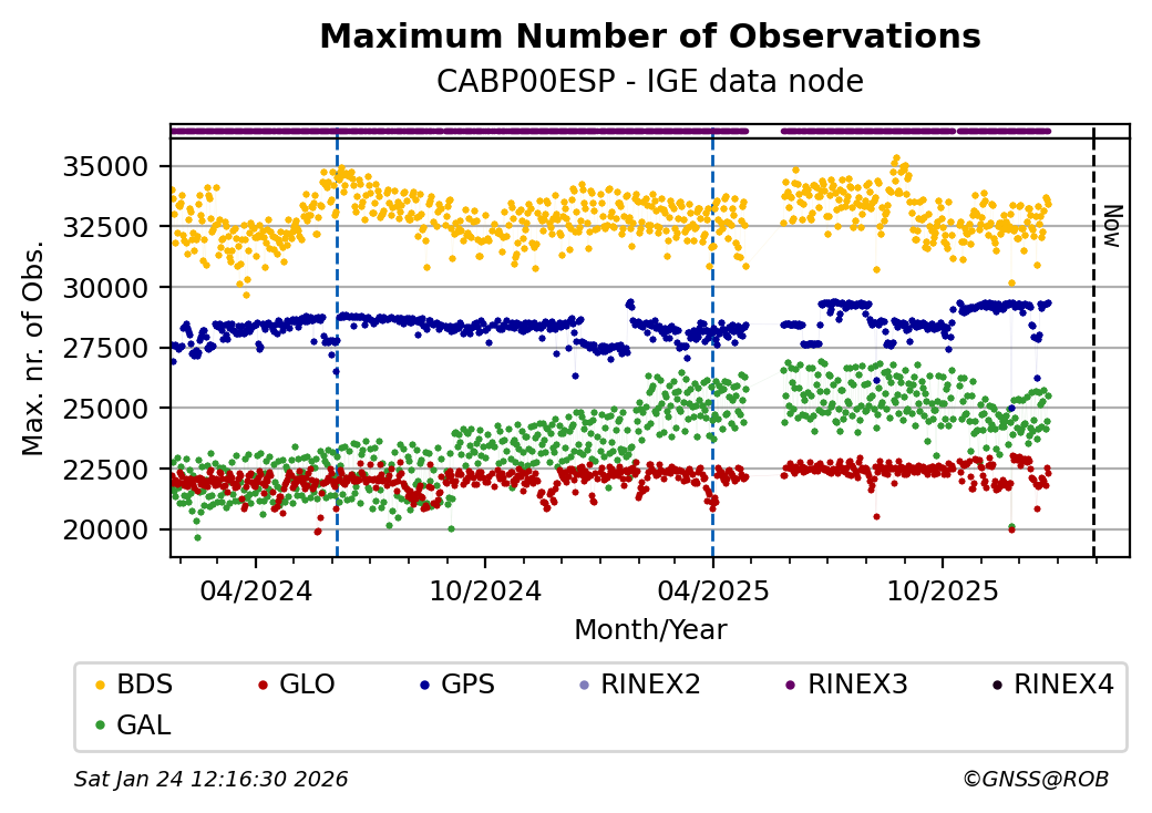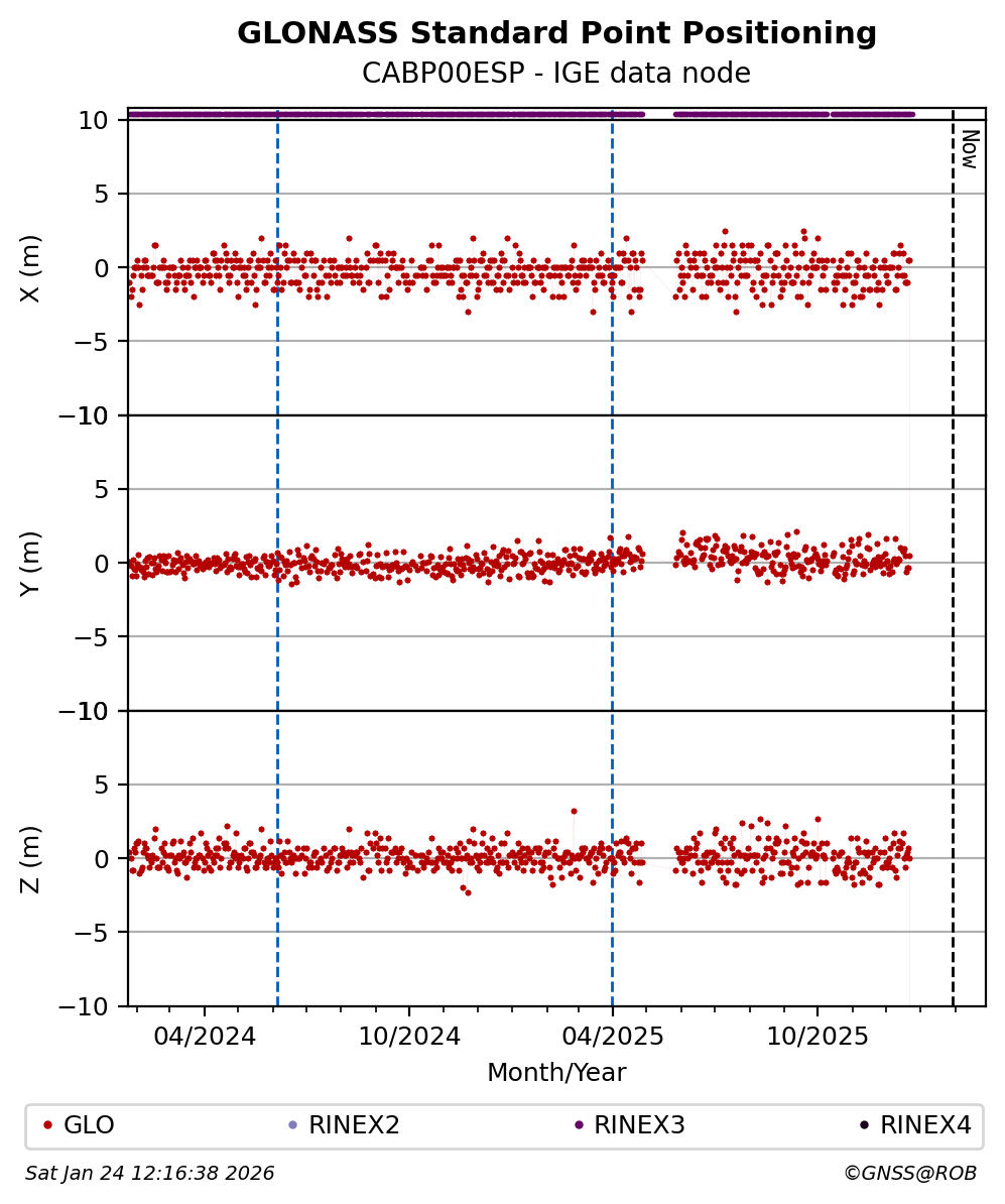 The plots below present the long-term tracking performance of the EPOS-GNSS station CABP00ESP based on the daily RINEX data available from the IGE EPOS-GNSS data node. The data quality metrics have been computed at the data node using the G-Nut/Anubis software.