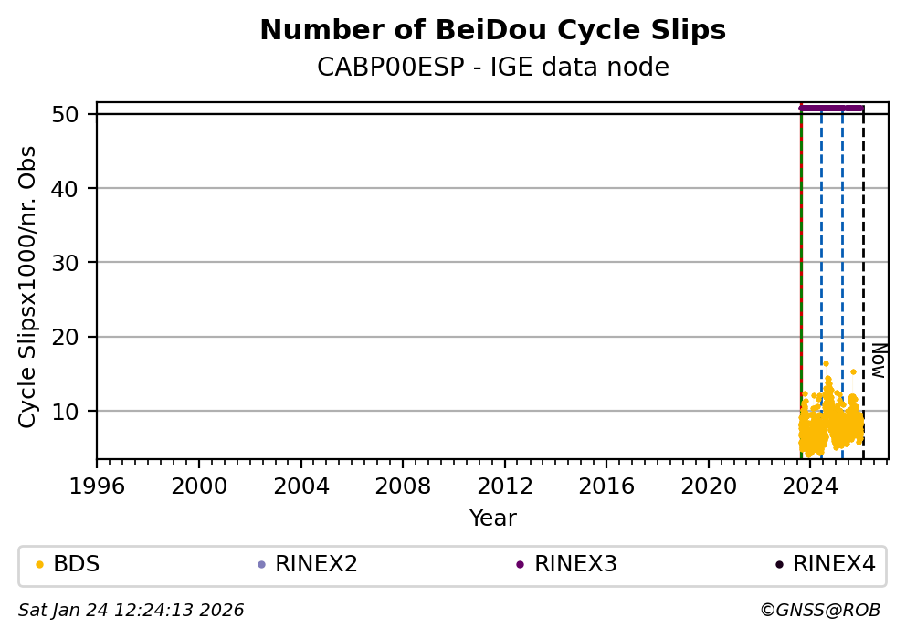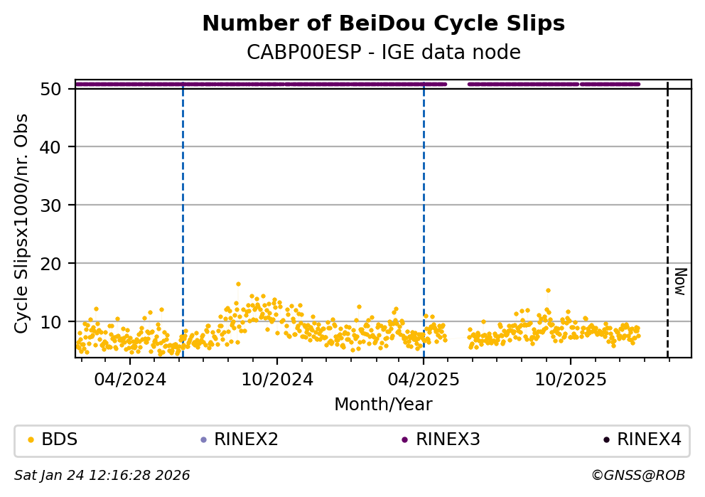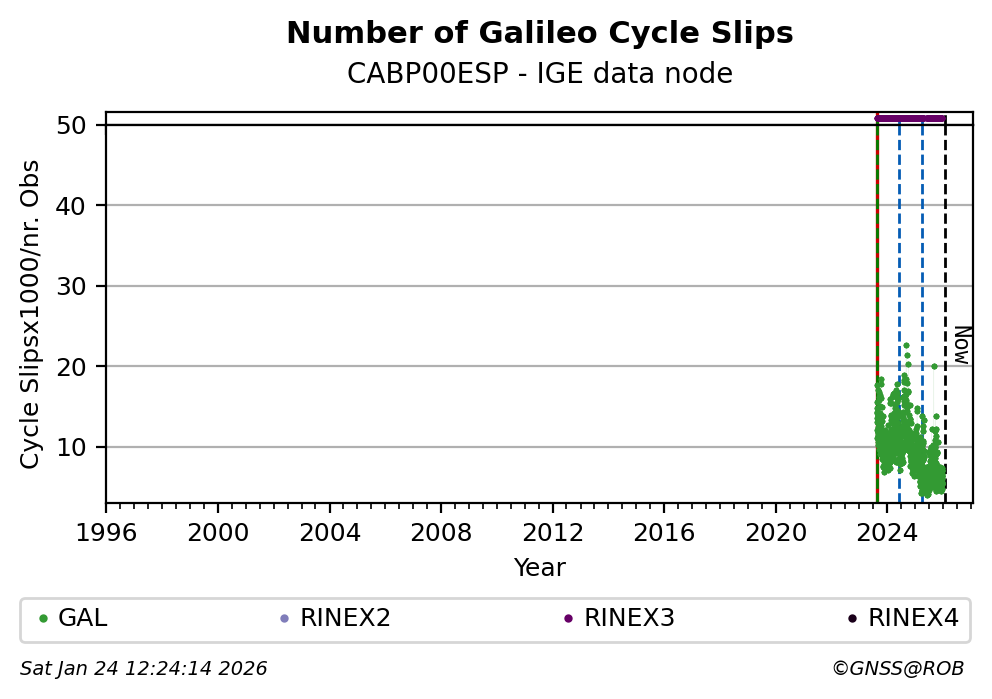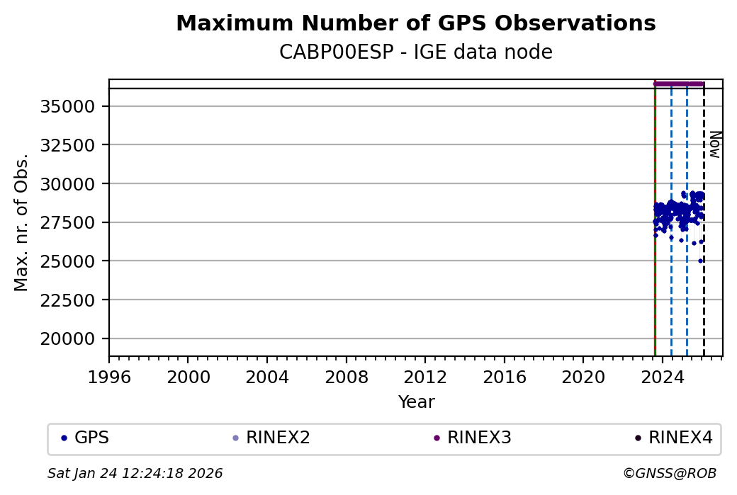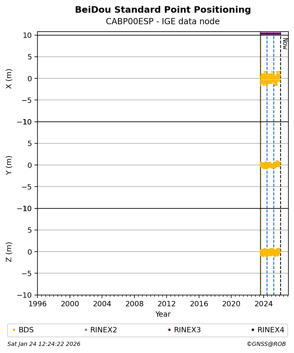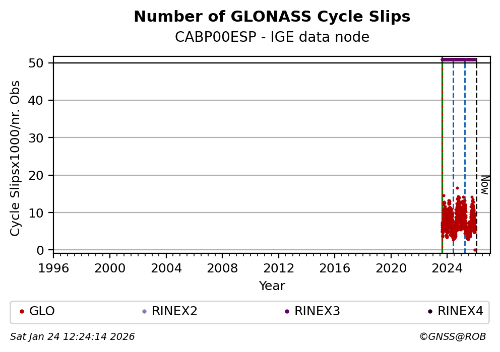 The plots below present the long-term tracking performance of the EPOS-GNSS station CABP00ESP based on the daily RINEX data available from the IGE EPOS-GNSS data node. The data quality metrics have been computed at the data node using the G-Nut/Anubis software.
