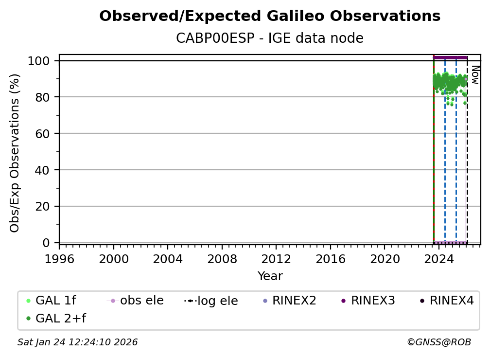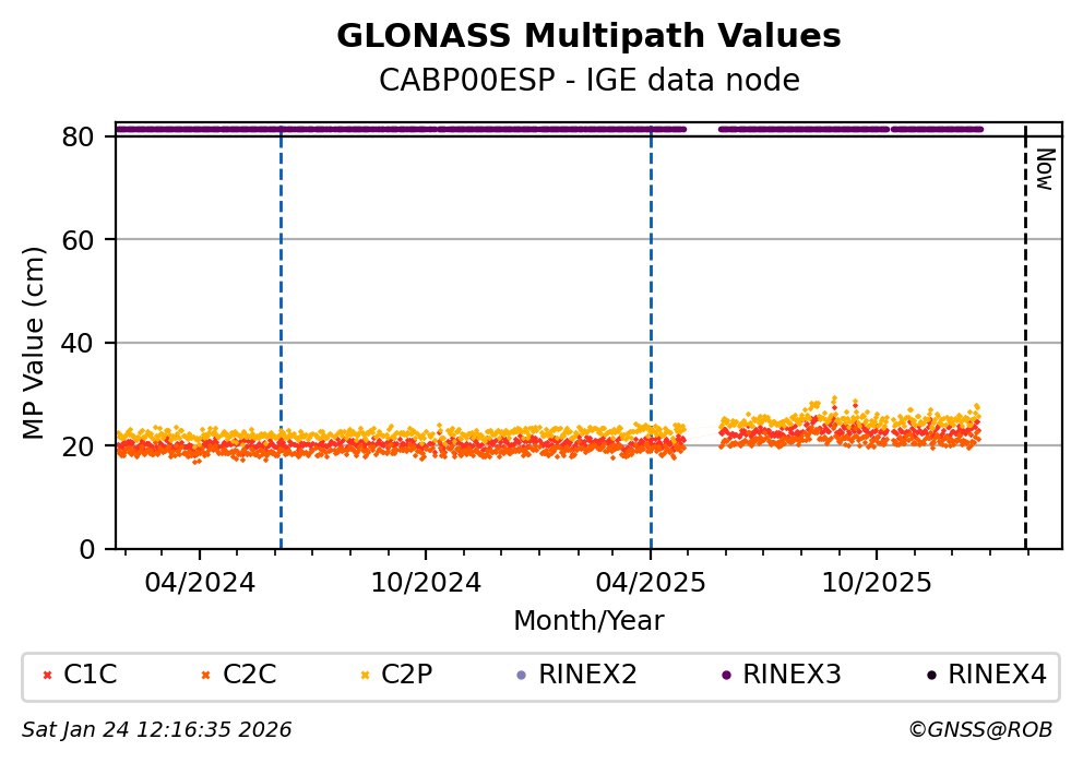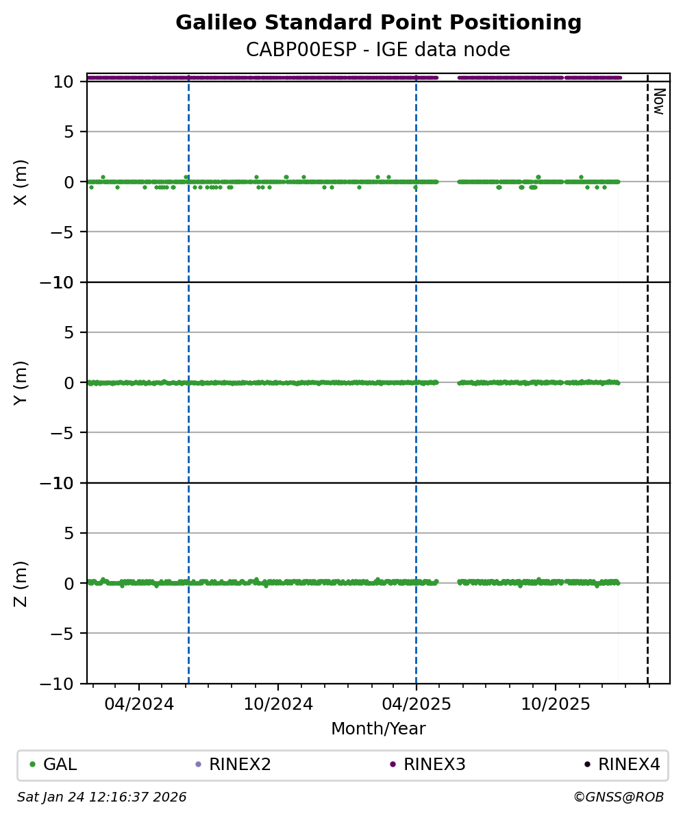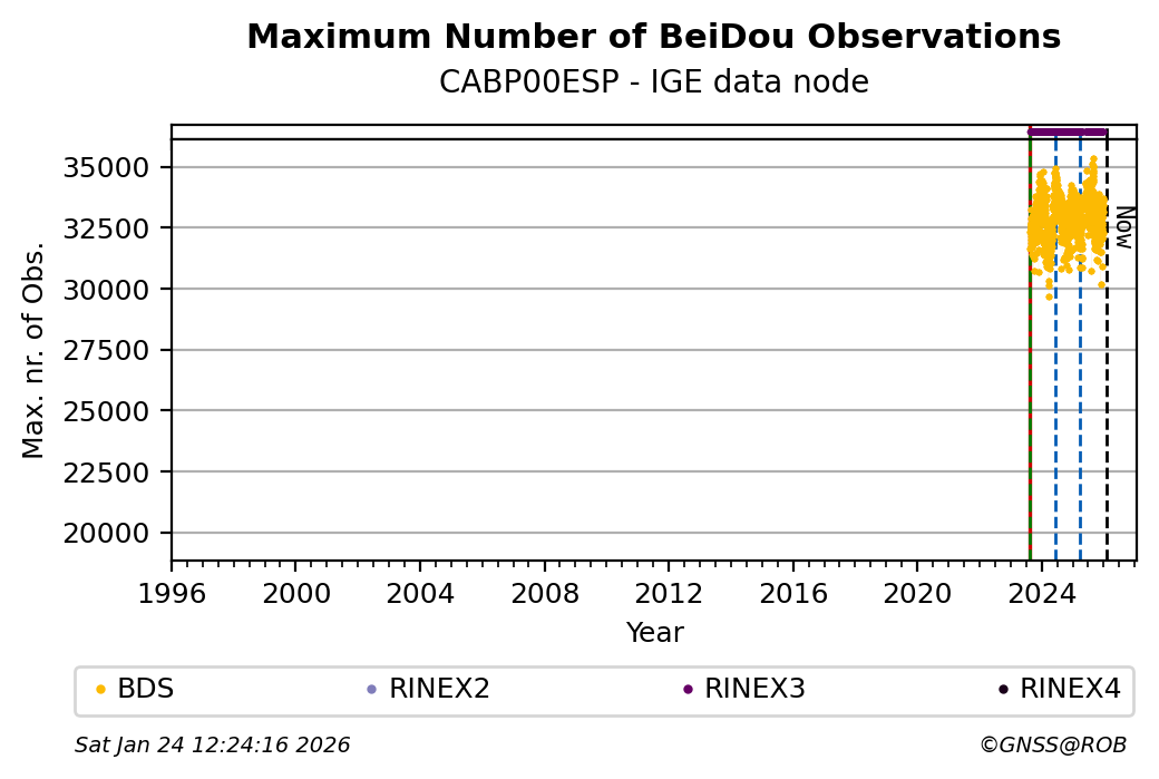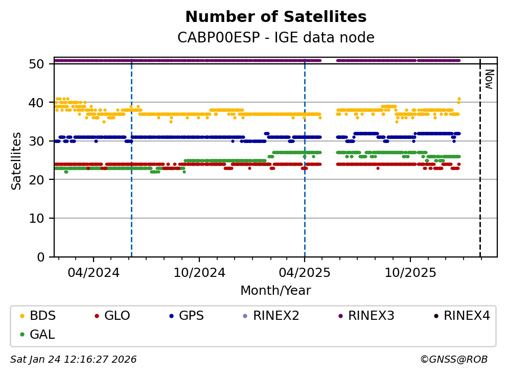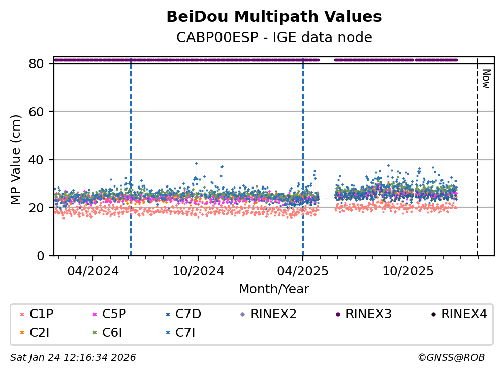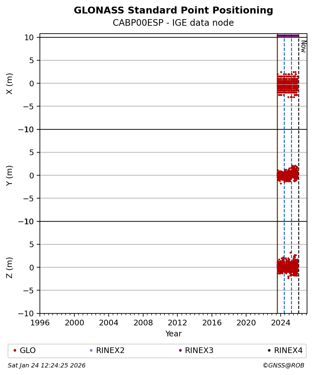 The plots below present the long-term tracking performance of the EPOS-GNSS station CABP00ESP based on the daily RINEX data available from the IGE EPOS-GNSS data node. The data quality metrics have been computed at the data node using the G-Nut/Anubis software.