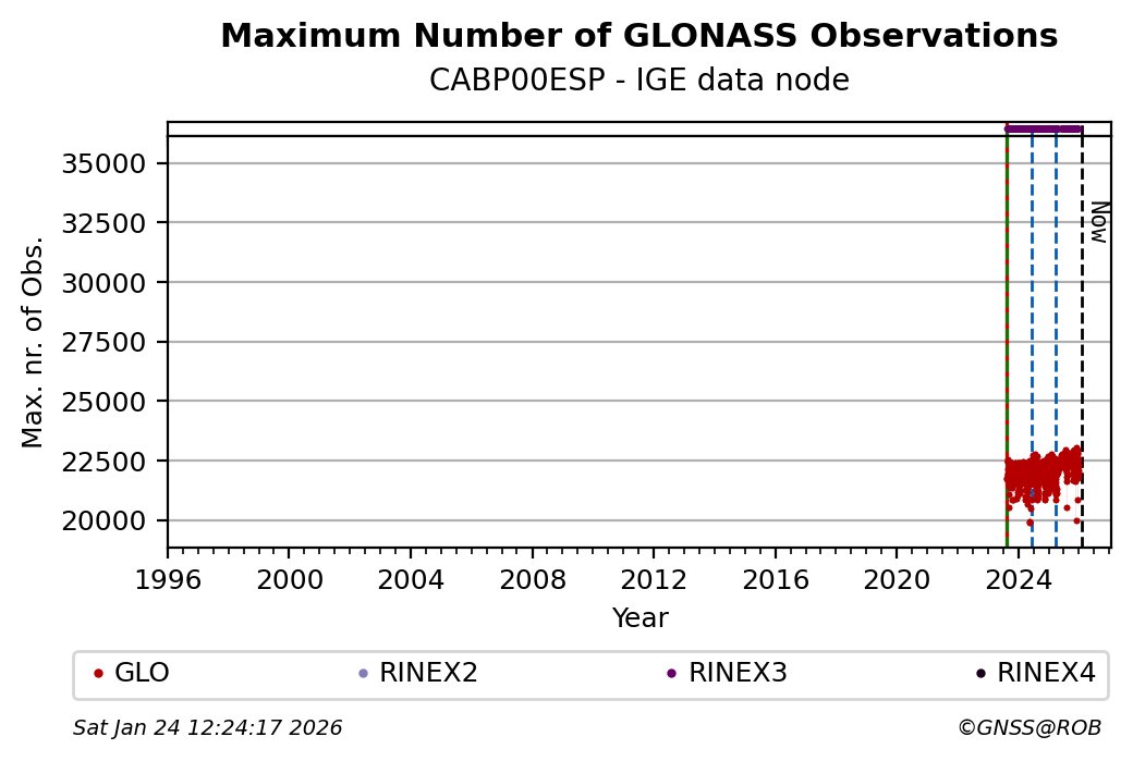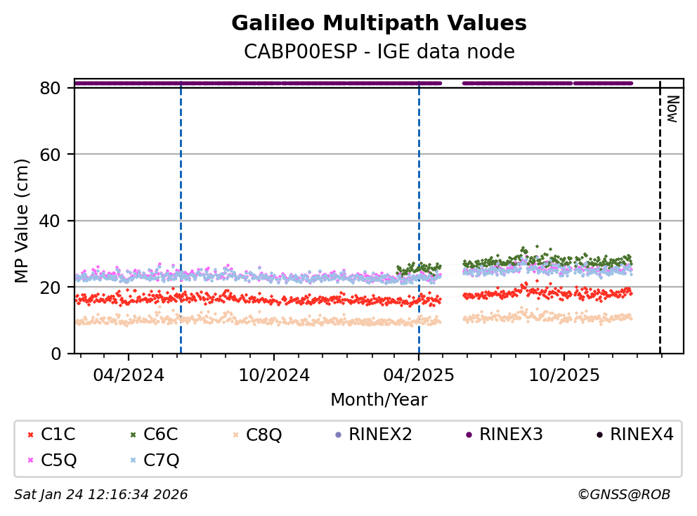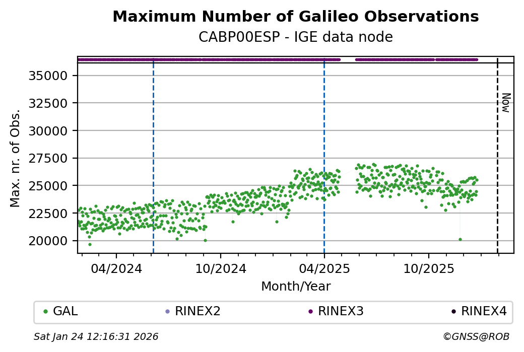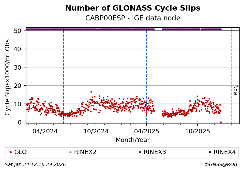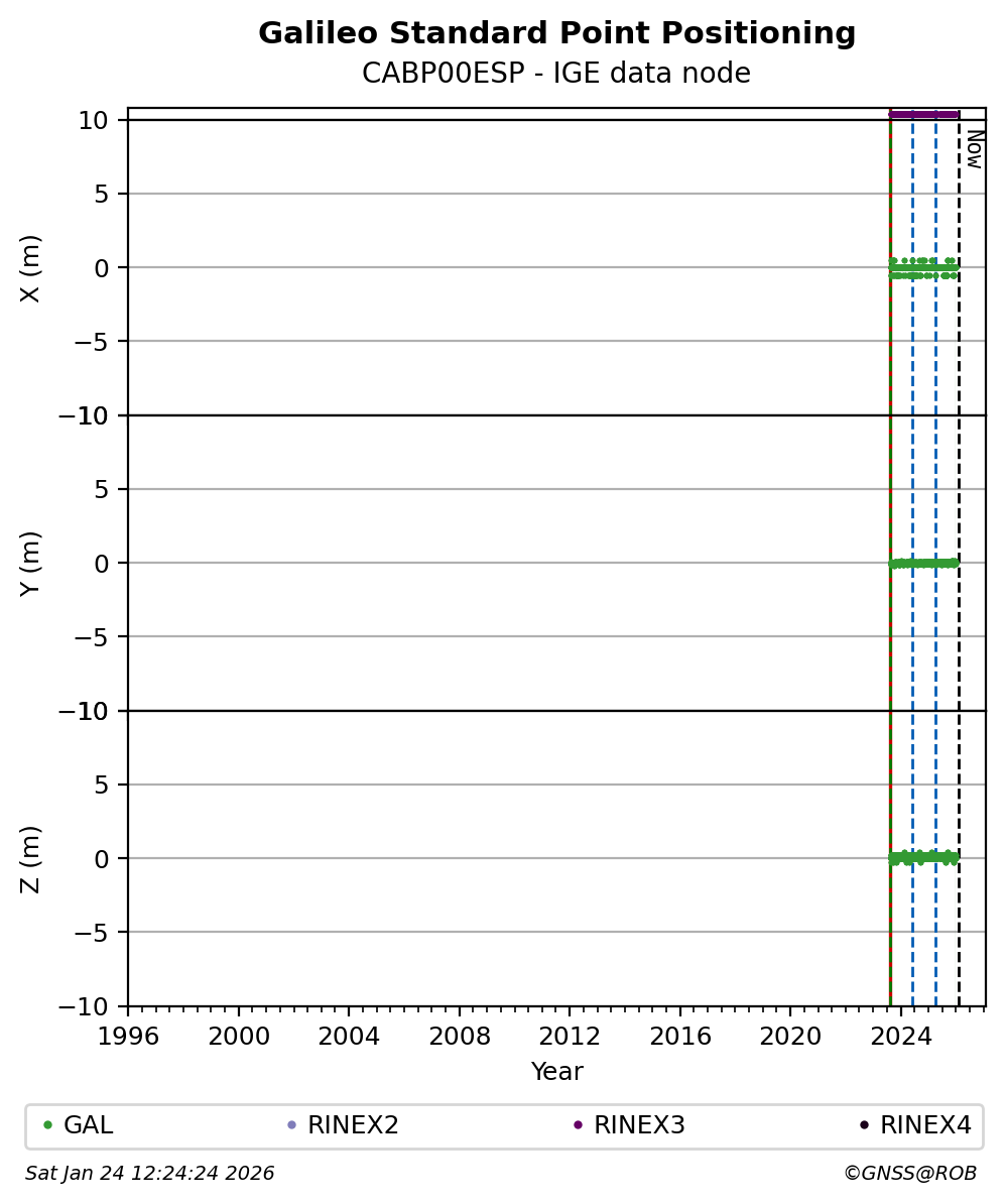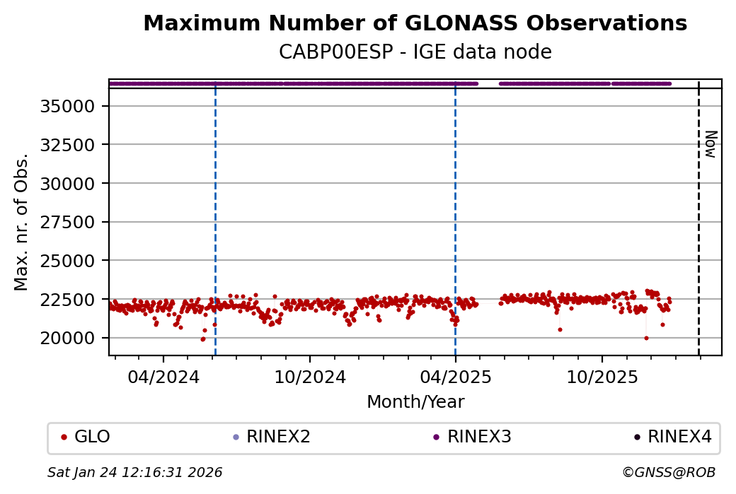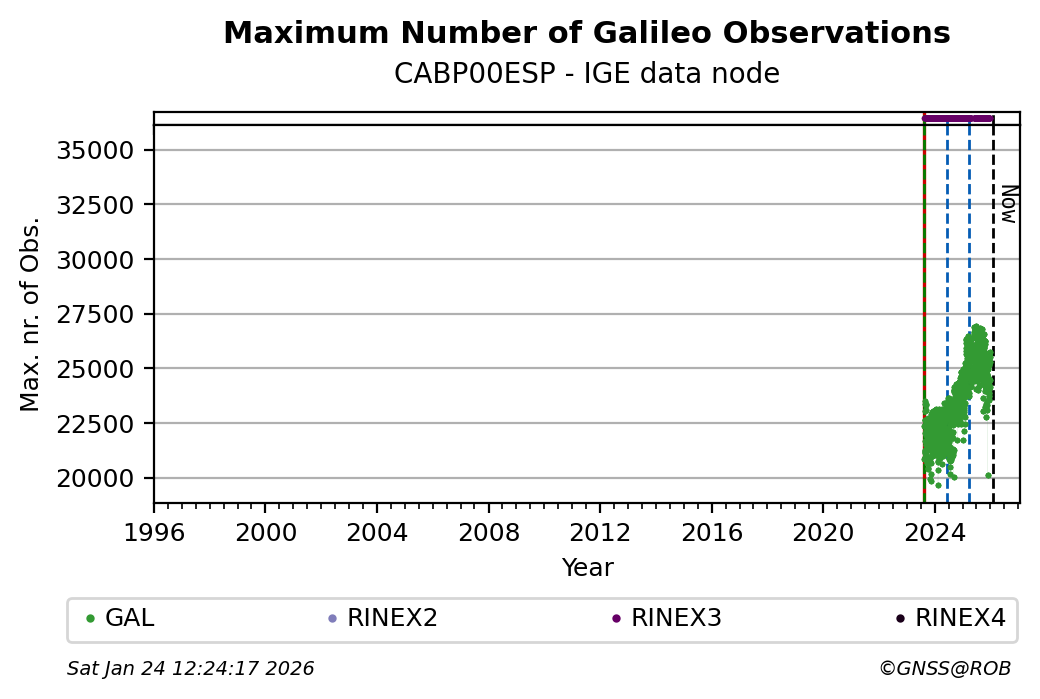 The plots below present the long-term tracking performance of the EPOS-GNSS station CABP00ESP based on the daily RINEX data available from the IGE EPOS-GNSS data node. The data quality metrics have been computed at the data node using the G-Nut/Anubis software.