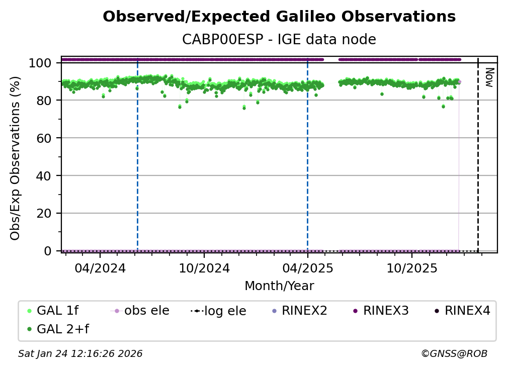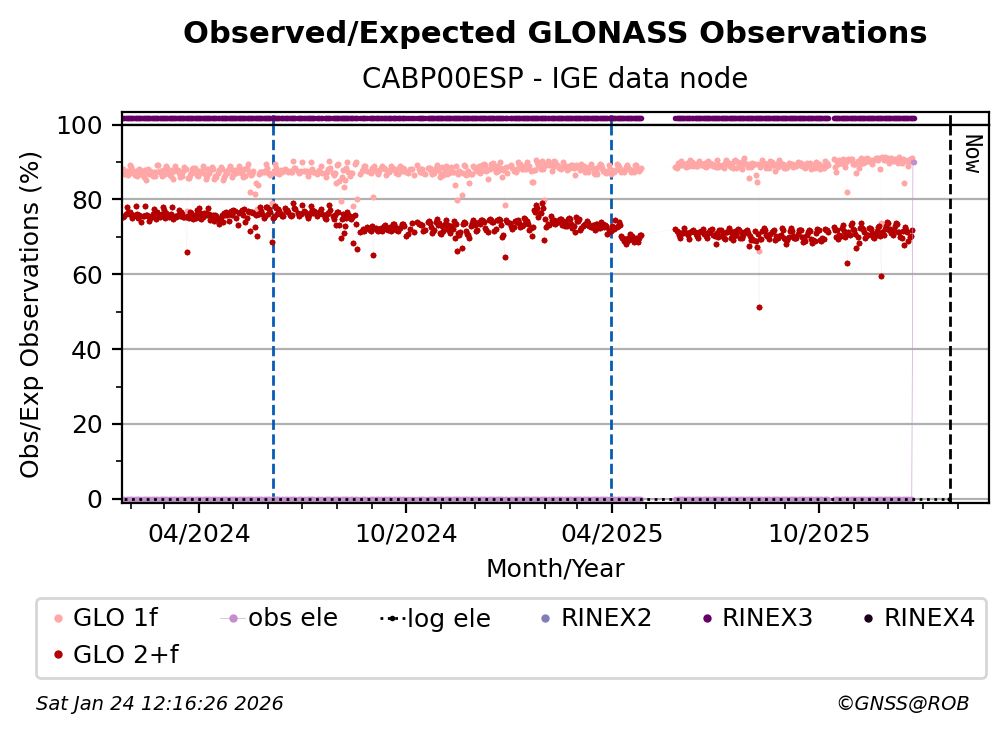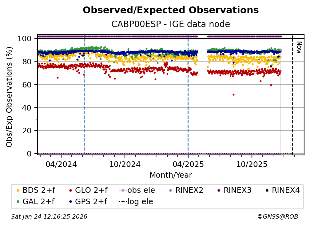 The percentage corresponds, for each constellation tracked by the station, to the ratio of the number of observations in the daily RINEX file with respect to the number of expected observations: