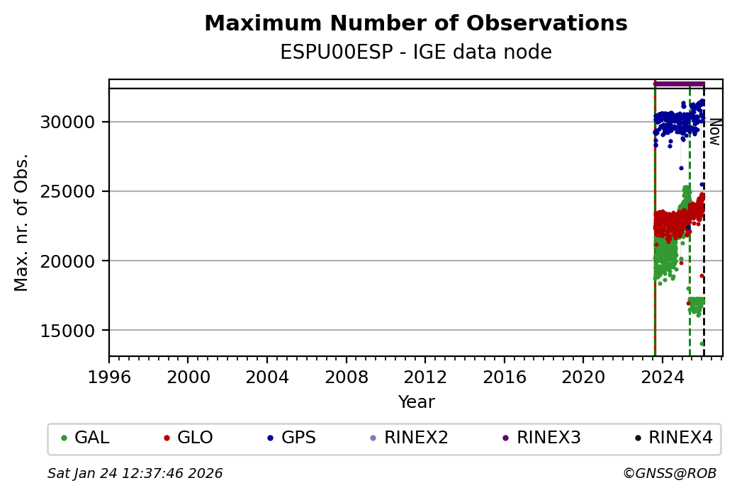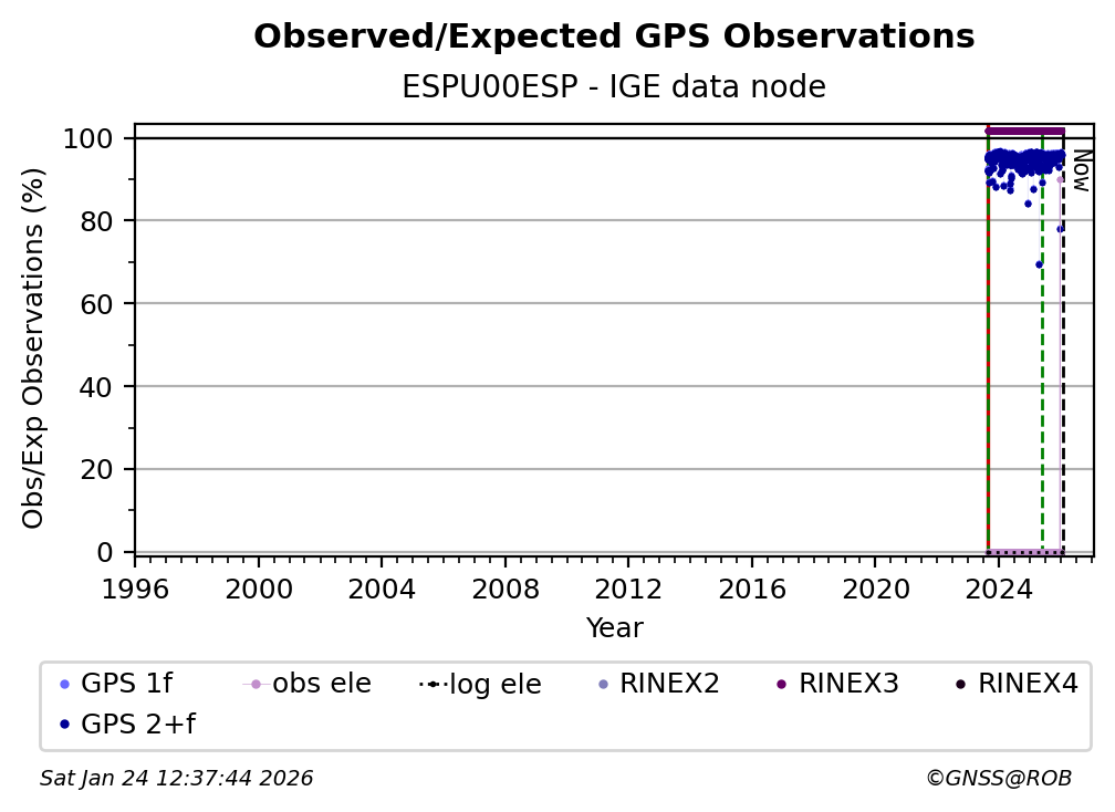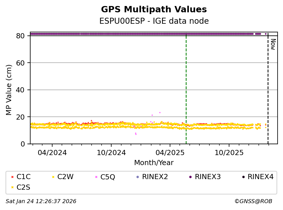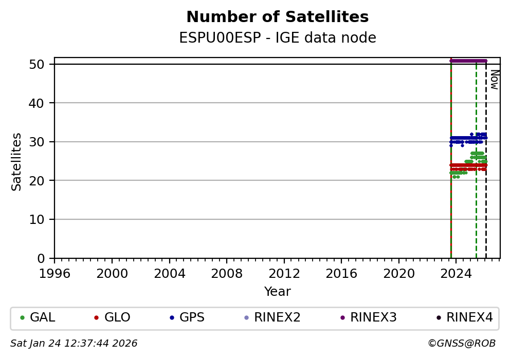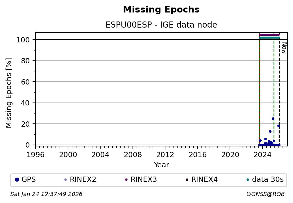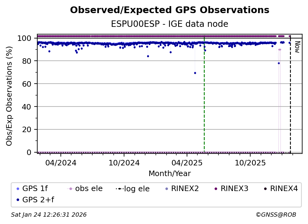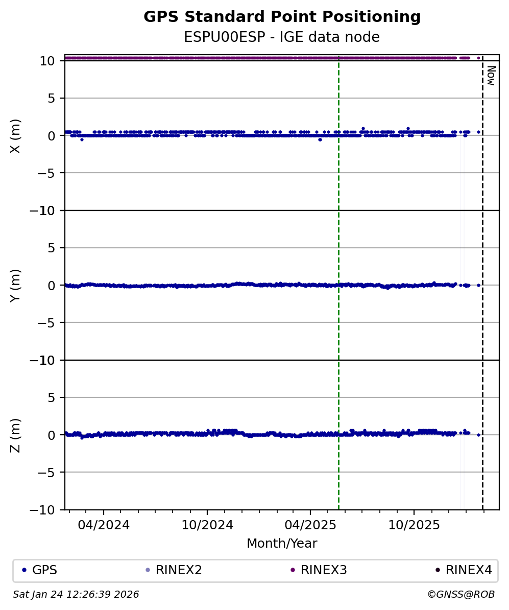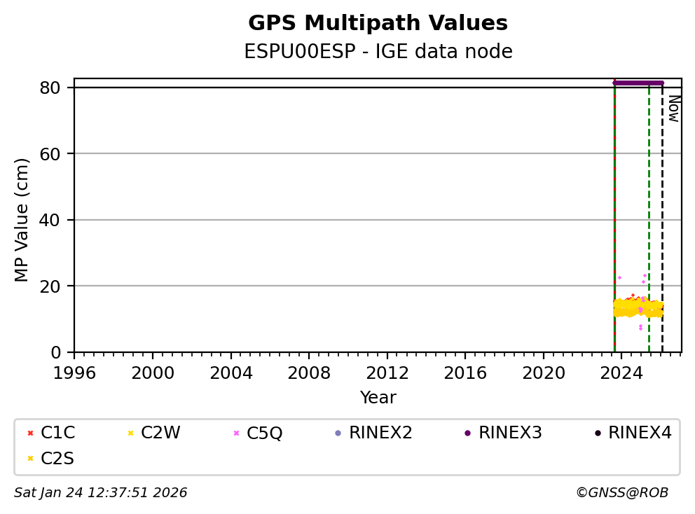 The plots below present the long-term tracking performance of the EPOS-GNSS station ESPU00ESP based on the daily RINEX data available from the IGE EPOS-GNSS data node. The data quality metrics have been computed at the data node using the G-Nut/Anubis software.