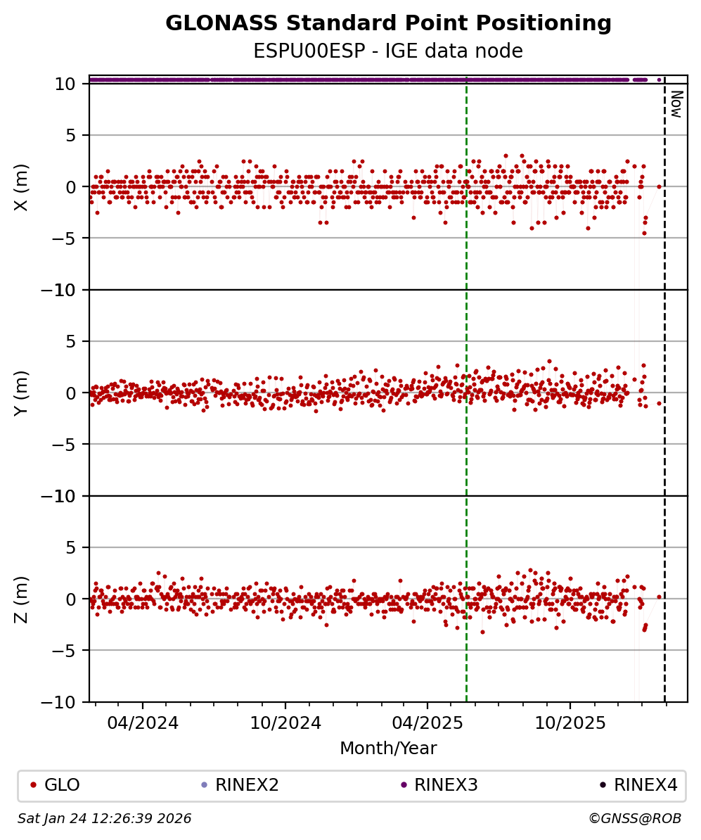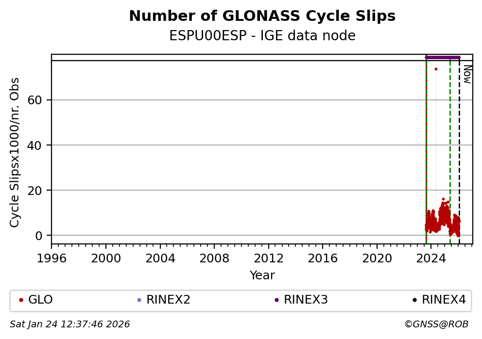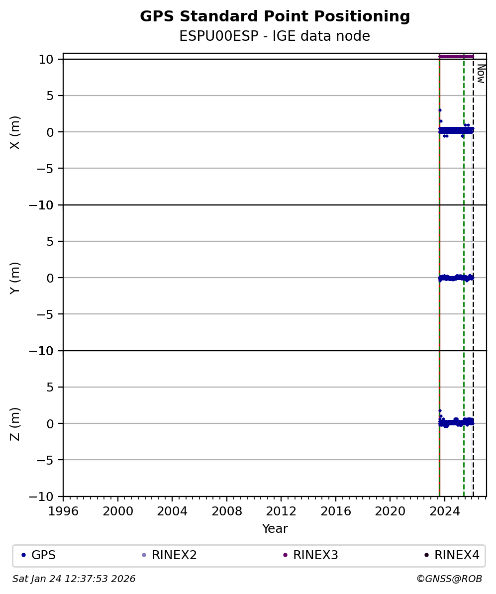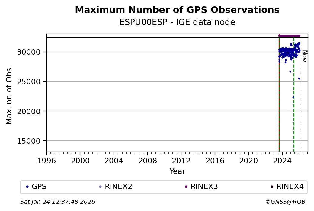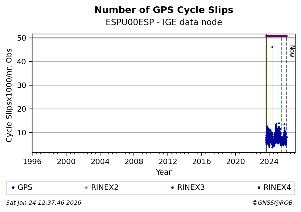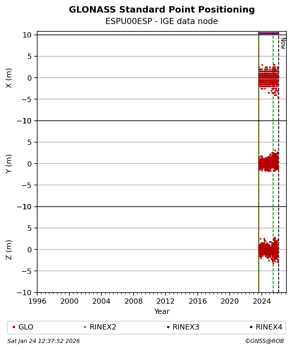 The plots below present the long-term tracking performance of the EPOS-GNSS station ESPU00ESP based on the daily RINEX data available from the IGE EPOS-GNSS data node. The data quality metrics have been computed at the data node using the G-Nut/Anubis software.