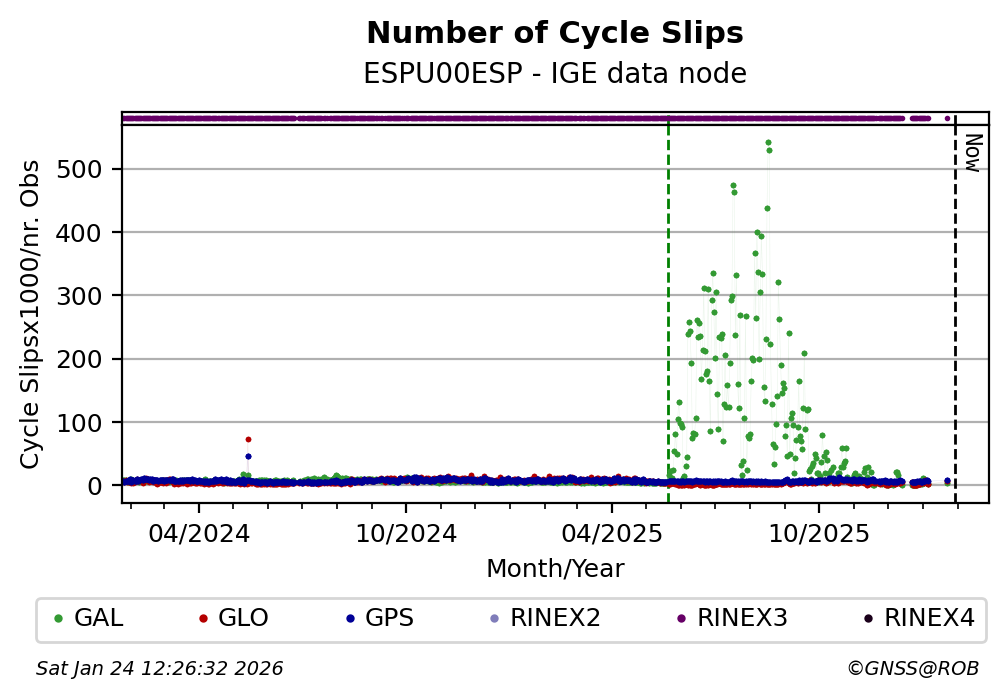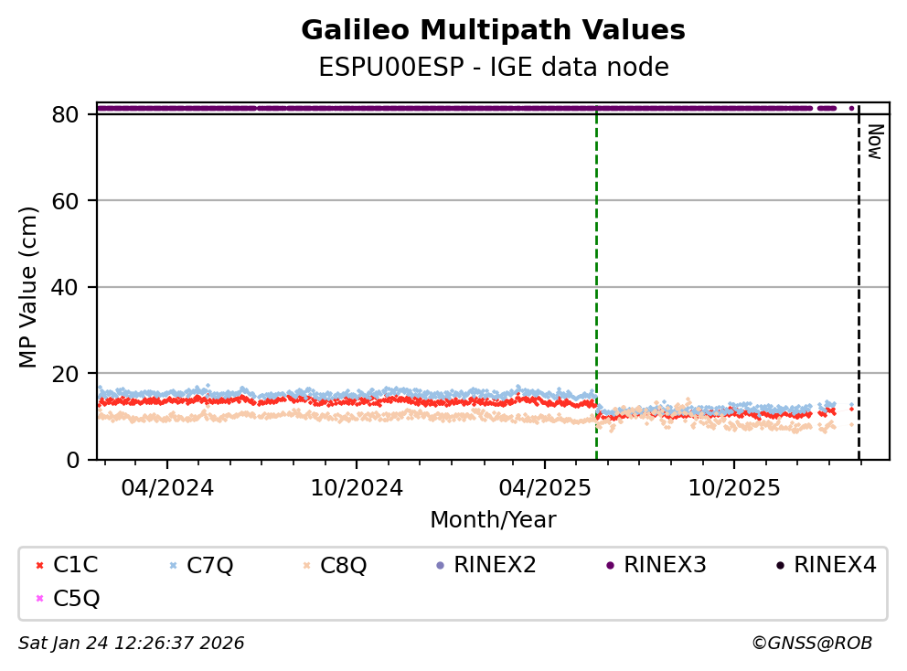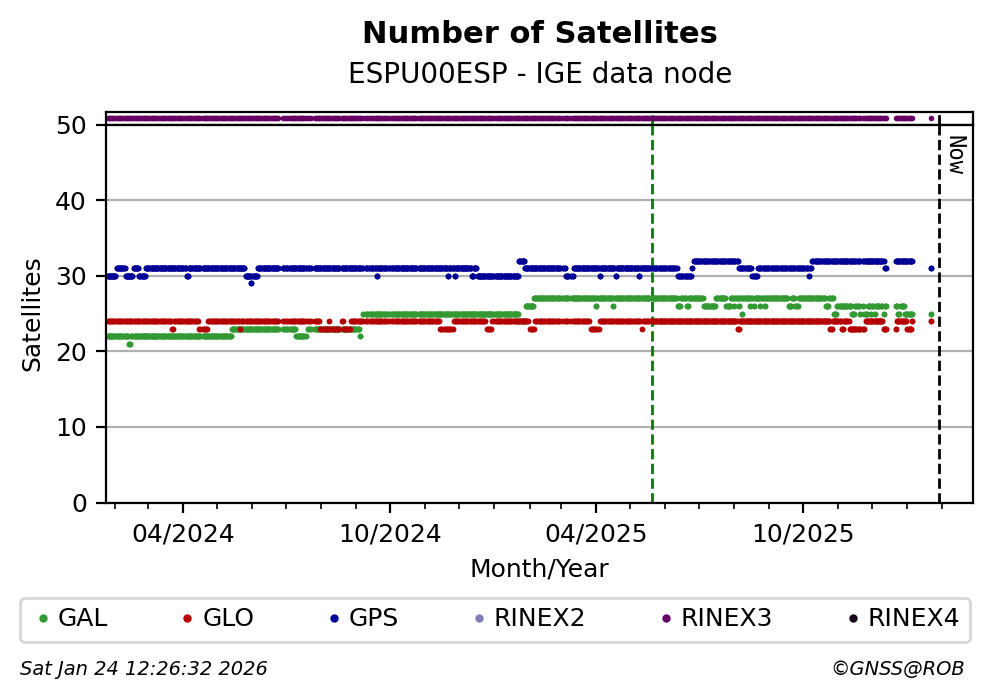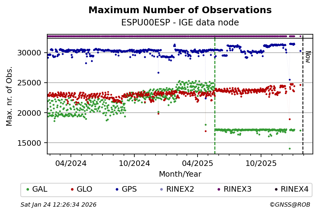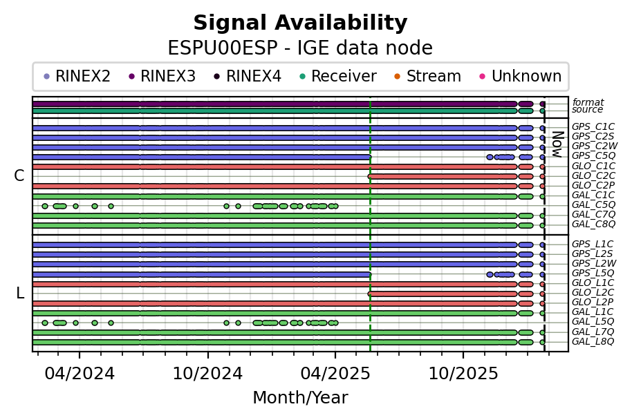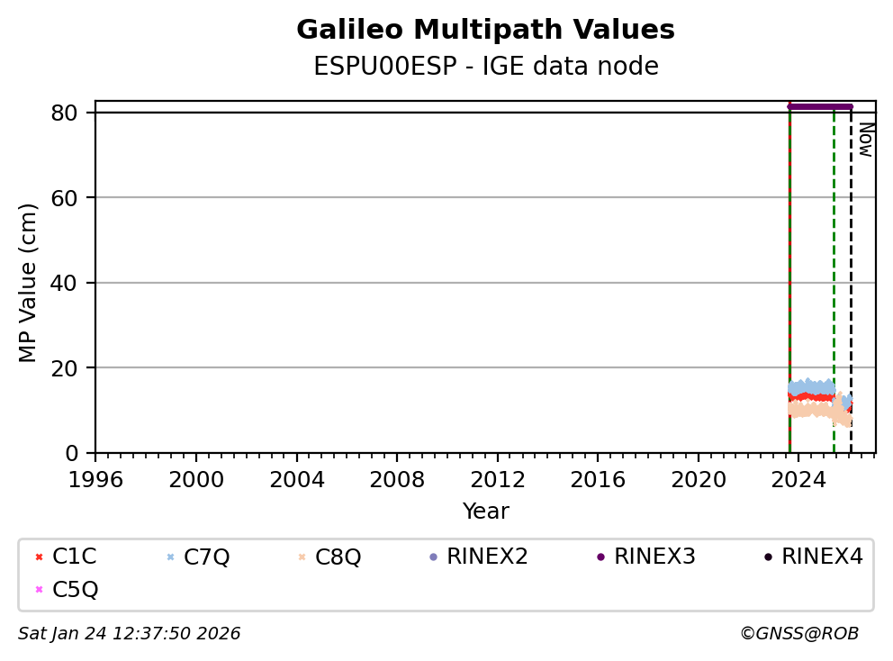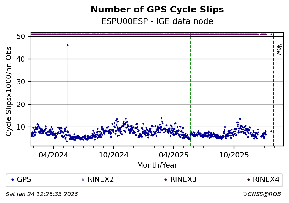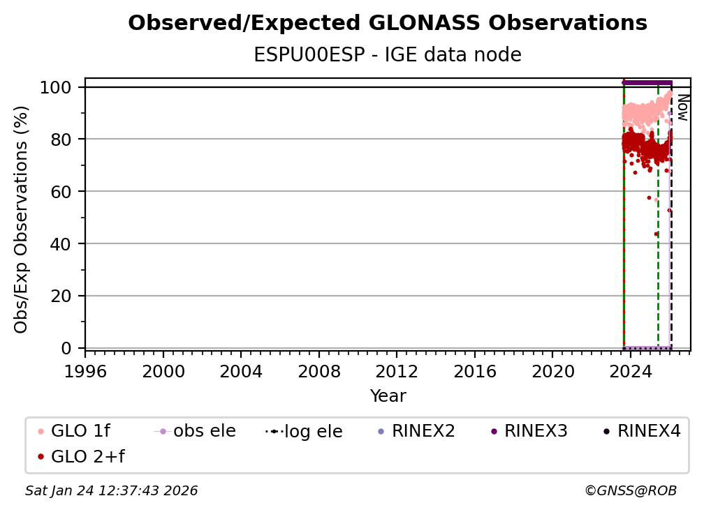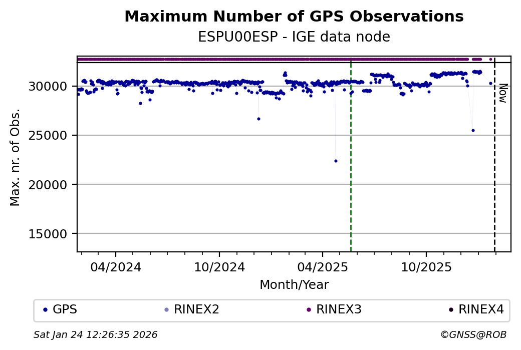 The plots below present the long-term tracking performance of the EPOS-GNSS station ESPU00ESP based on the daily RINEX data available from the IGE EPOS-GNSS data node. The data quality metrics have been computed at the data node using the G-Nut/Anubis software.