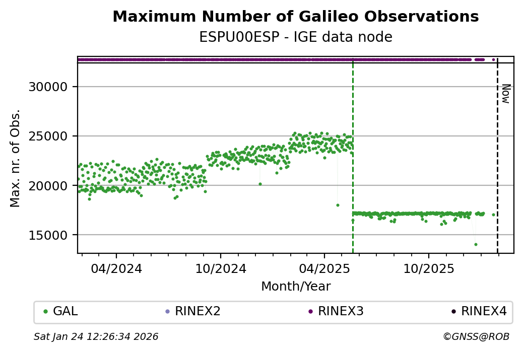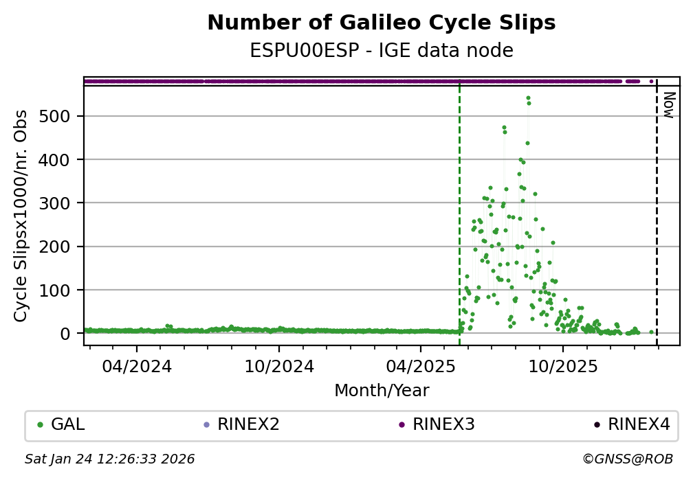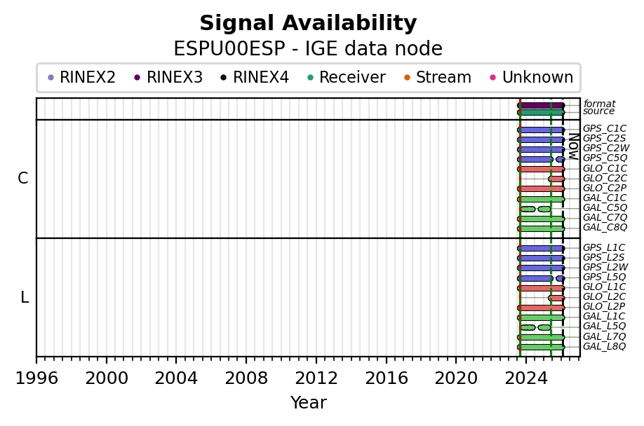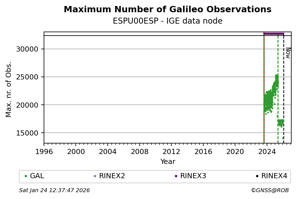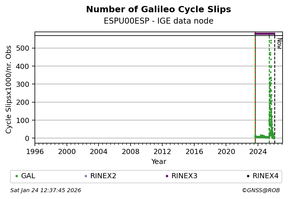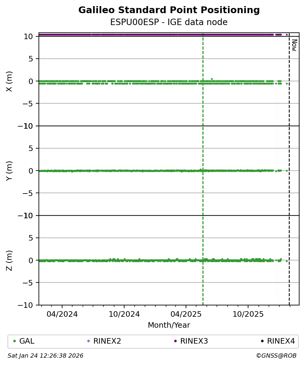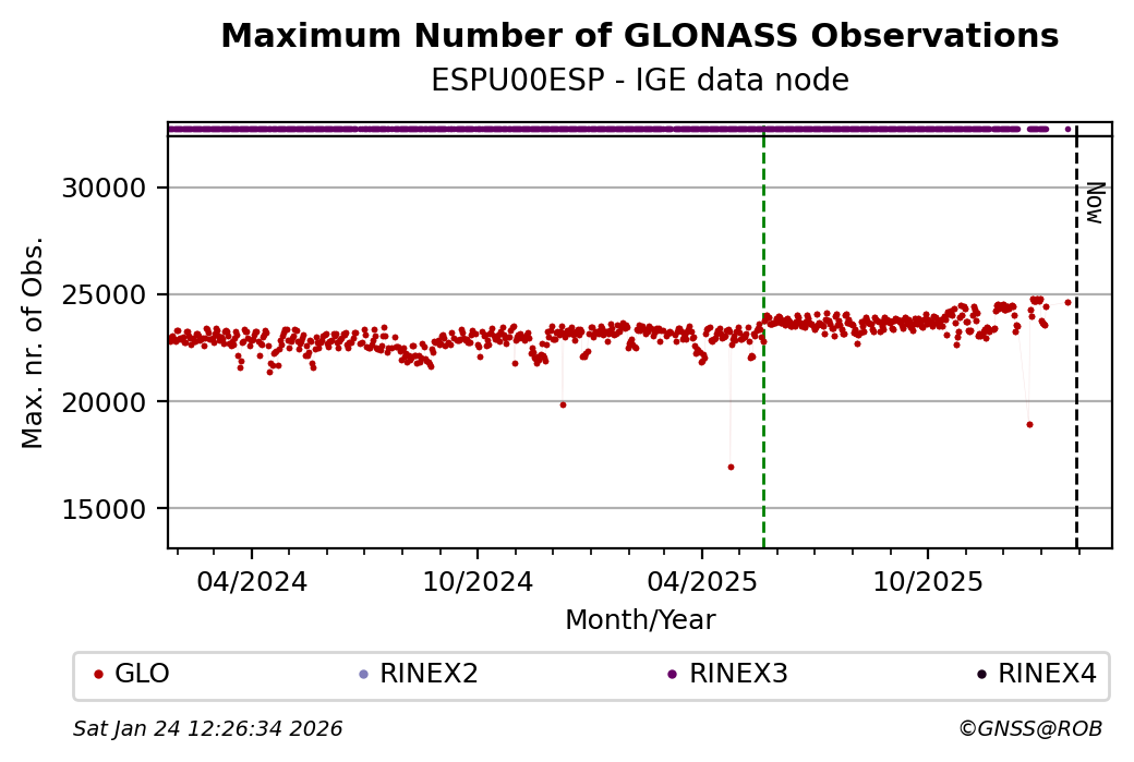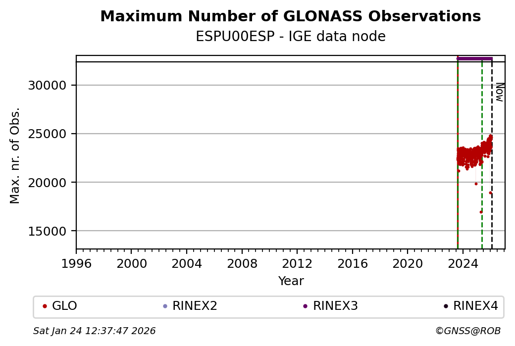 The plots below present the long-term tracking performance of the EPOS-GNSS station ESPU00ESP based on the daily RINEX data available from the IGE EPOS-GNSS data node. The data quality metrics have been computed at the data node using the G-Nut/Anubis software.