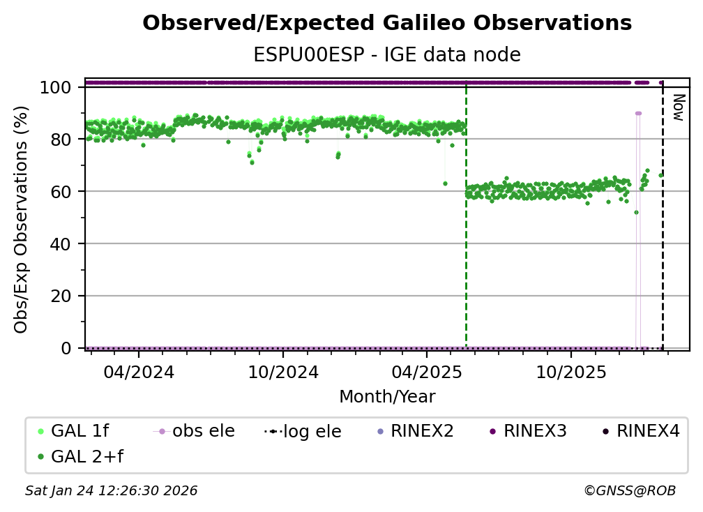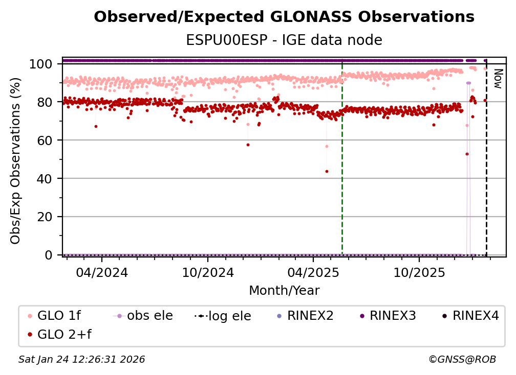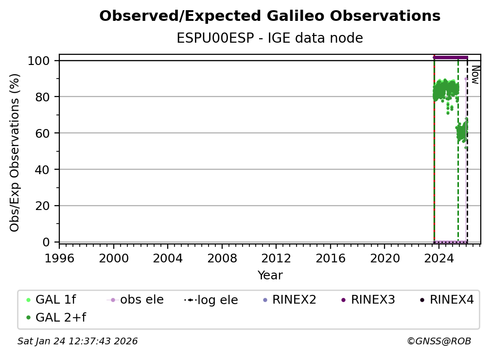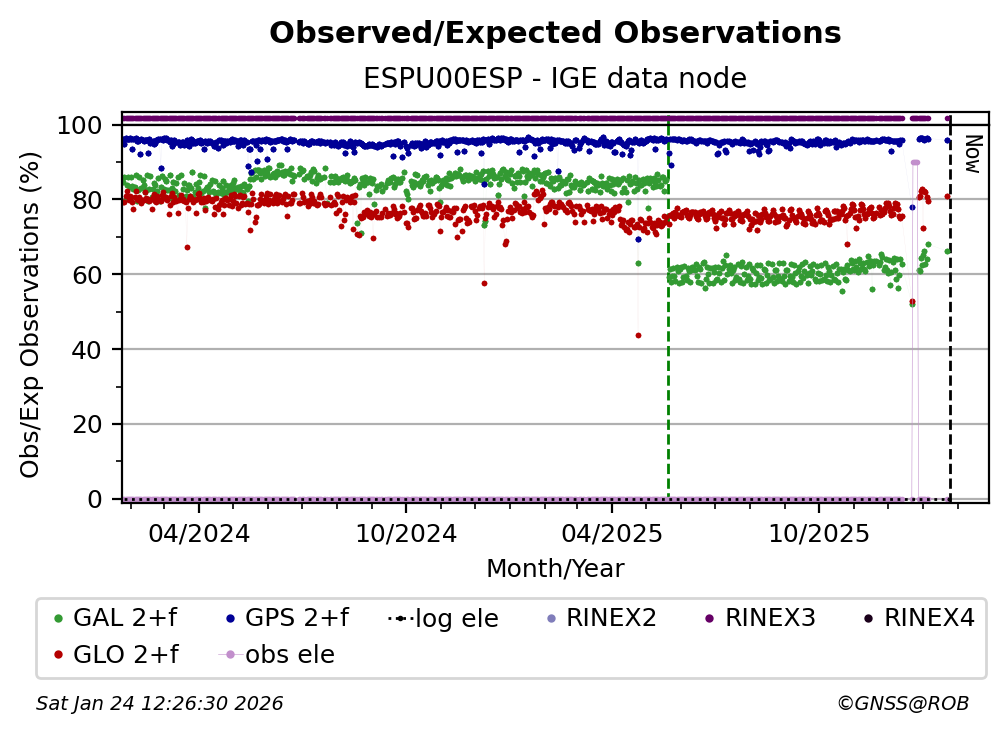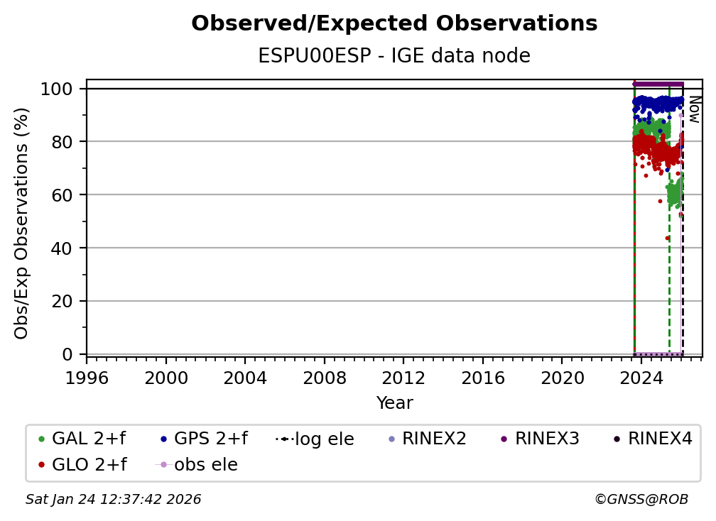 The percentage corresponds, for each constellation tracked by the station, to the ratio of the number of observations in the daily RINEX file with respect to the number of expected observations: