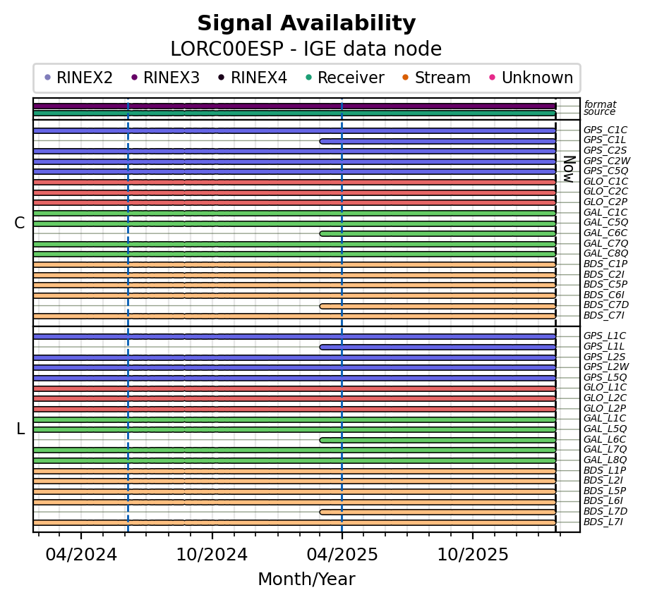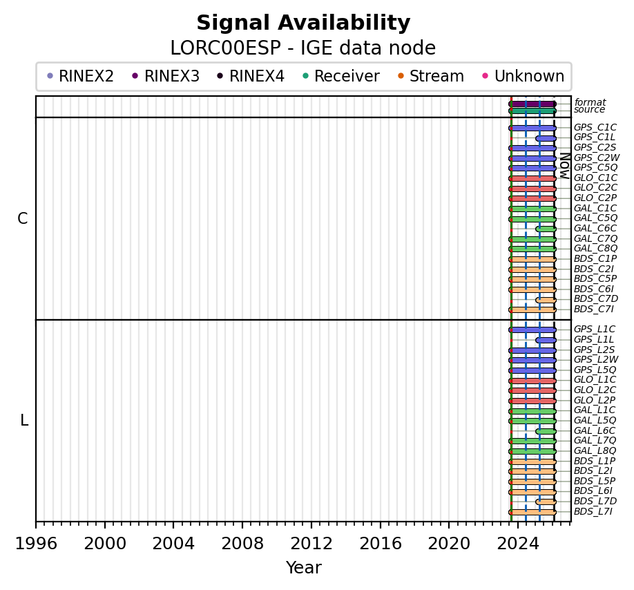 Red vertical lines, green and blue vertical dotted lines indicate respectively a change of antenna, receiver or receiver configuration (including firmware) as indicated by the station manager in the station site log available from the M3G GNSS Metadata Catalog. The purple points in the top of the plot indicate the daily RINEX data availability at the data node.