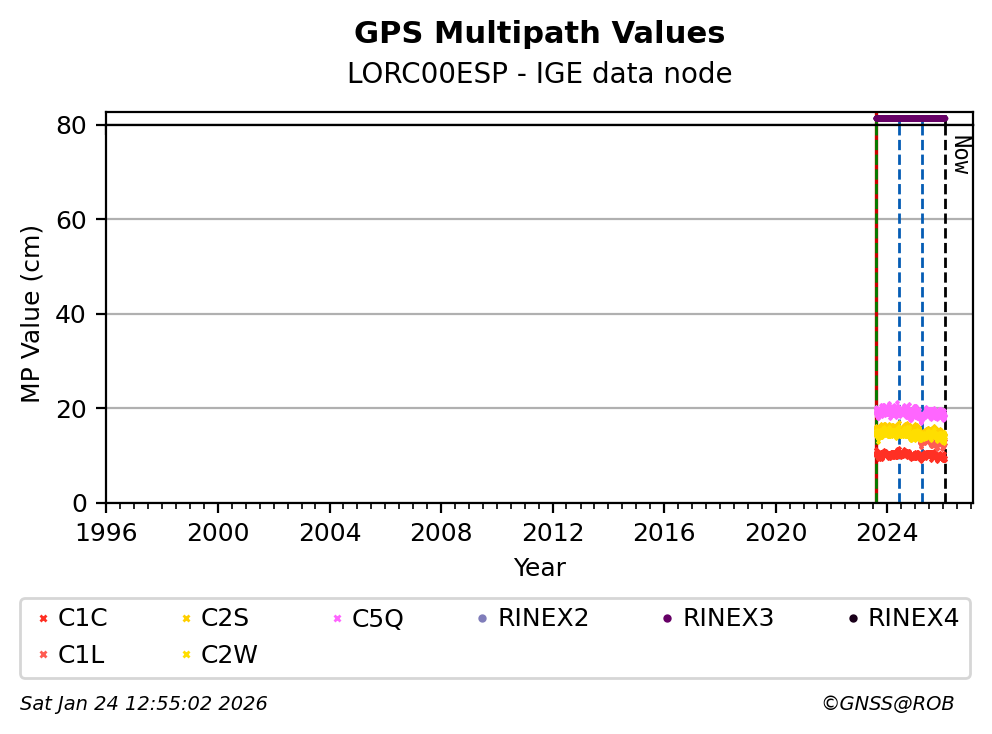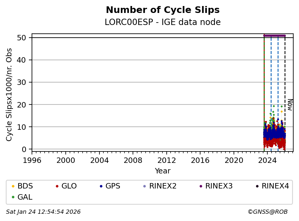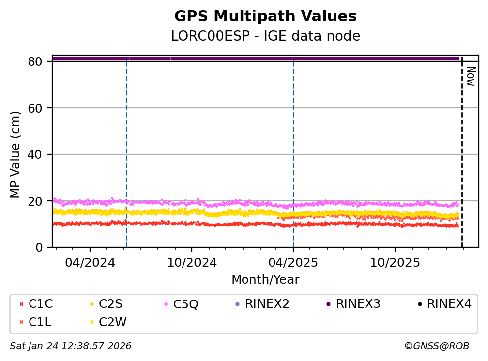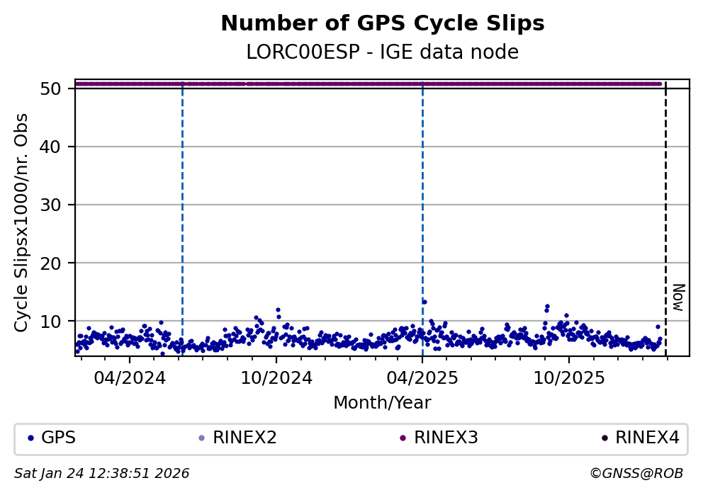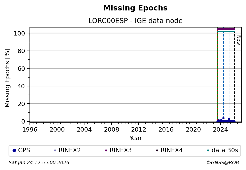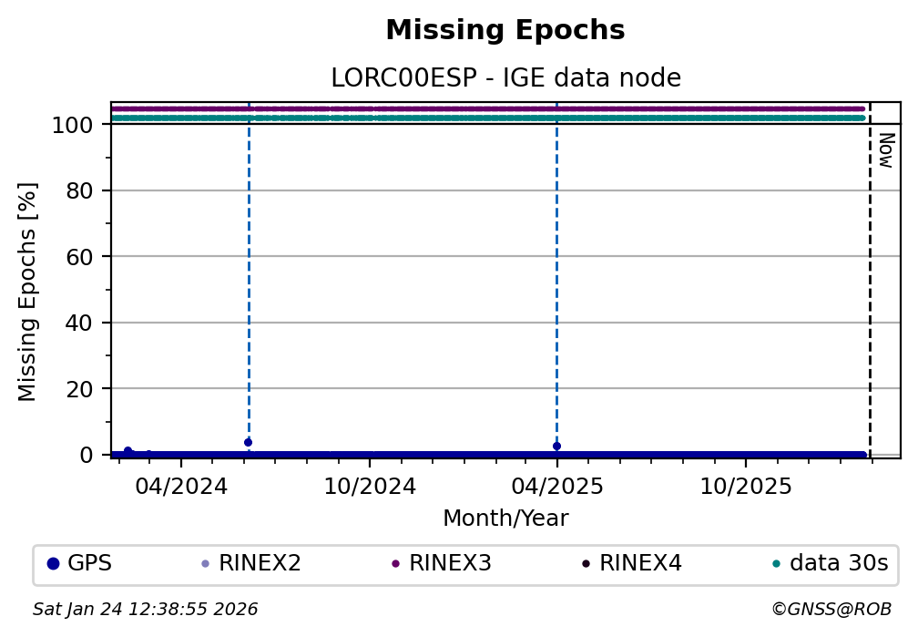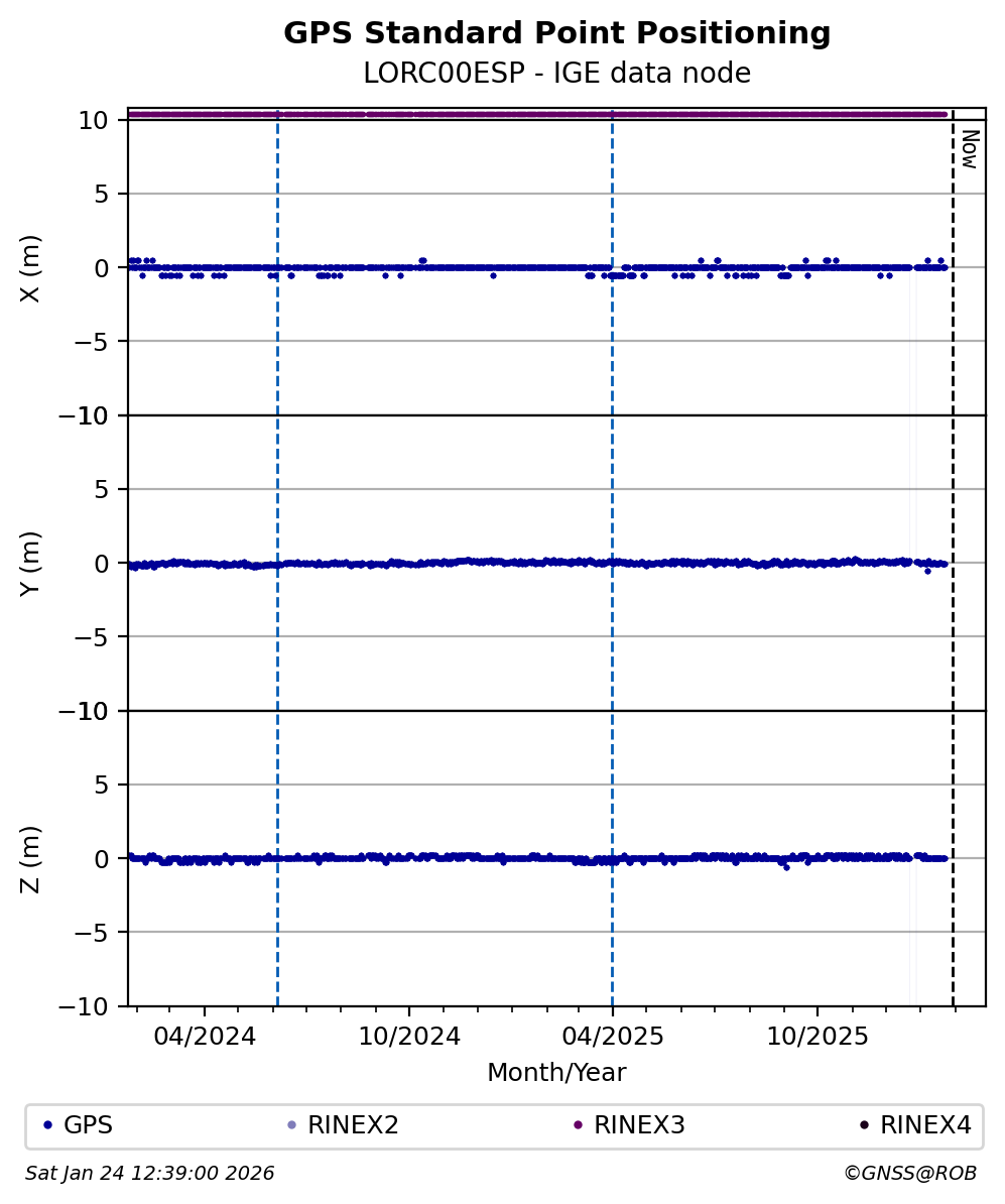 The plots below present the long-term tracking performance of the EPOS-GNSS station LORC00ESP based on the daily RINEX data available from the IGE EPOS-GNSS data node. The data quality metrics have been computed at the data node using the G-Nut/Anubis software.