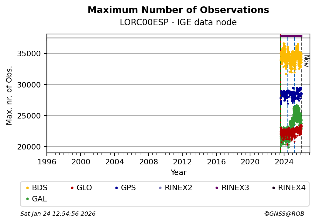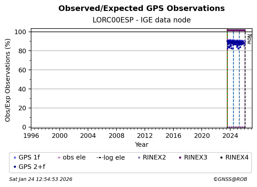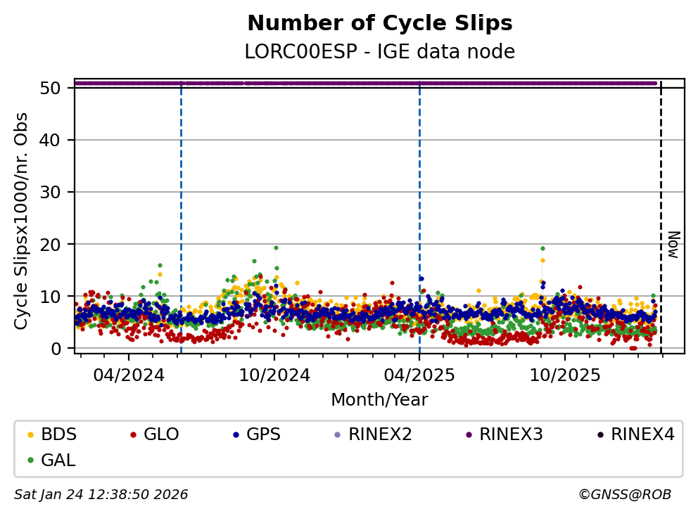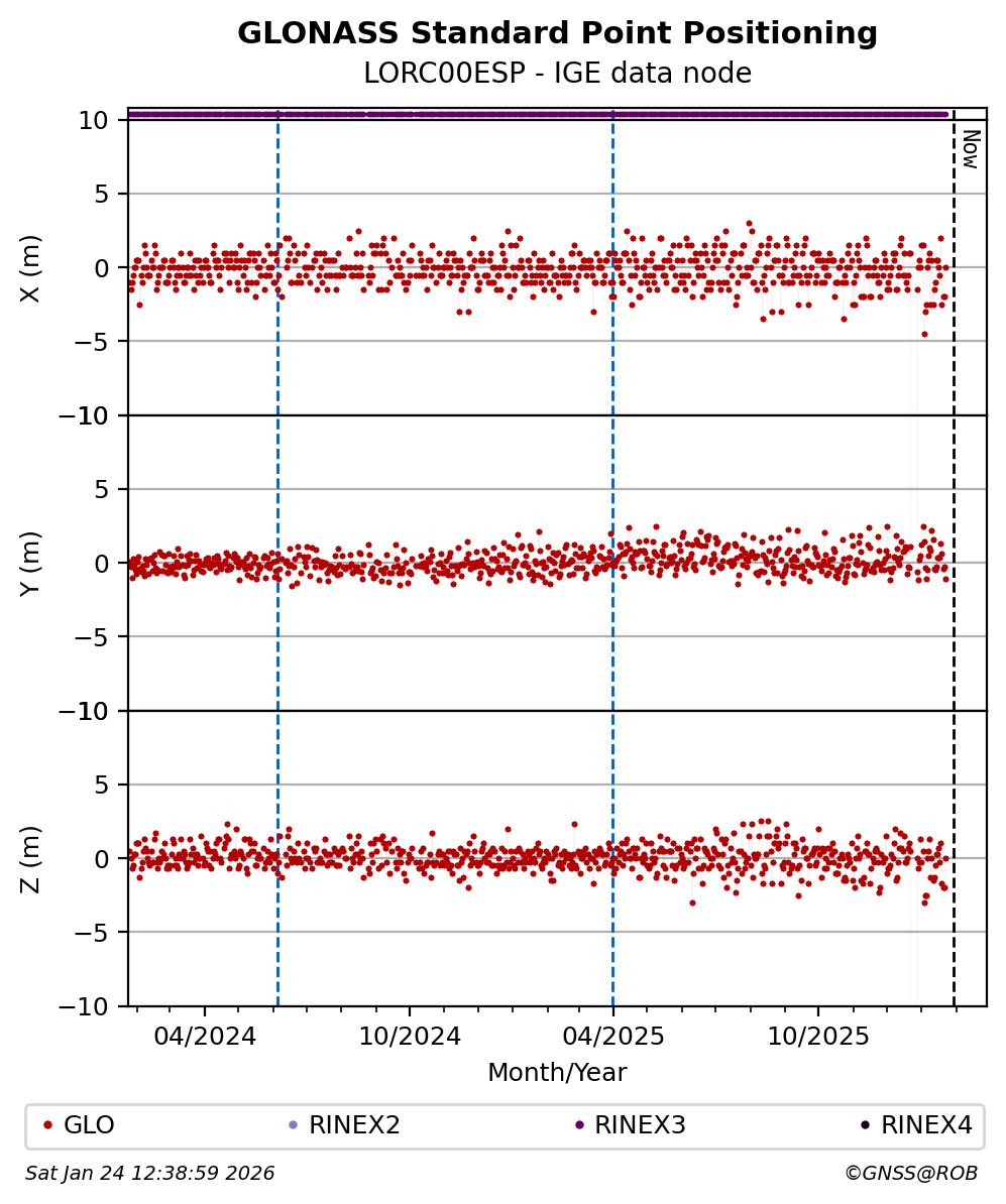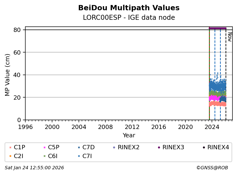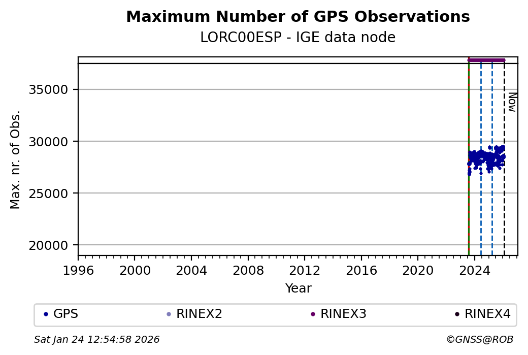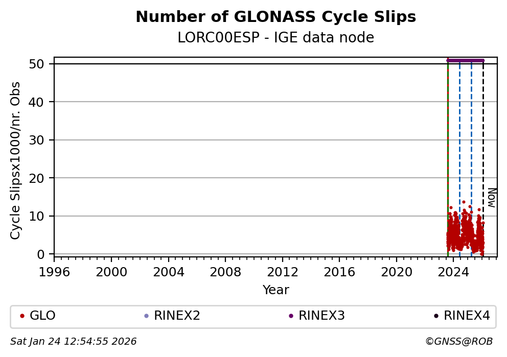 The plots below present the long-term tracking performance of the EPOS-GNSS station LORC00ESP based on the daily RINEX data available from the IGE EPOS-GNSS data node. The data quality metrics have been computed at the data node using the G-Nut/Anubis software.