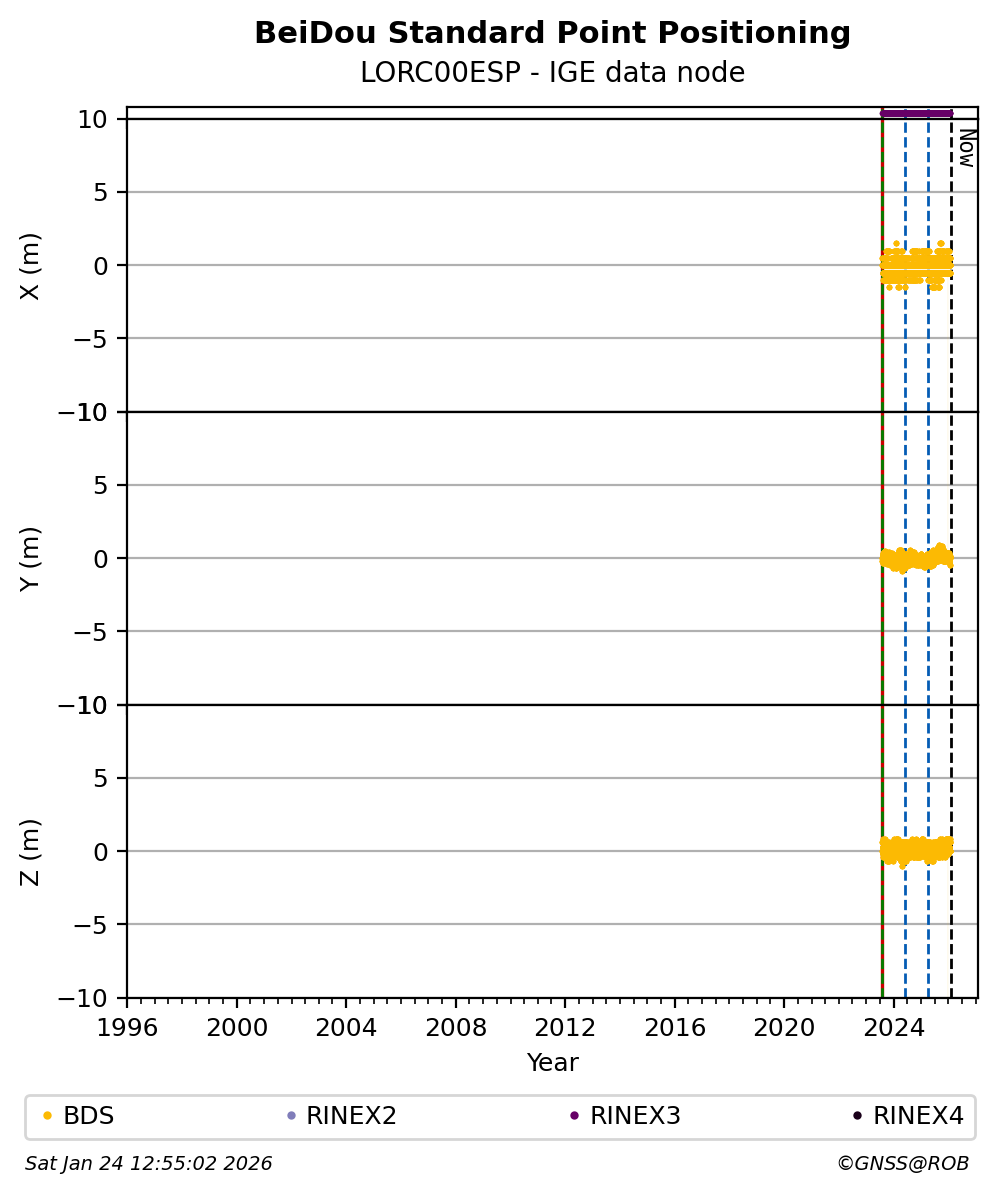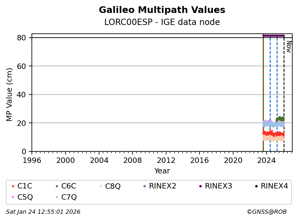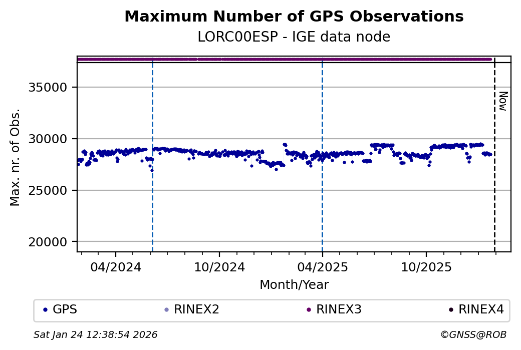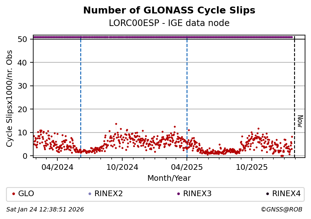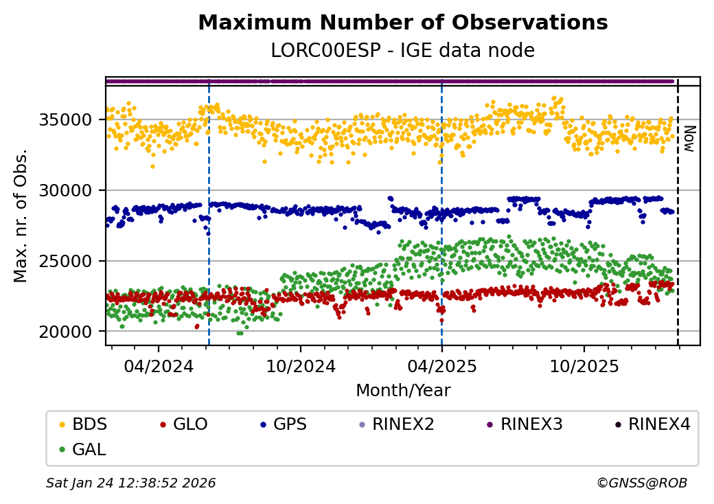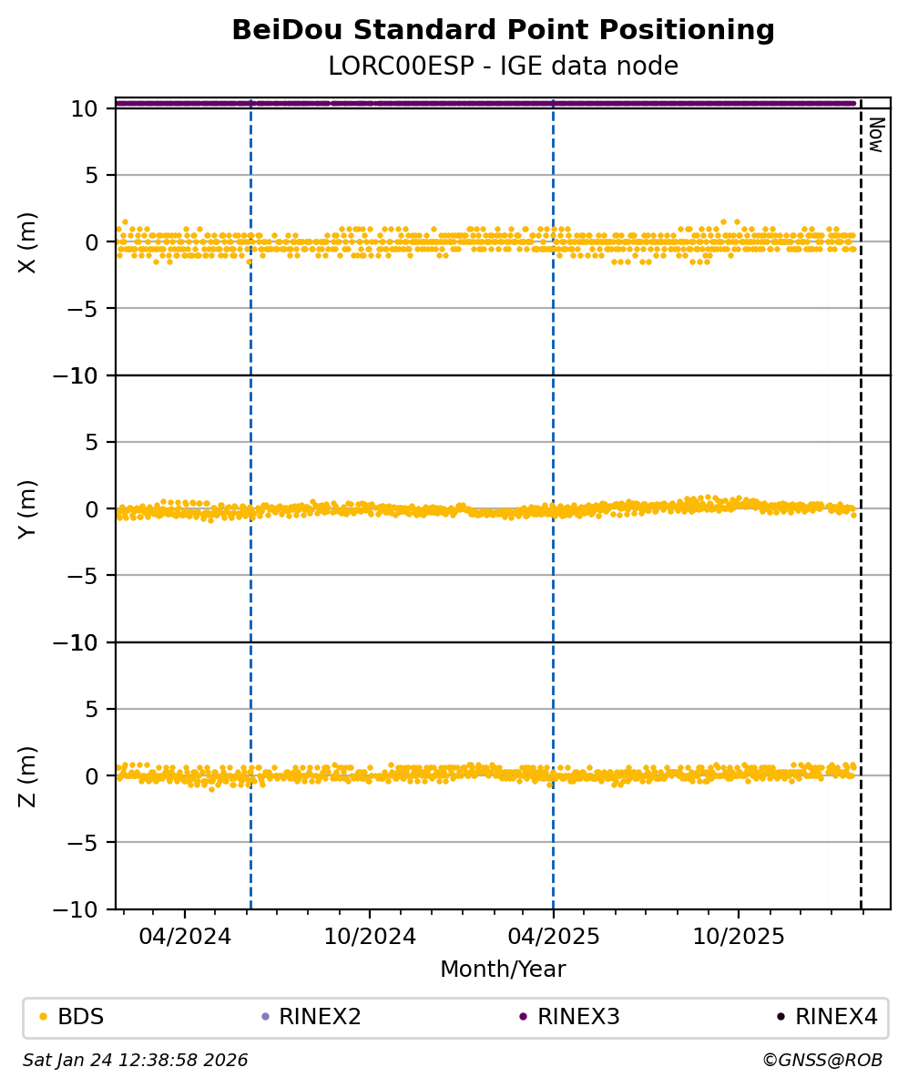 The plots below present the long-term tracking performance of the EPOS-GNSS station LORC00ESP based on the daily RINEX data available from the IGE EPOS-GNSS data node. The data quality metrics have been computed at the data node using the G-Nut/Anubis software.