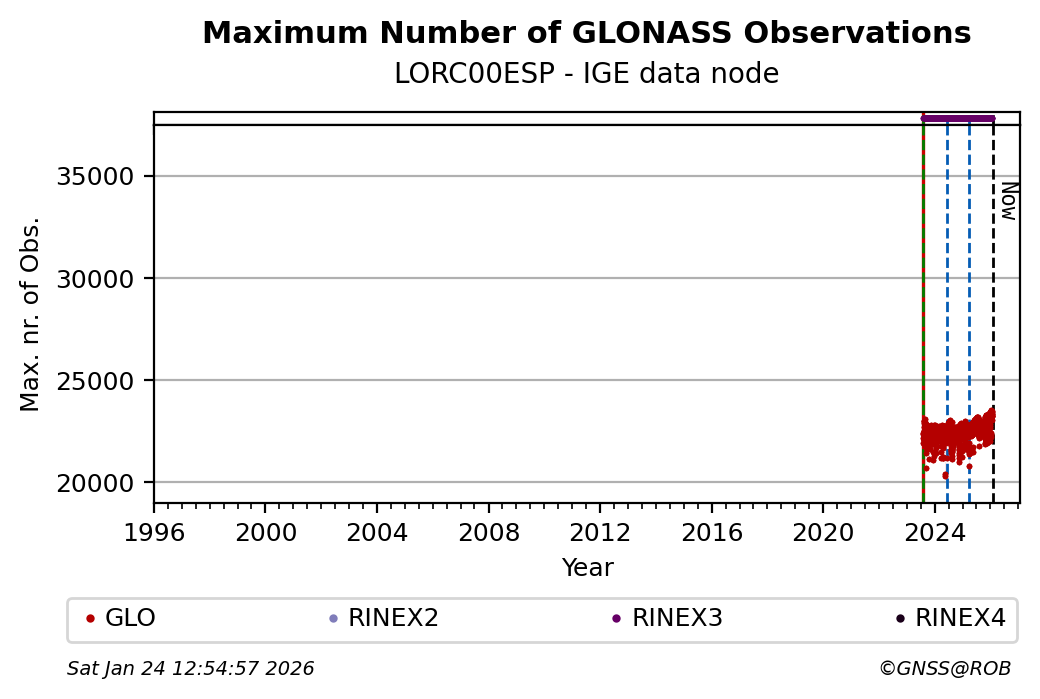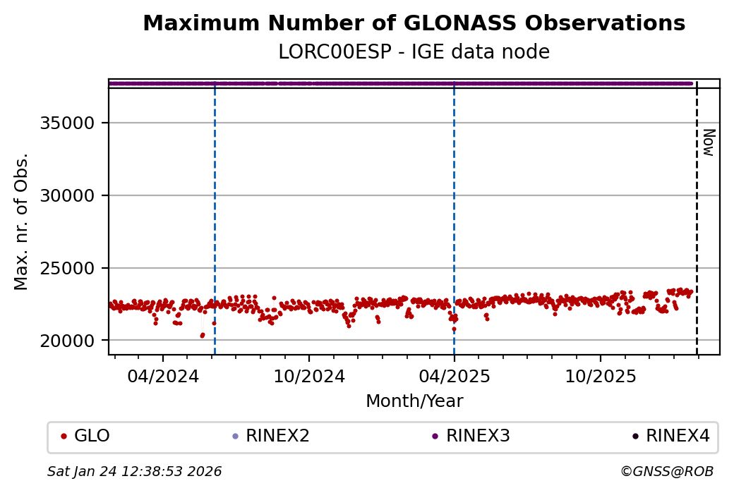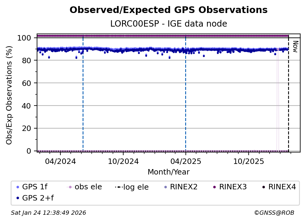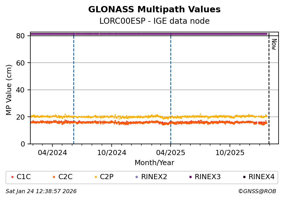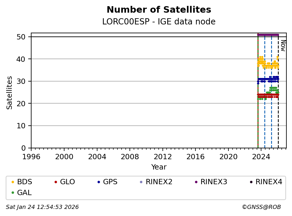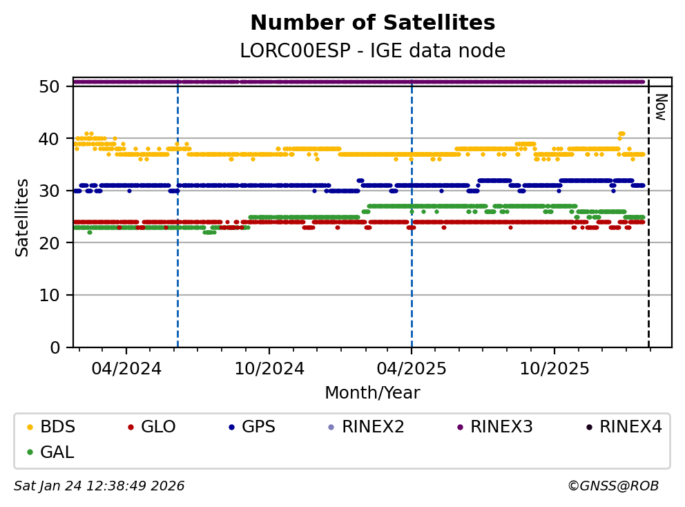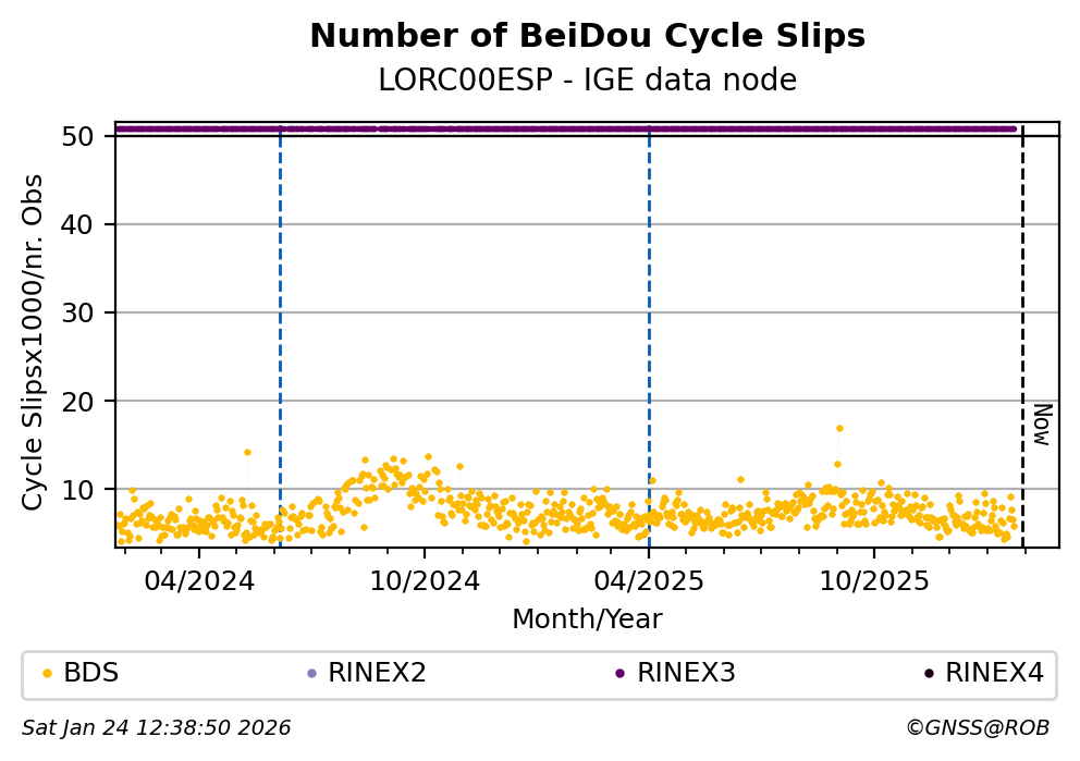 The plots below present the long-term tracking performance of the EPOS-GNSS station LORC00ESP based on the daily RINEX data available from the IGE EPOS-GNSS data node. The data quality metrics have been computed at the data node using the G-Nut/Anubis software.