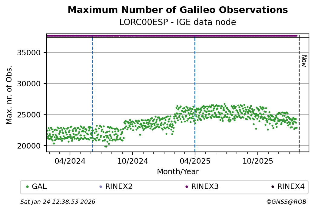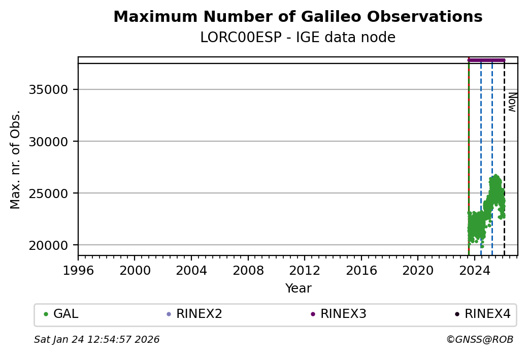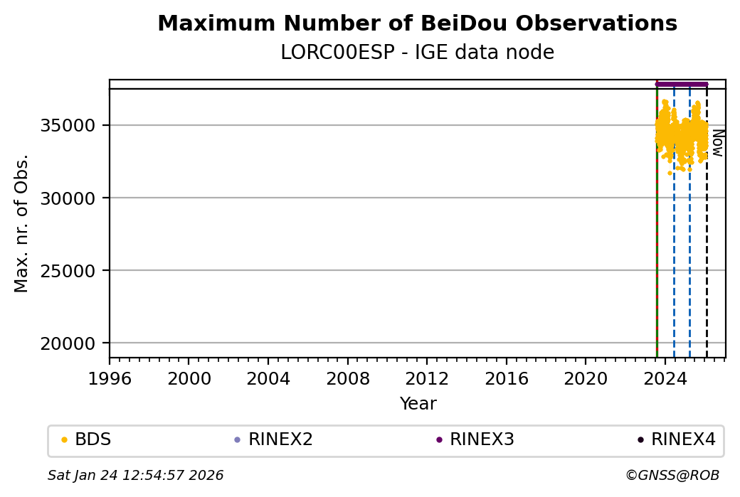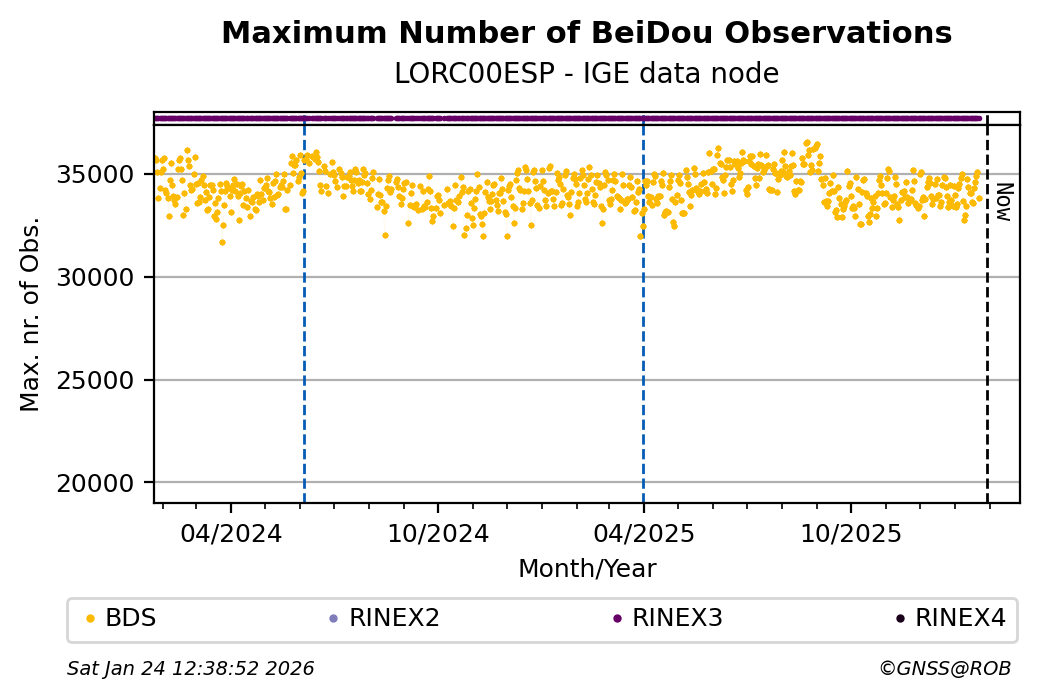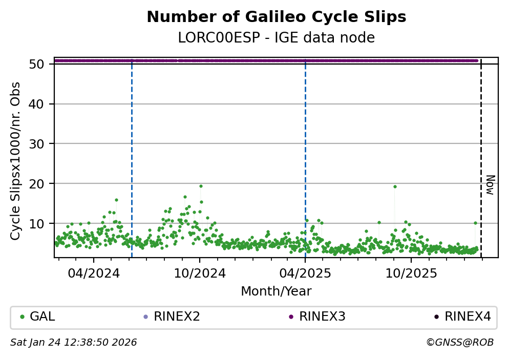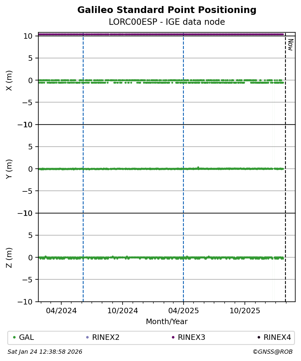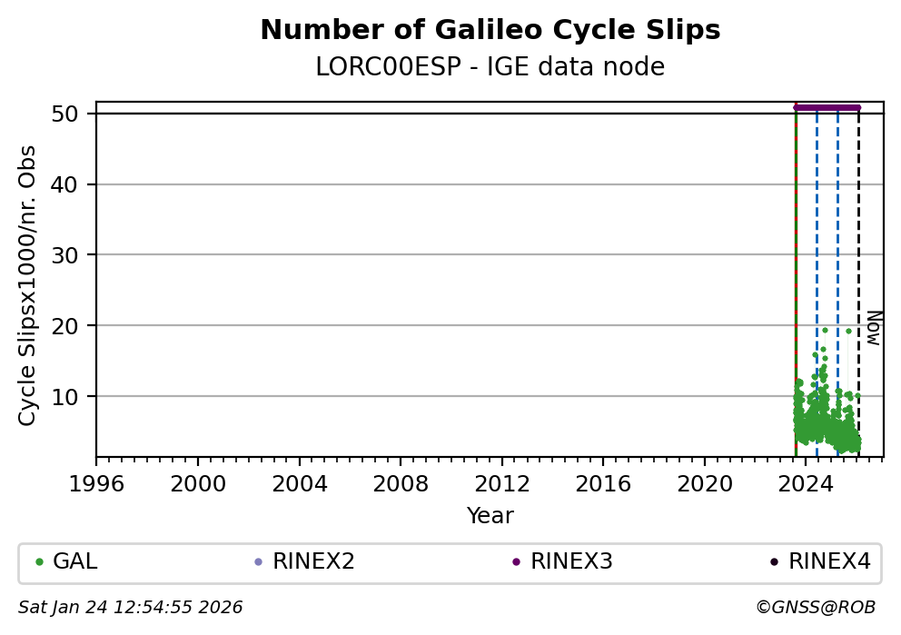 The plots below present the long-term tracking performance of the EPOS-GNSS station LORC00ESP based on the daily RINEX data available from the IGE EPOS-GNSS data node. The data quality metrics have been computed at the data node using the G-Nut/Anubis software.