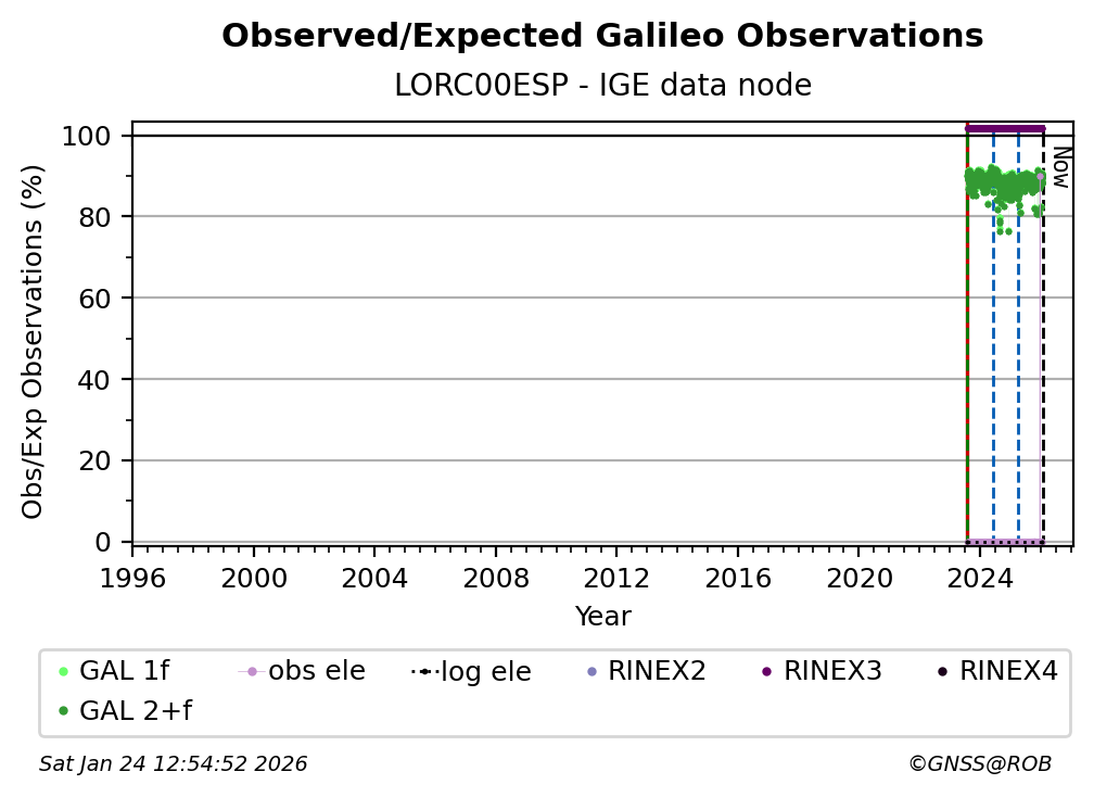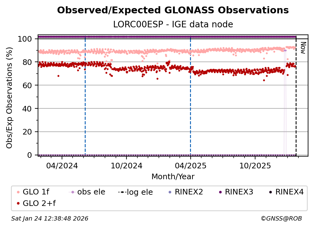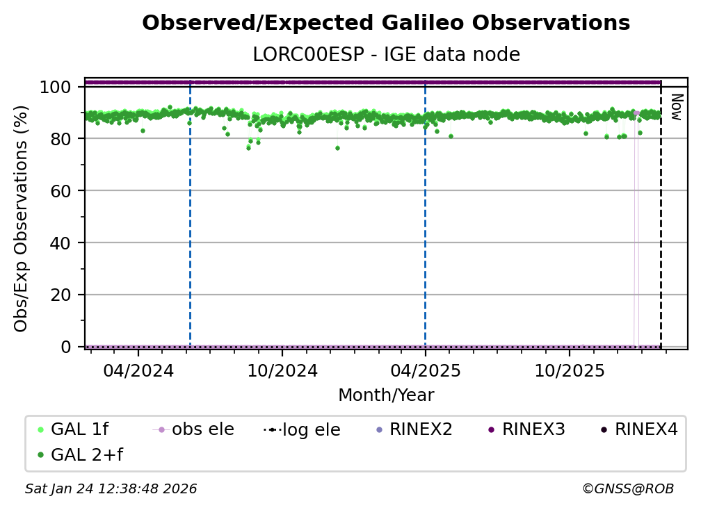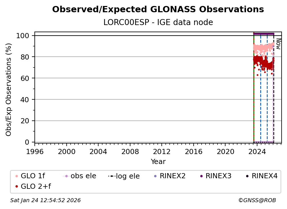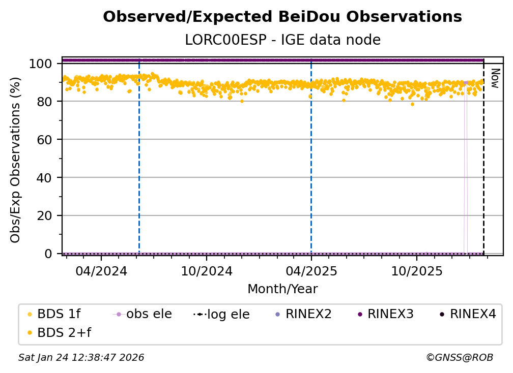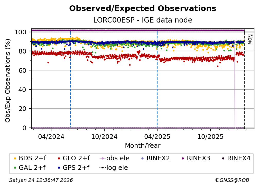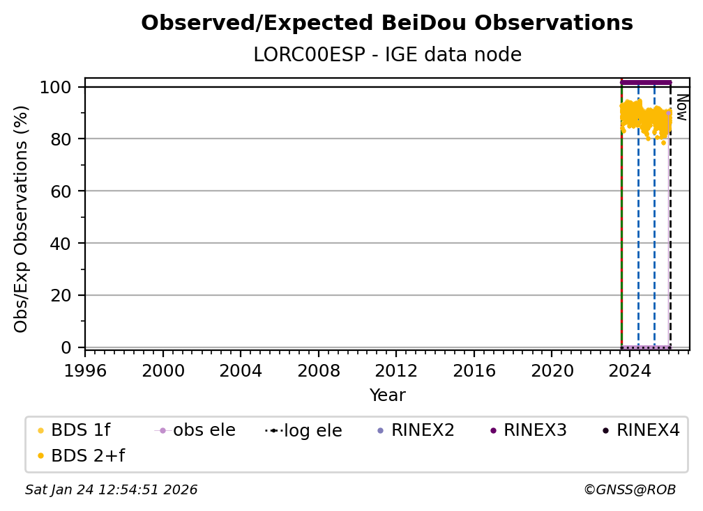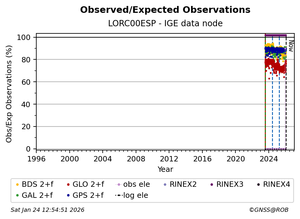 The percentage corresponds, for each constellation tracked by the station, to the ratio of the number of observations in the daily RINEX file with respect to the number of expected observations: