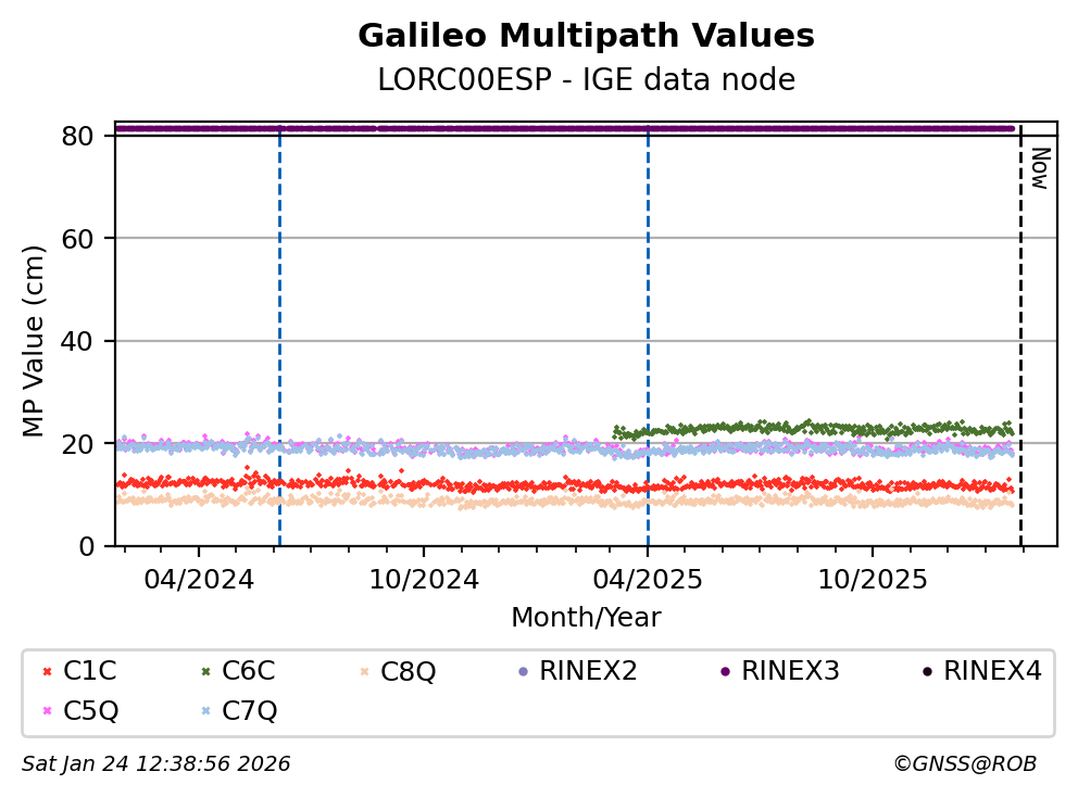 These plots display the daily mean of code multipath per frequency band and satellite constellation. Code multipath statistics are calculated for all pseudorange codes of all GNSS satellites providing dual-frequency carrier-phase observations. The code multipath characterizes the quality of the observed signal and the site environment.