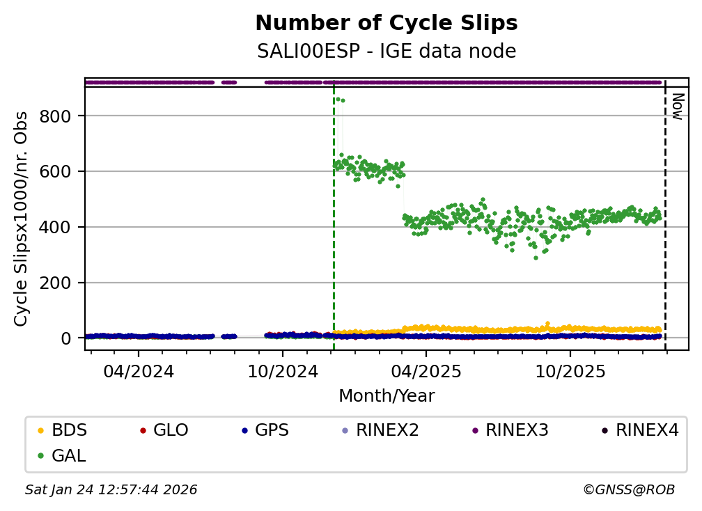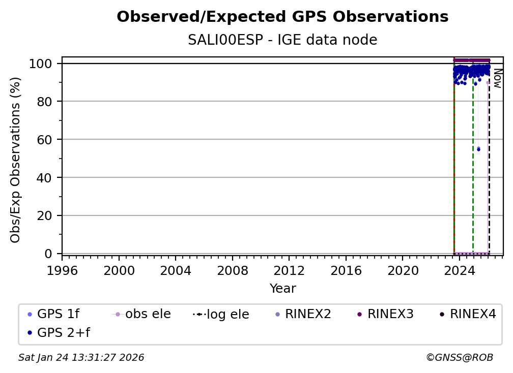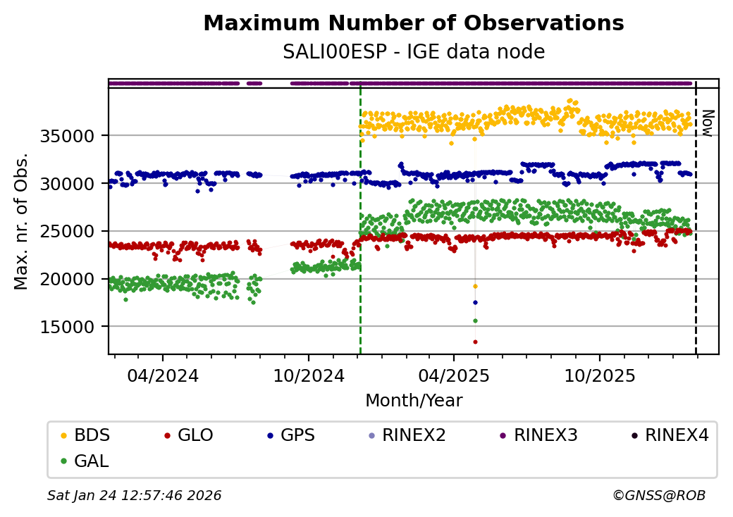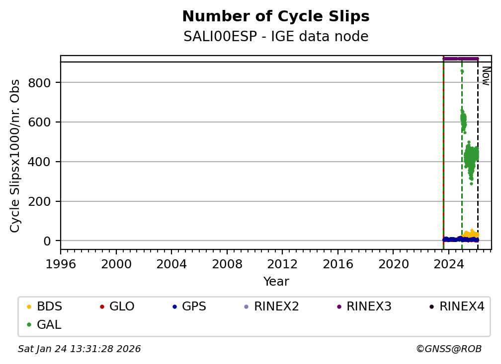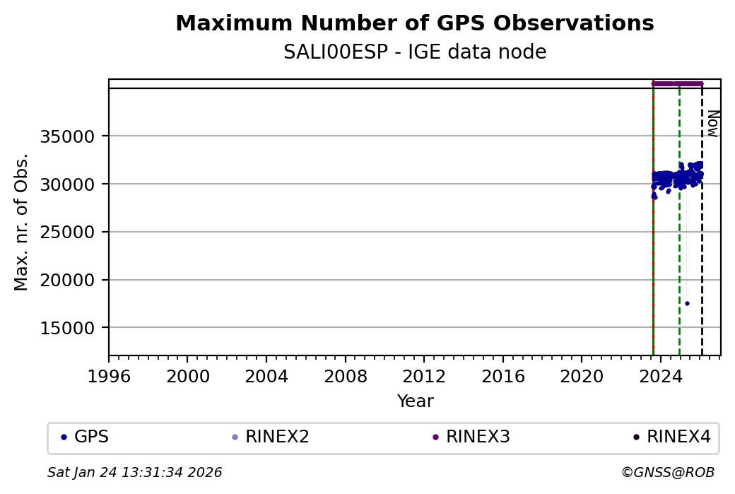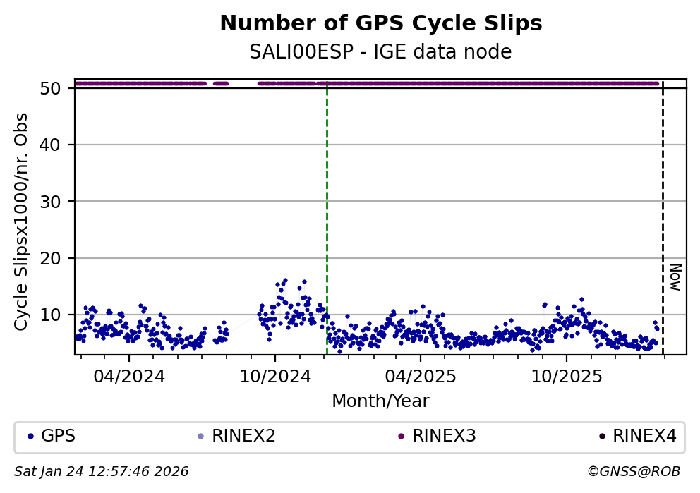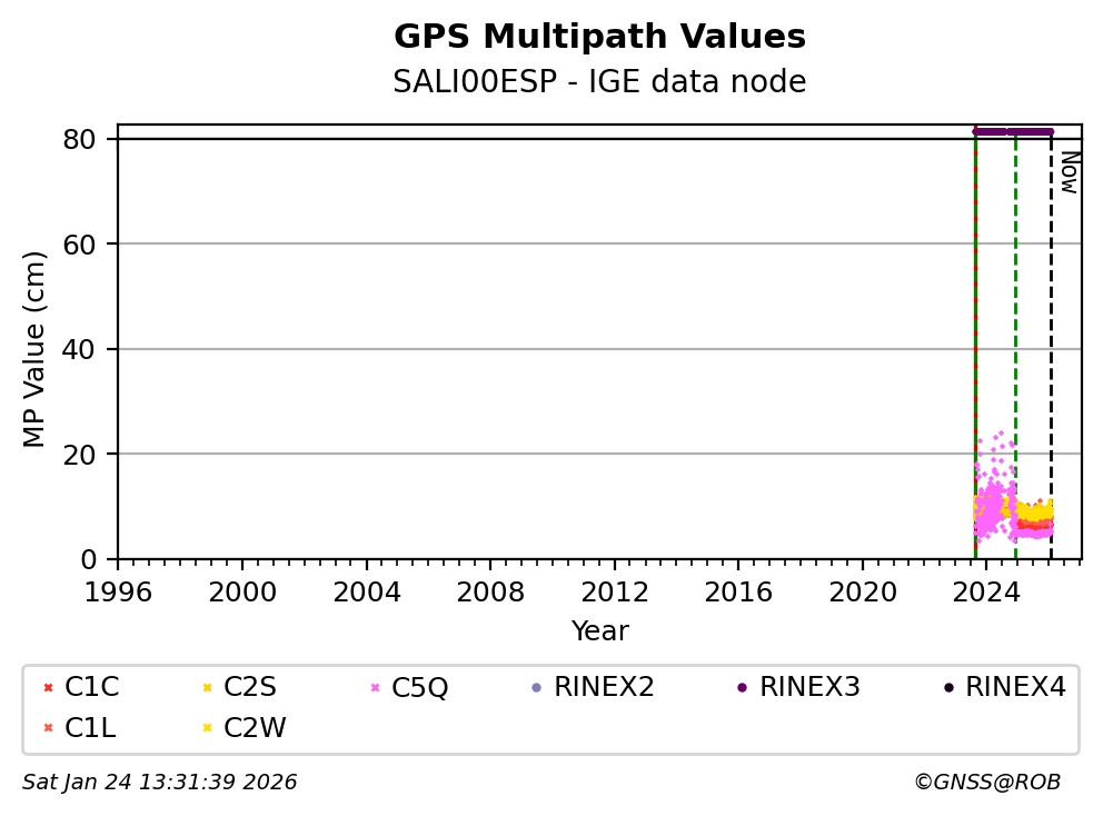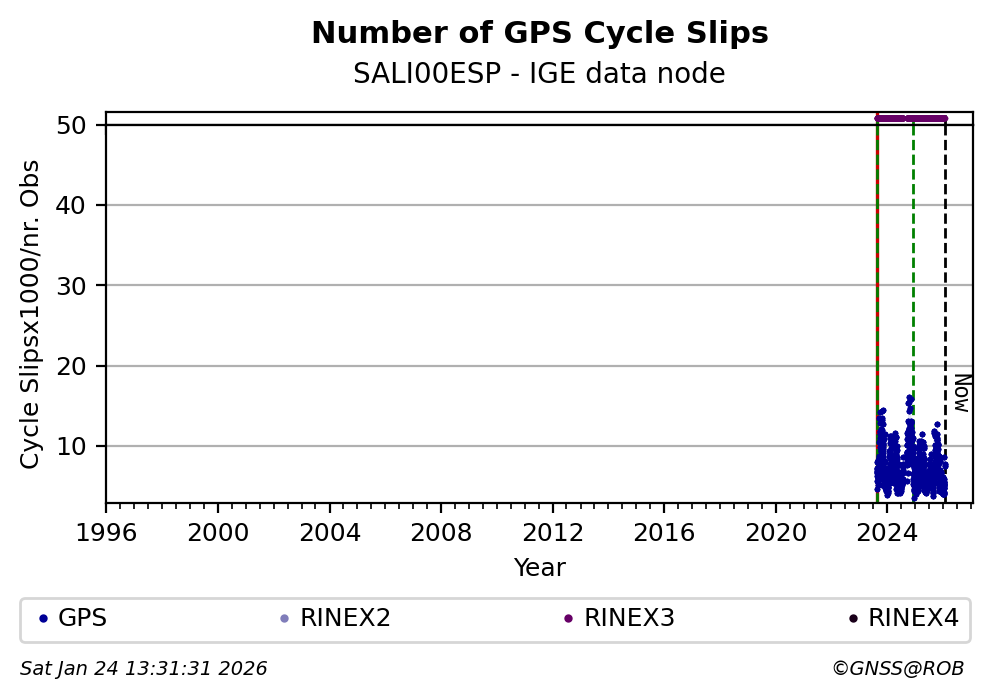 The plots below present the long-term tracking performance of the EPOS-GNSS station SALI00ESP based on the daily RINEX data available from the IGE EPOS-GNSS data node. The data quality metrics have been computed at the data node using the G-Nut/Anubis software.
