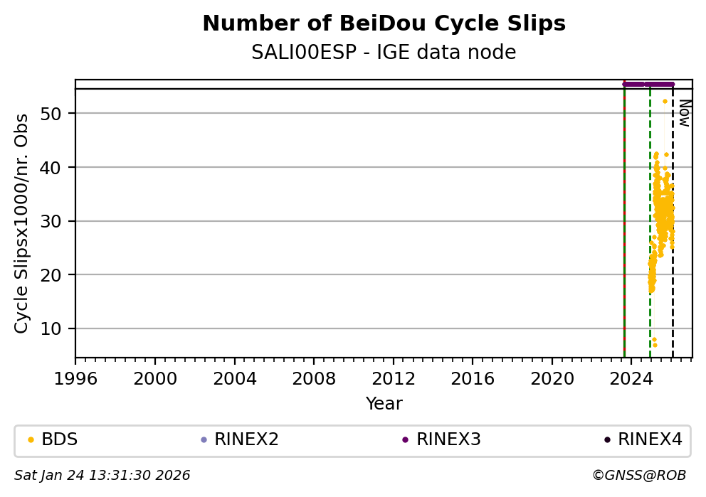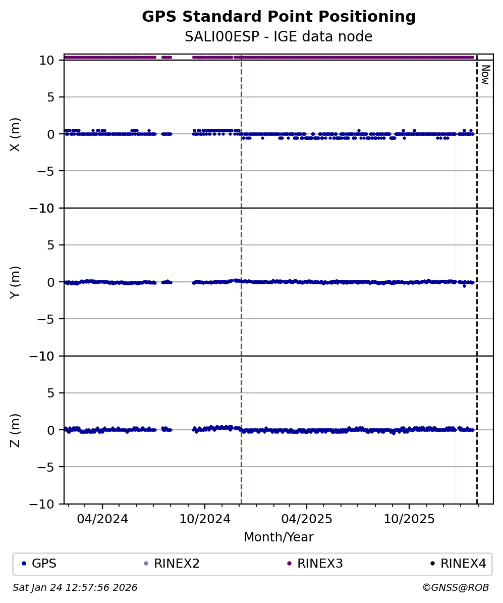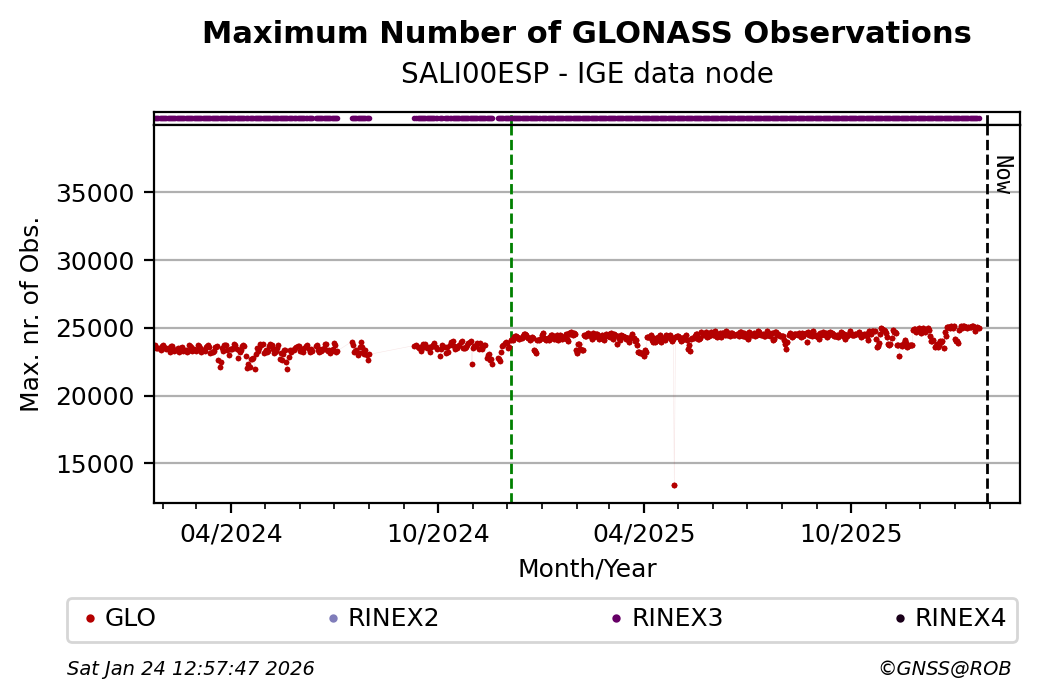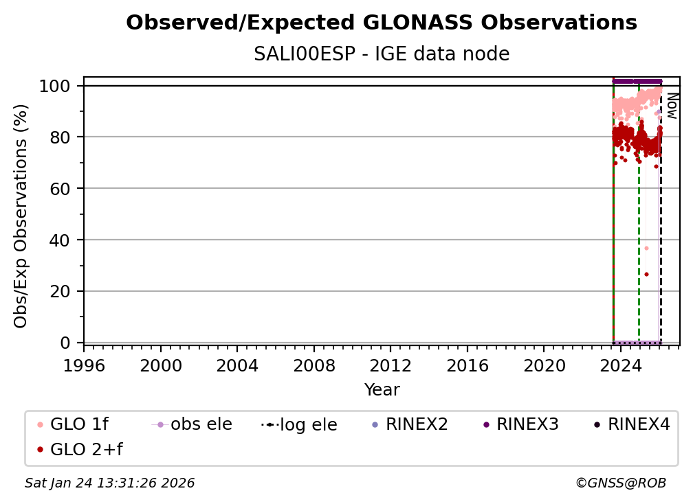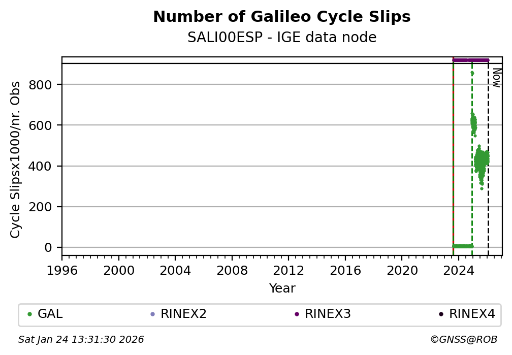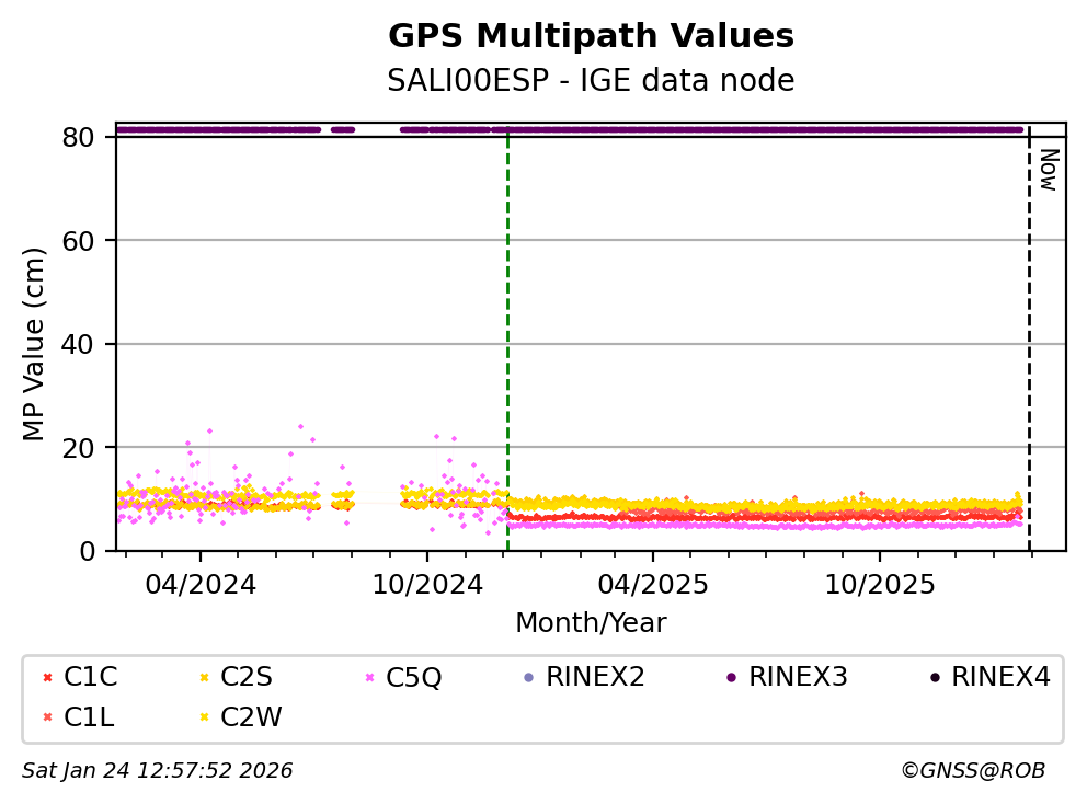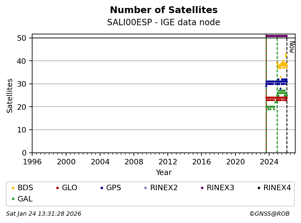 The plots below present the long-term tracking performance of the EPOS-GNSS station SALI00ESP based on the daily RINEX data available from the IGE EPOS-GNSS data node. The data quality metrics have been computed at the data node using the G-Nut/Anubis software.