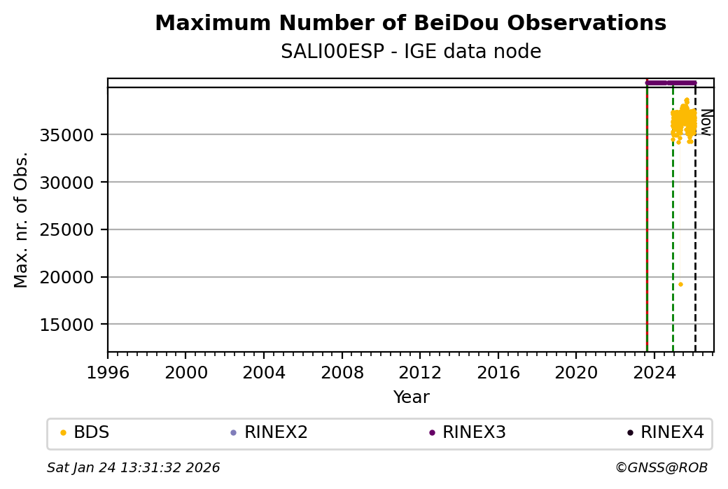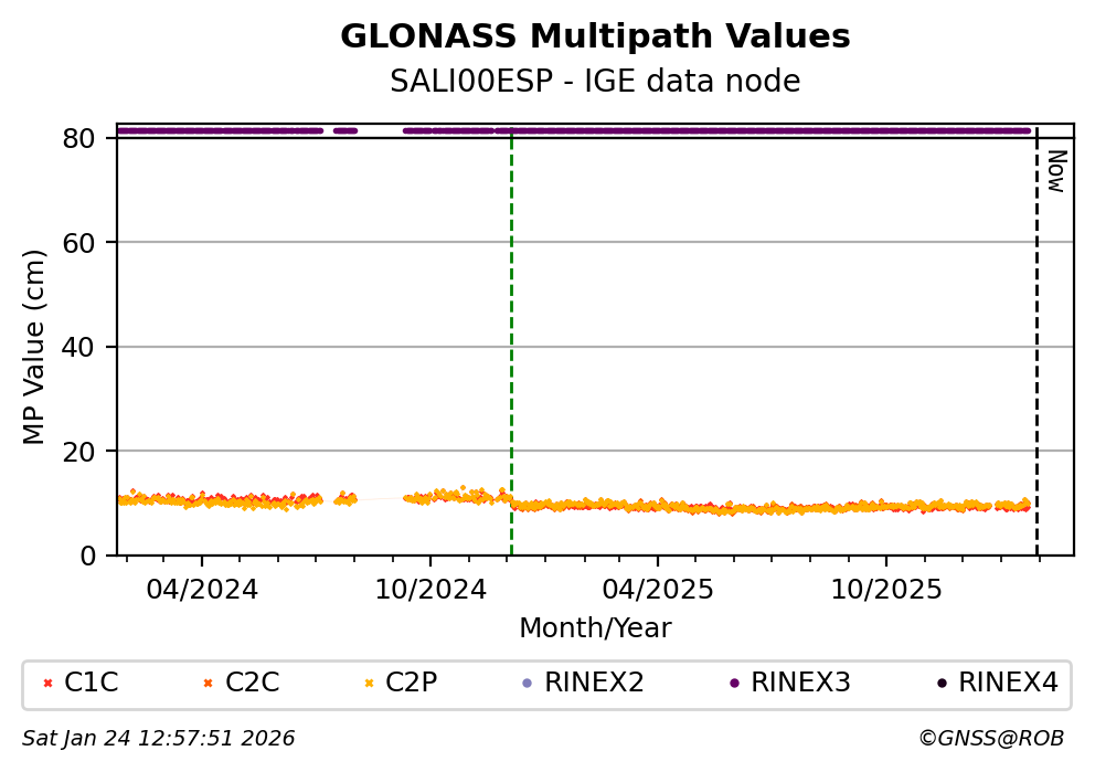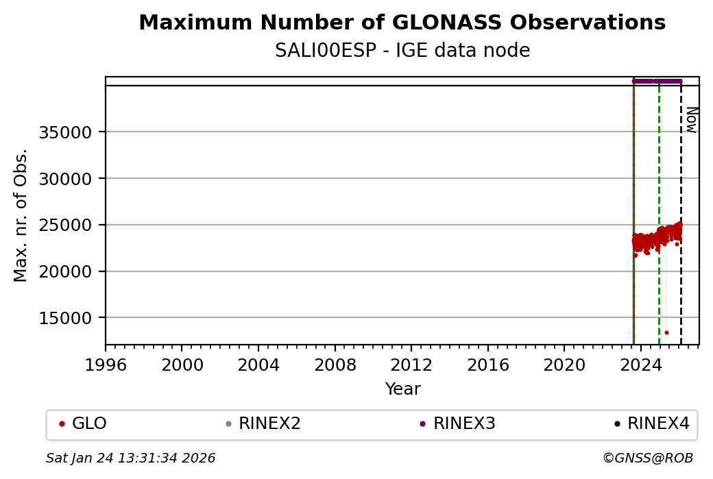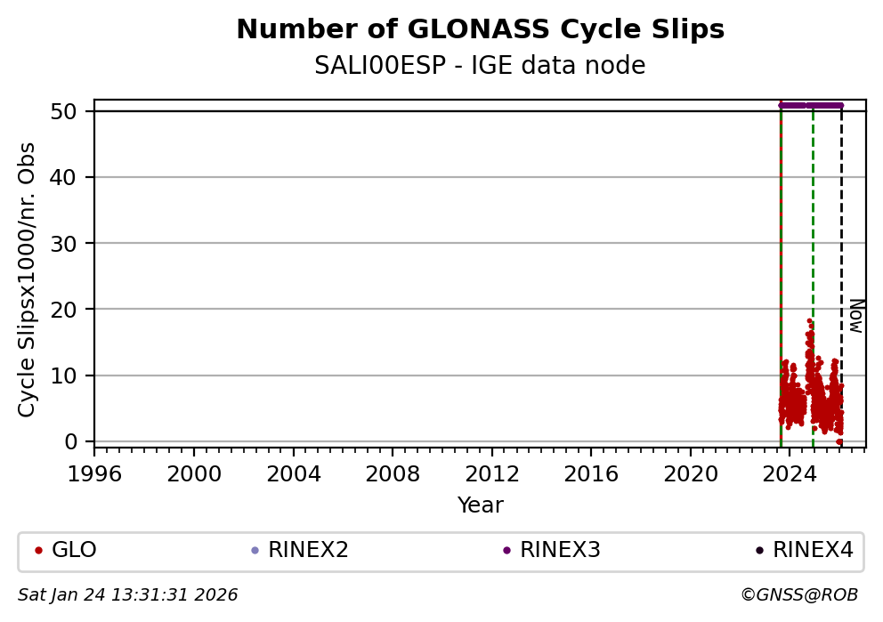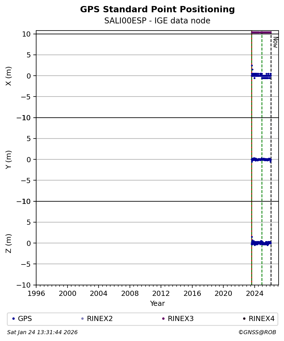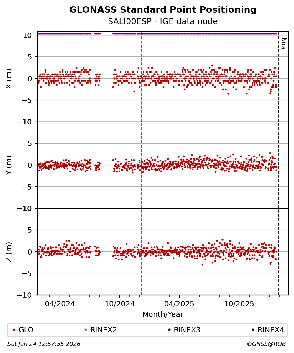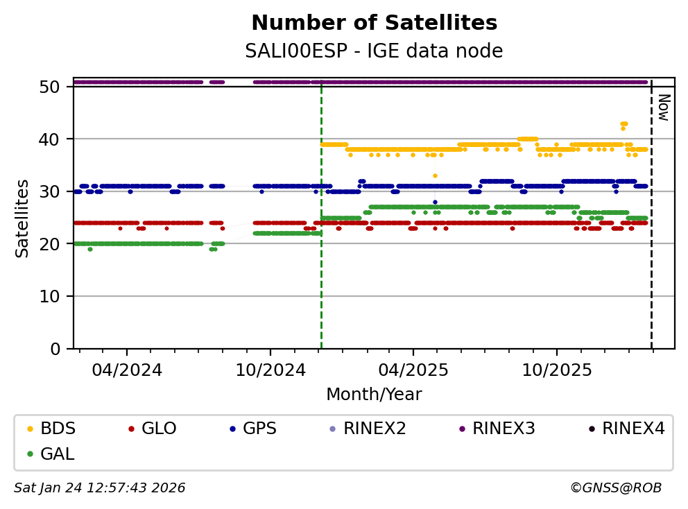 The plots below present the long-term tracking performance of the EPOS-GNSS station SALI00ESP based on the daily RINEX data available from the IGE EPOS-GNSS data node. The data quality metrics have been computed at the data node using the G-Nut/Anubis software.