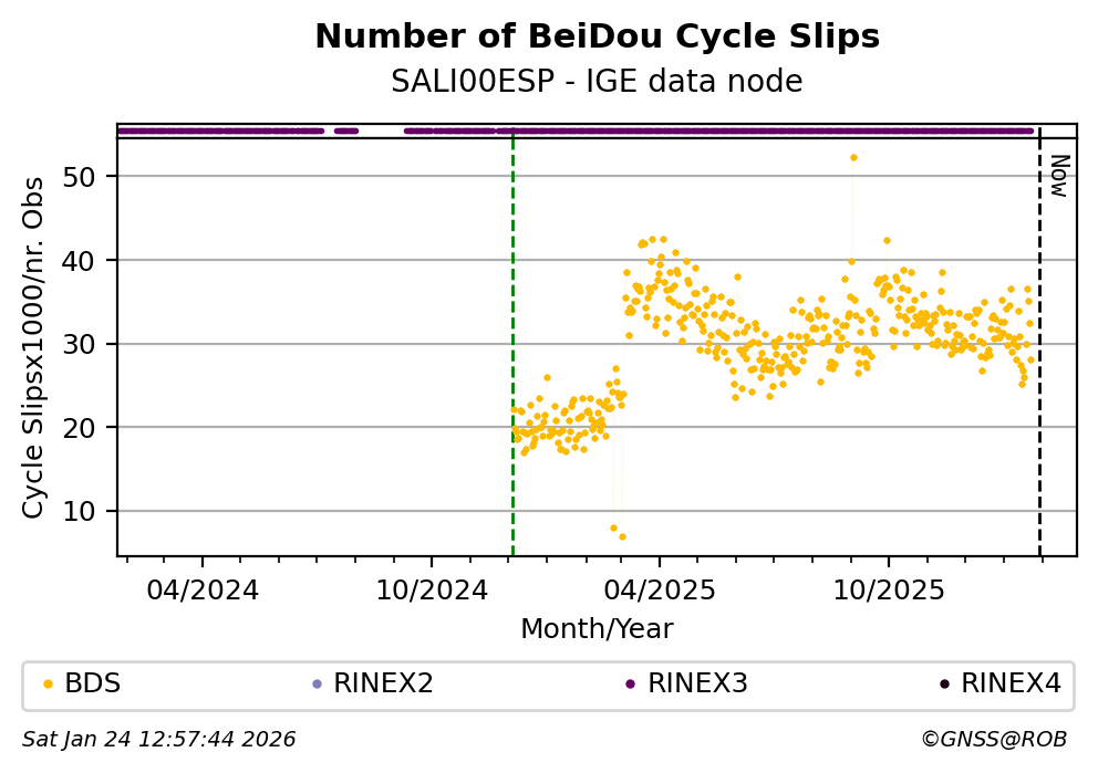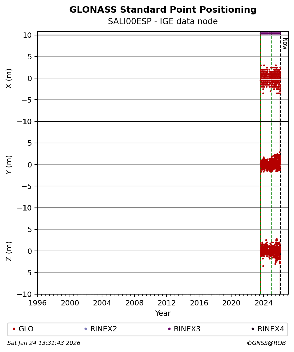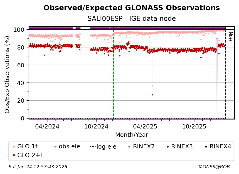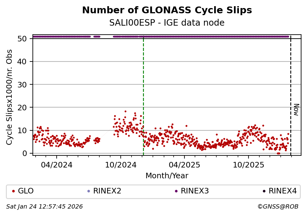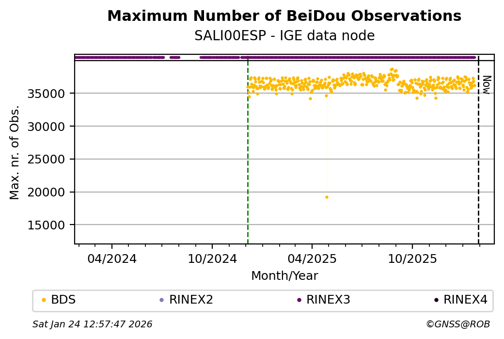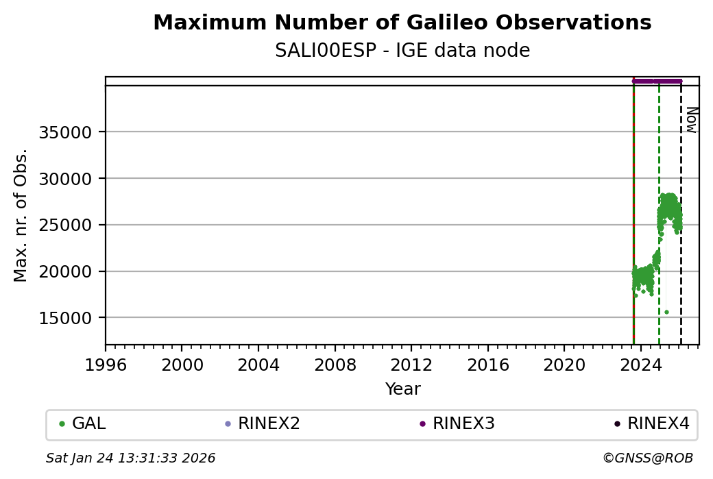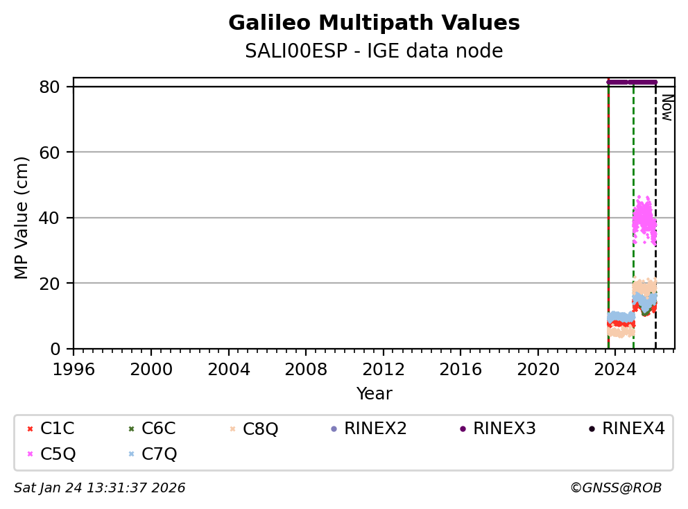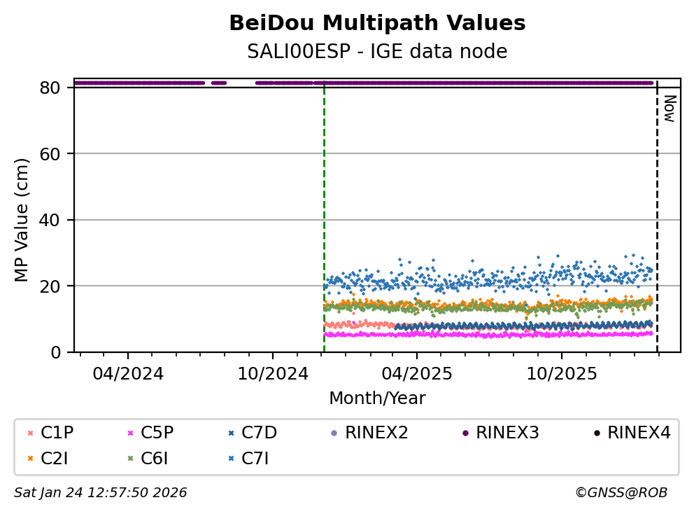 The plots below present the long-term tracking performance of the EPOS-GNSS station SALI00ESP based on the daily RINEX data available from the IGE EPOS-GNSS data node. The data quality metrics have been computed at the data node using the G-Nut/Anubis software.