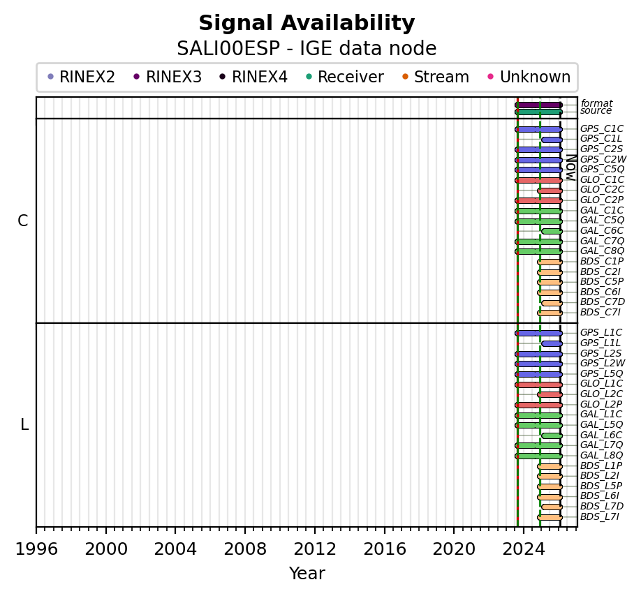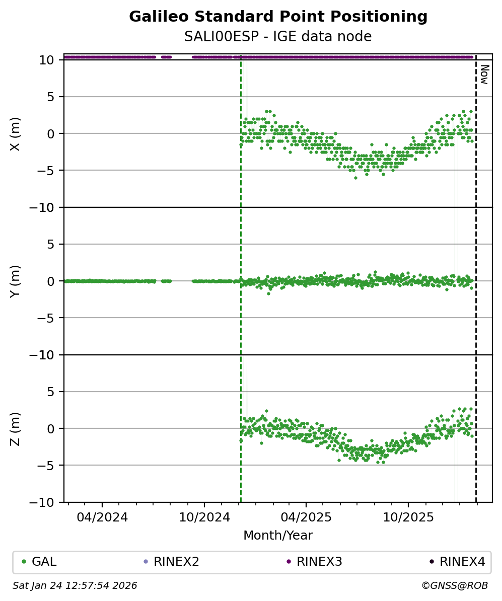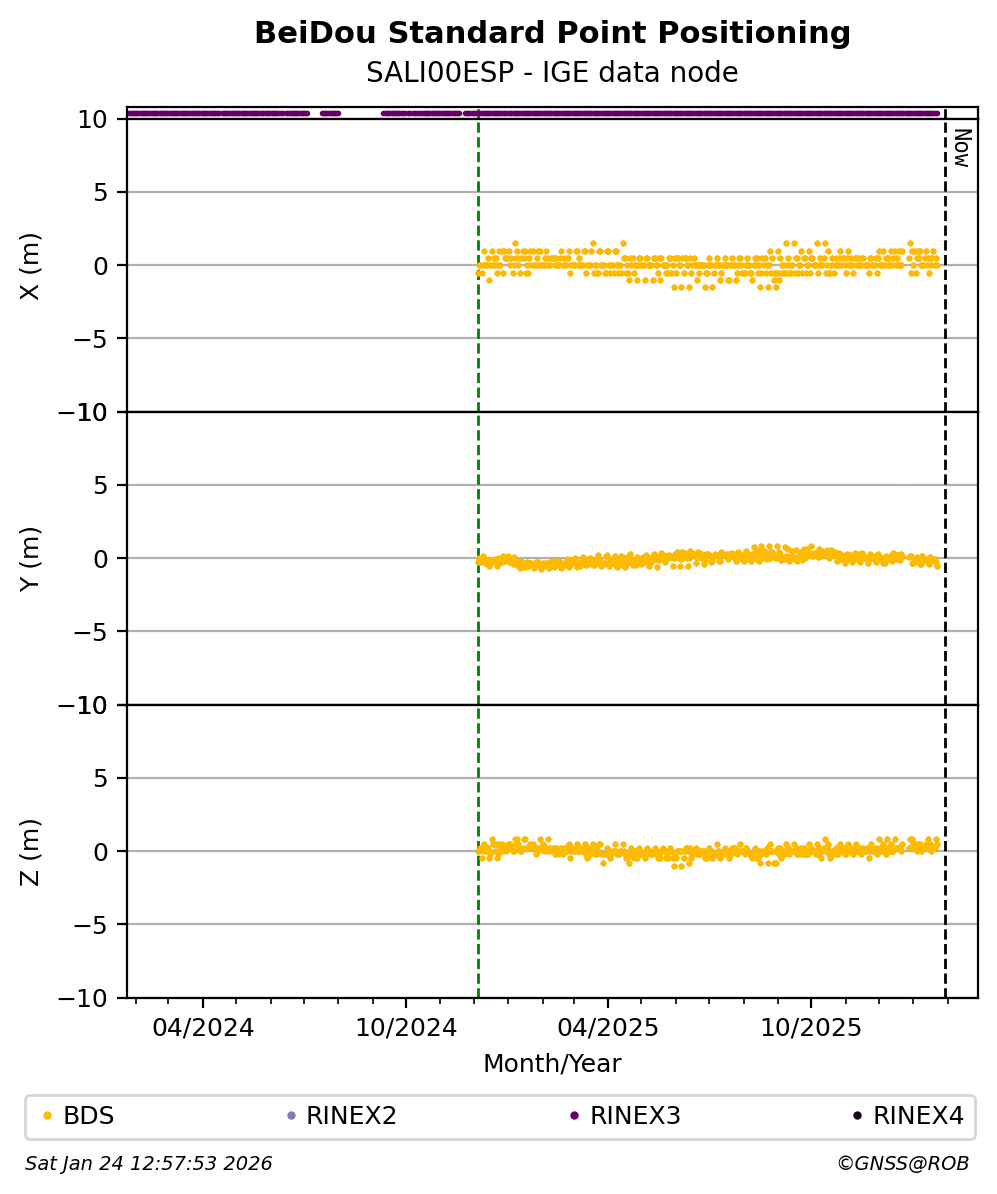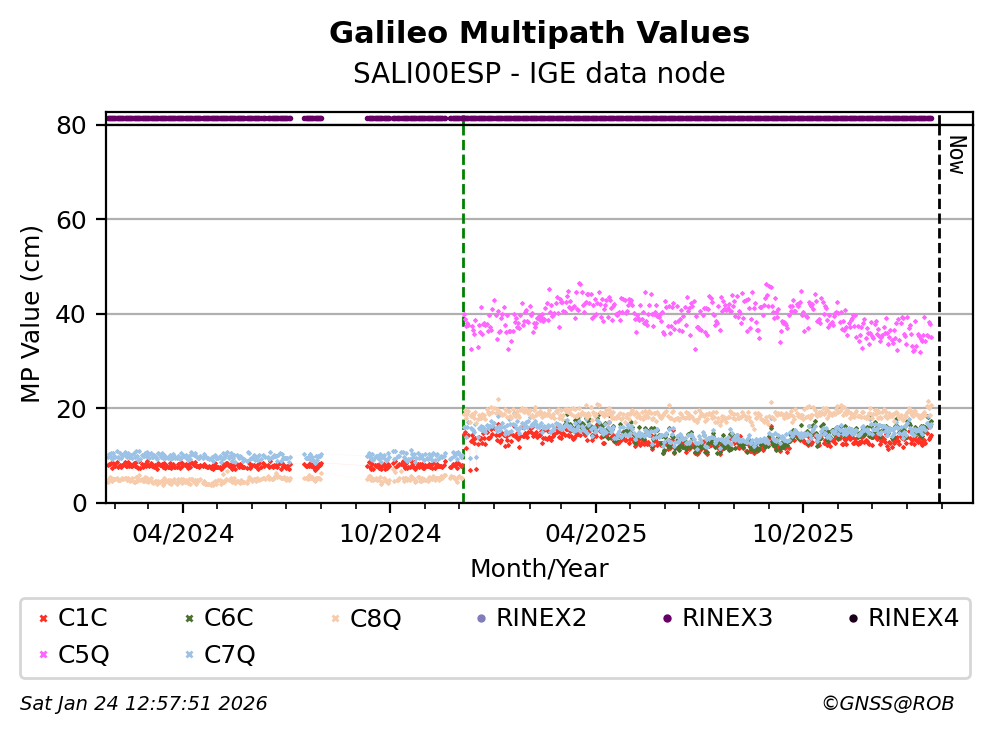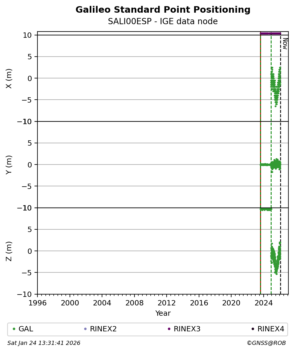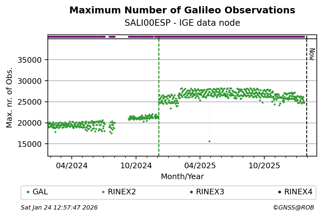 The plots below present the long-term tracking performance of the EPOS-GNSS station SALI00ESP based on the daily RINEX data available from the IGE EPOS-GNSS data node. The data quality metrics have been computed at the data node using the G-Nut/Anubis software.