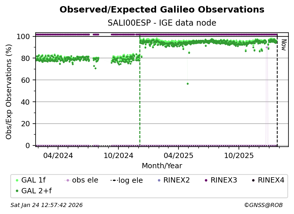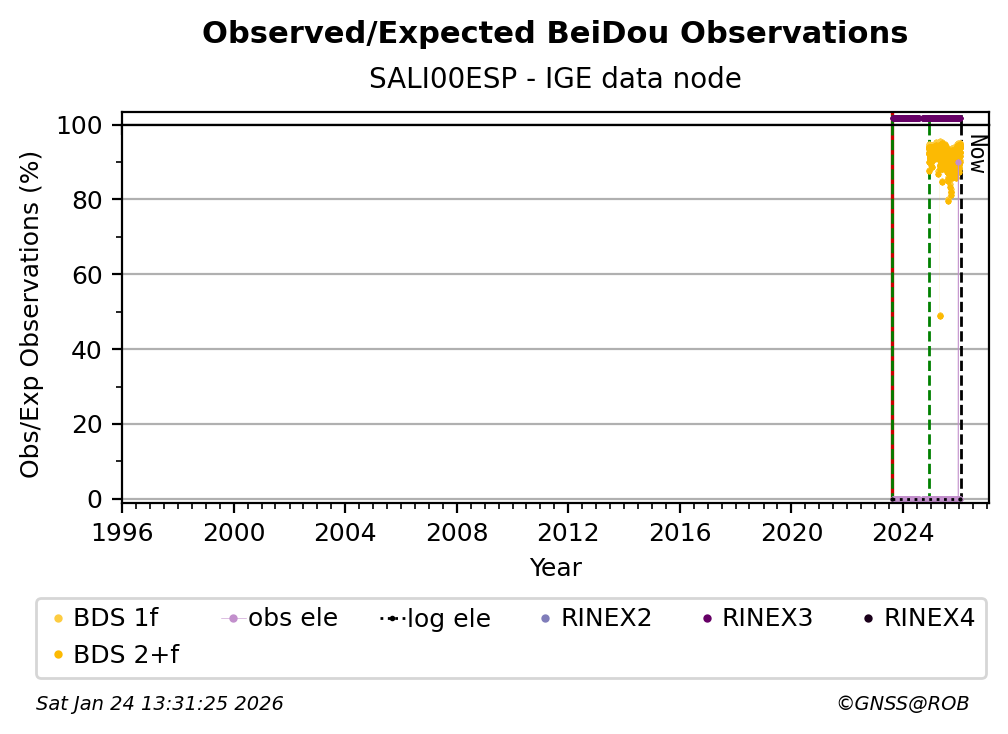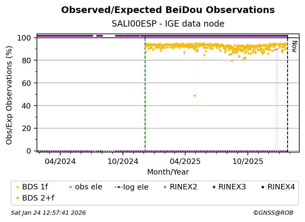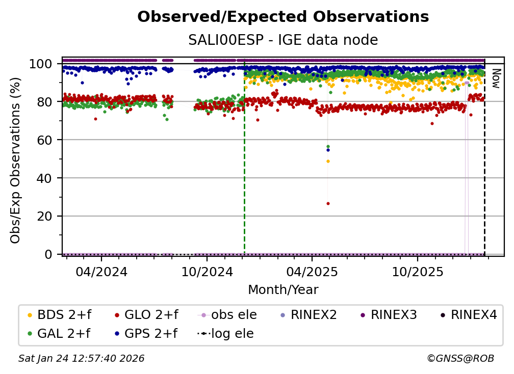 The percentage corresponds, for each constellation tracked by the station, to the ratio of the number of observations in the daily RINEX file with respect to the number of expected observations: