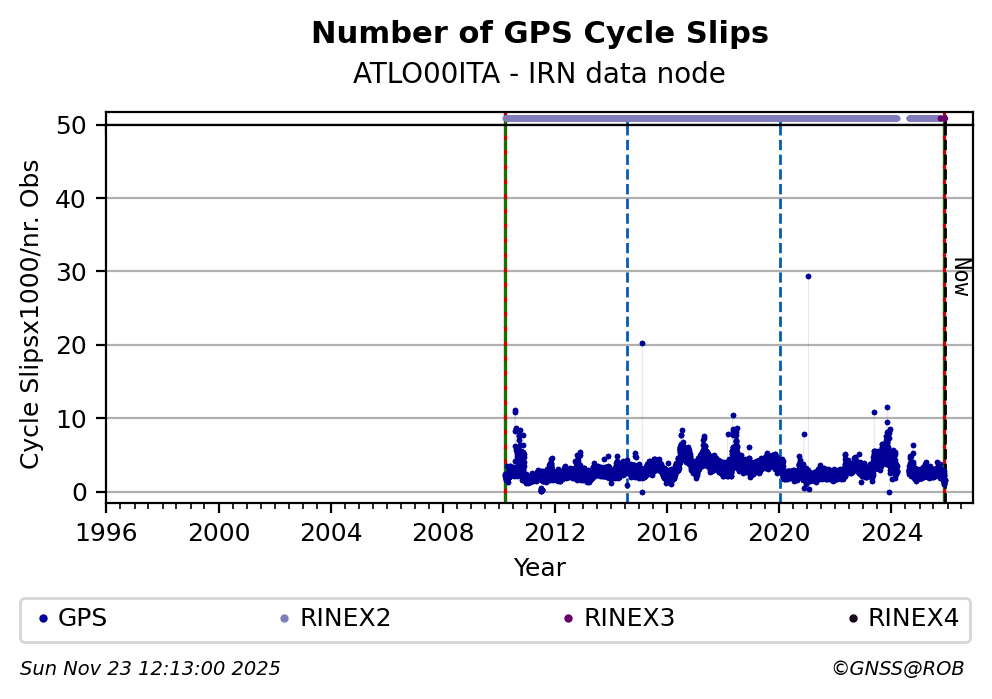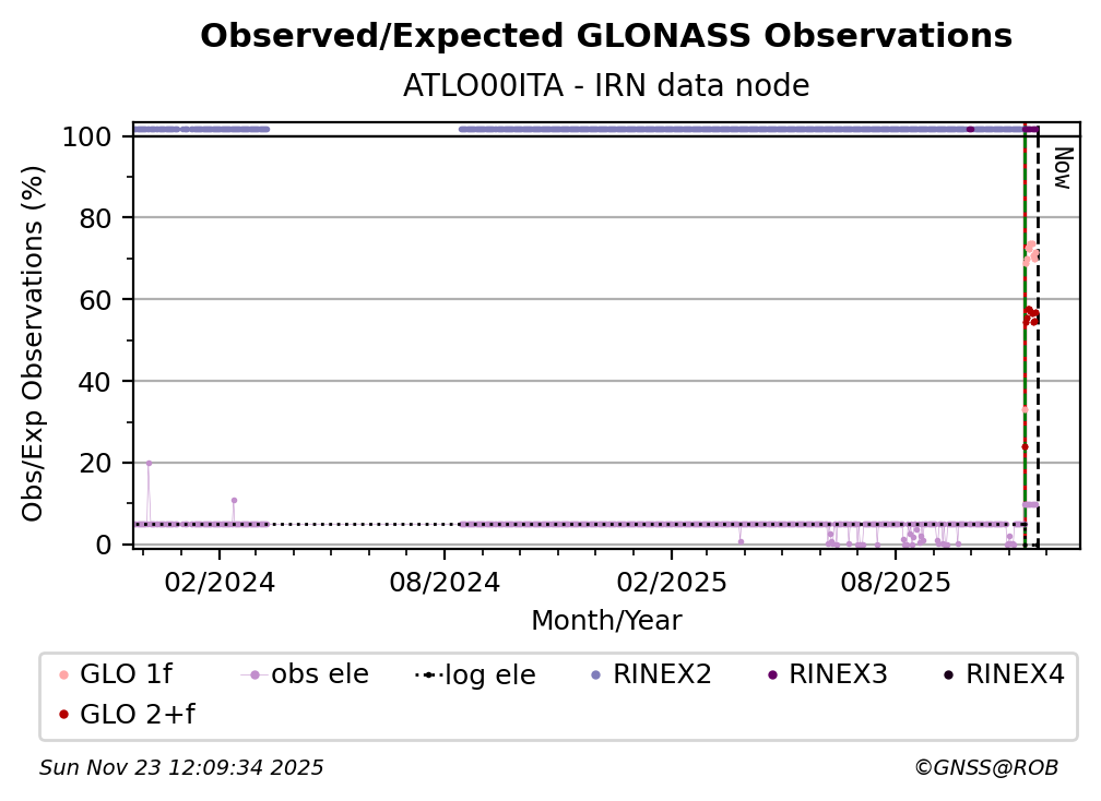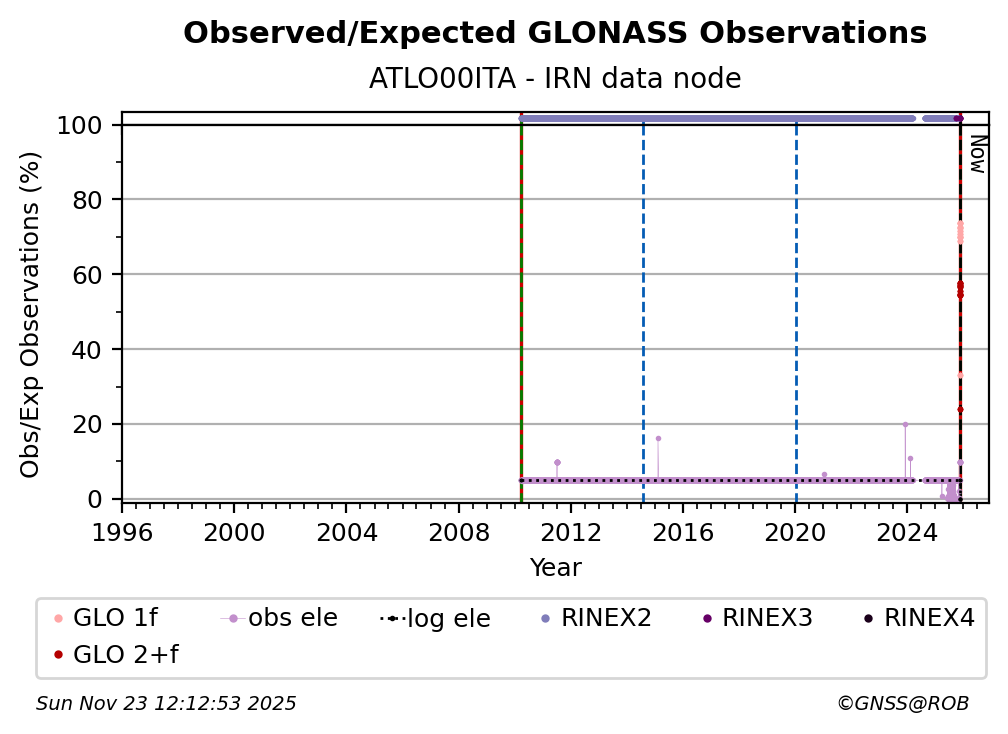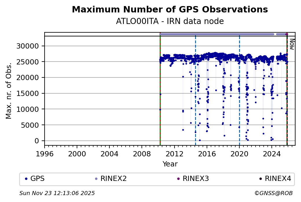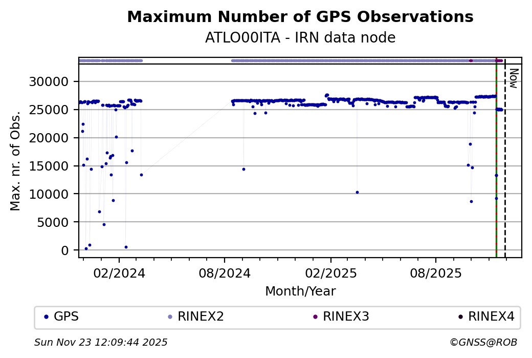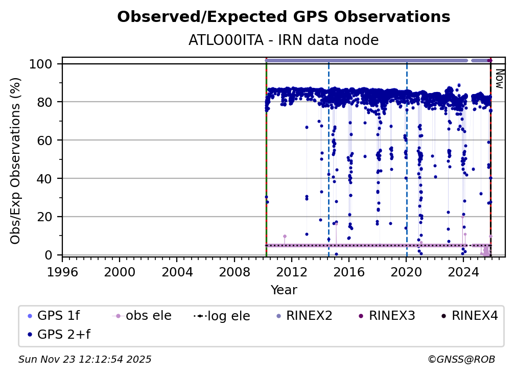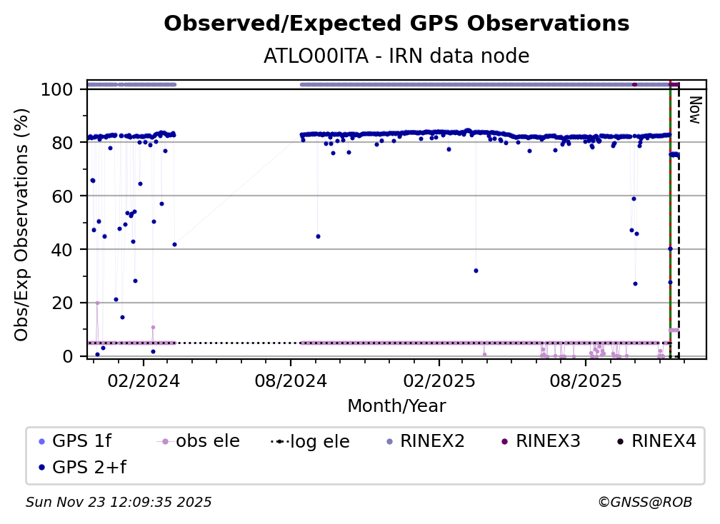 The plots below present the long-term tracking performance of the EPOS-GNSS station ATLO00ITA based on the daily RINEX data available from the IRN EPOS-GNSS data node. The data quality metrics have been computed at the data node using the G-Nut/Anubis software.