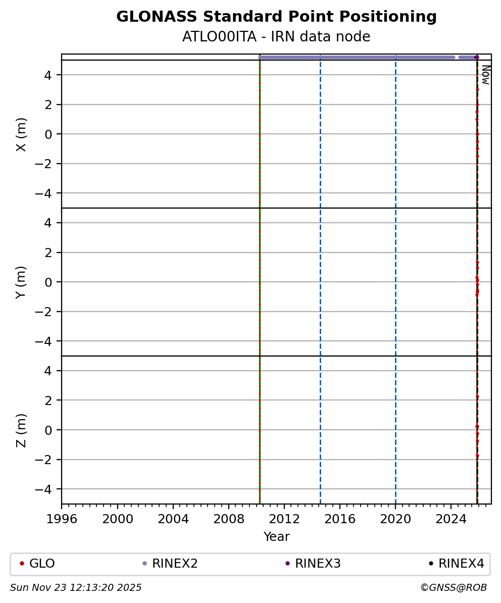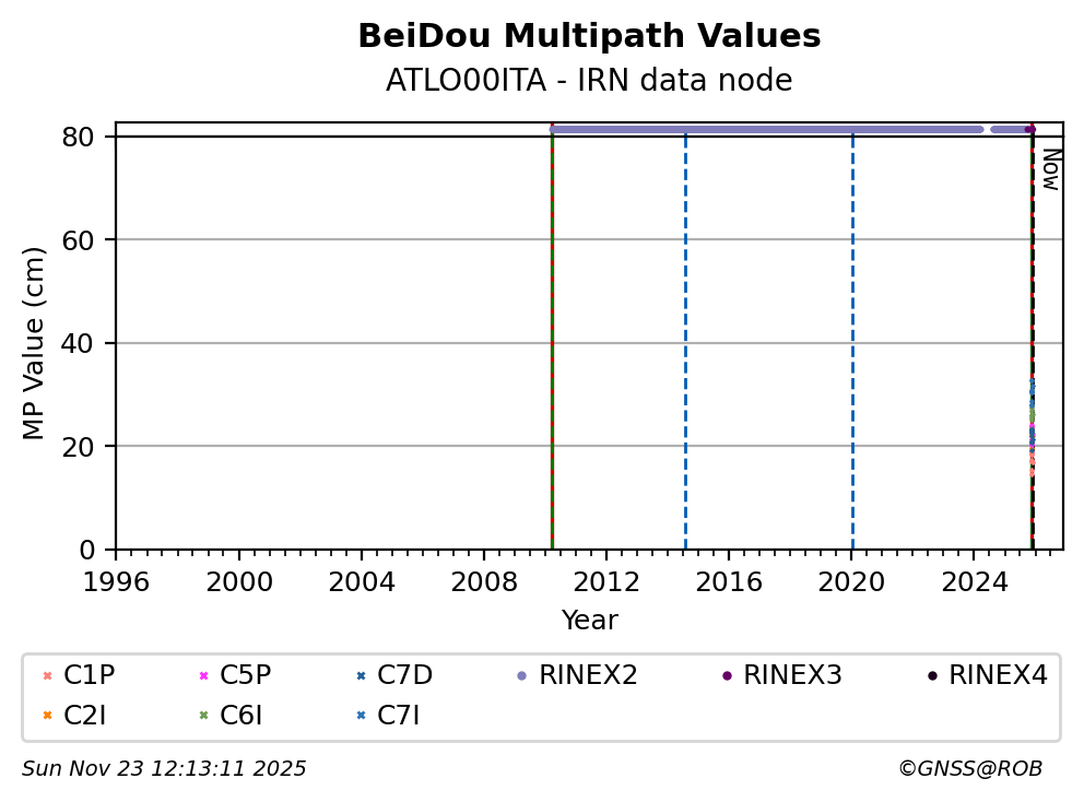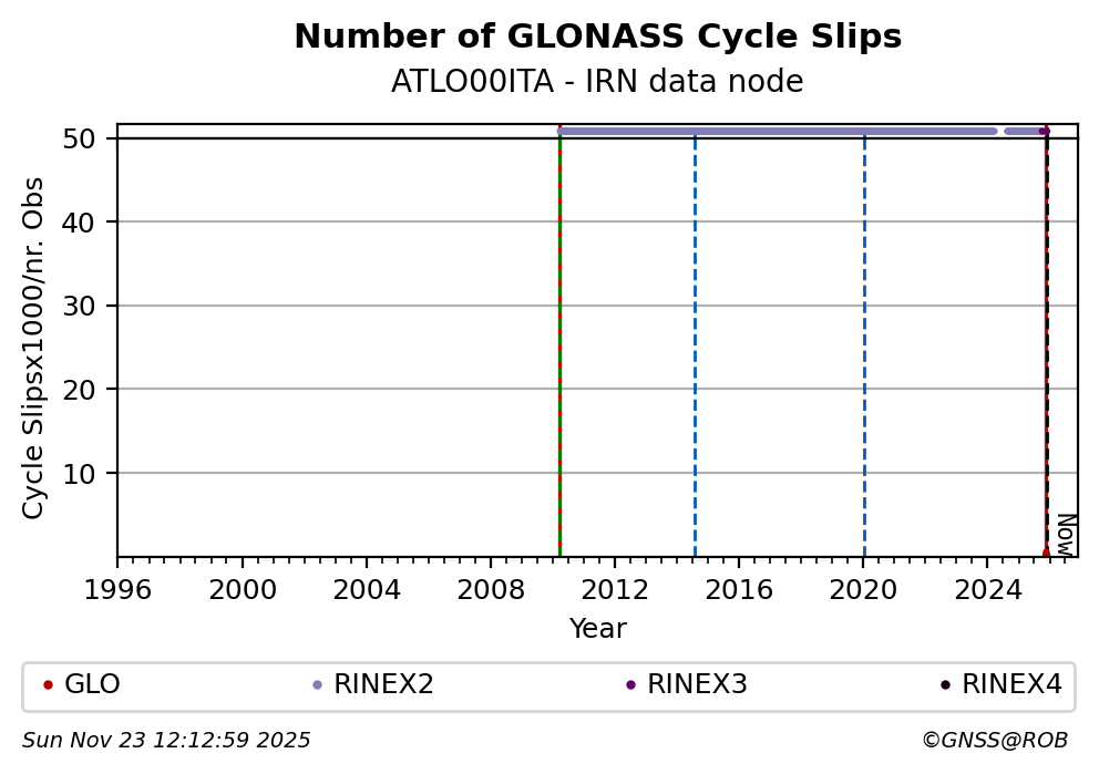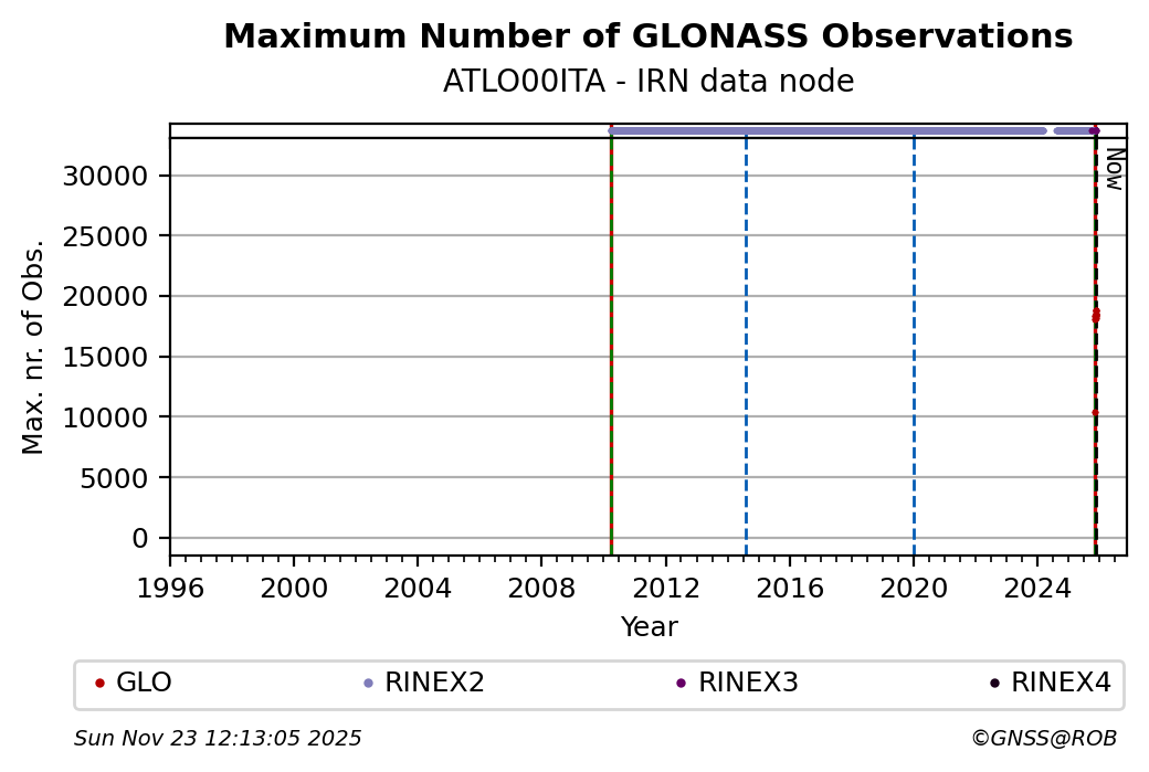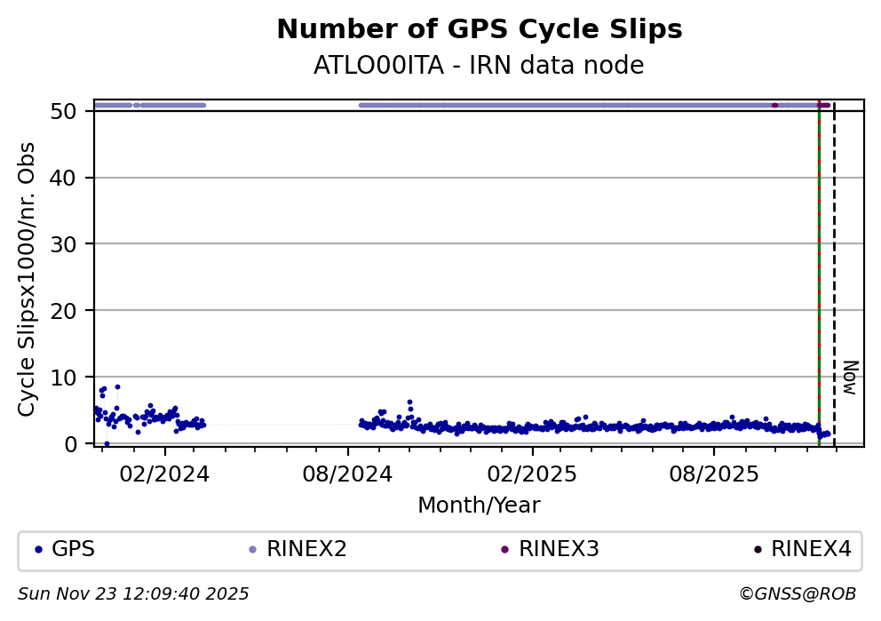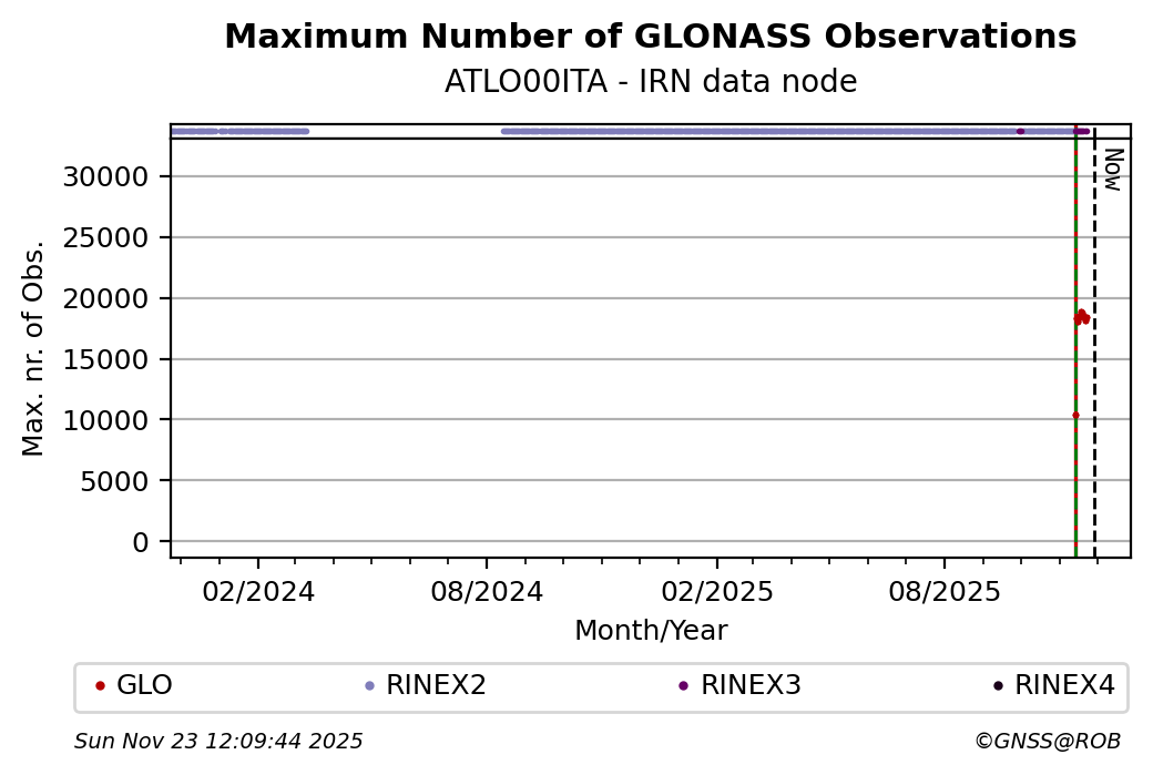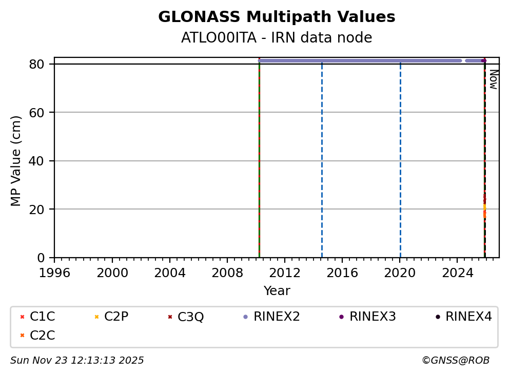 The plots below present the long-term tracking performance of the EPOS-GNSS station ATLO00ITA based on the daily RINEX data available from the IRN EPOS-GNSS data node. The data quality metrics have been computed at the data node using the G-Nut/Anubis software.