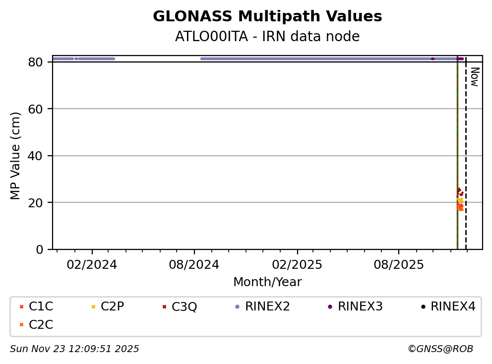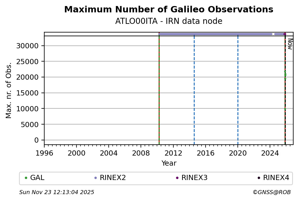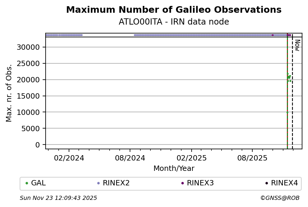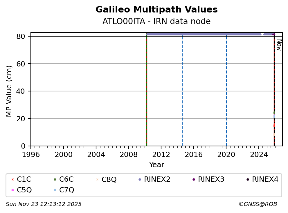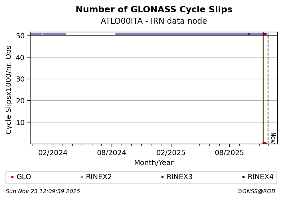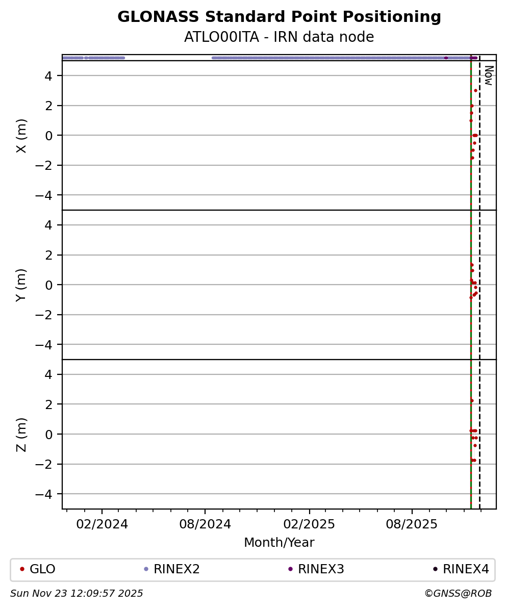 The plots below present the long-term tracking performance of the EPOS-GNSS station ATLO00ITA based on the daily RINEX data available from the IRN EPOS-GNSS data node. The data quality metrics have been computed at the data node using the G-Nut/Anubis software.