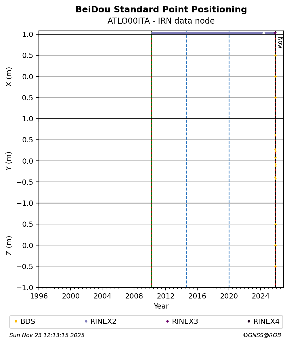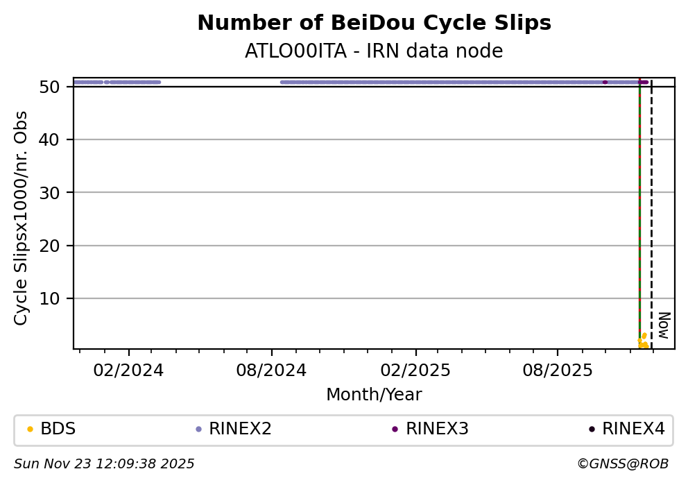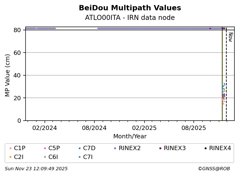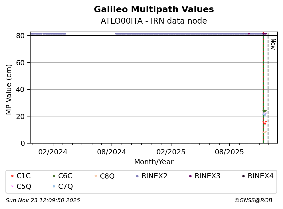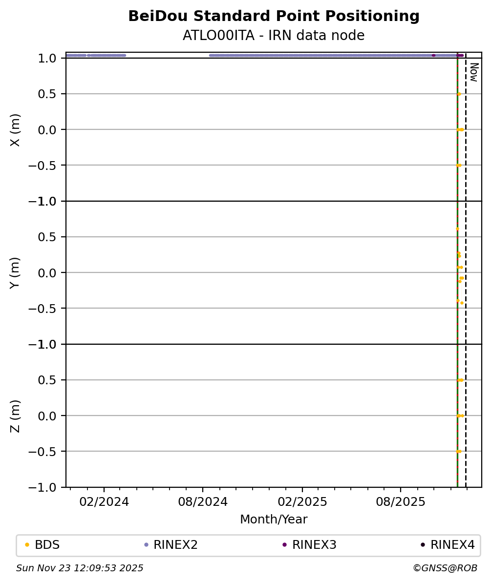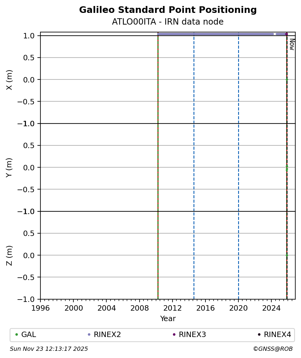 The plots below present the long-term tracking performance of the EPOS-GNSS station ATLO00ITA based on the daily RINEX data available from the IRN EPOS-GNSS data node. The data quality metrics have been computed at the data node using the G-Nut/Anubis software.