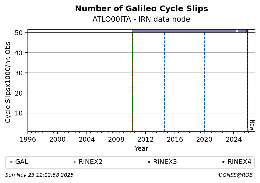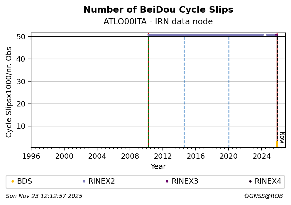 These plots display the number of identified phase cycle slips for each constellation tracked by the station.