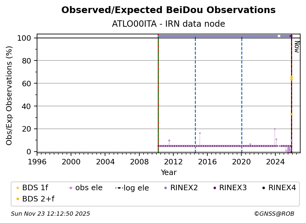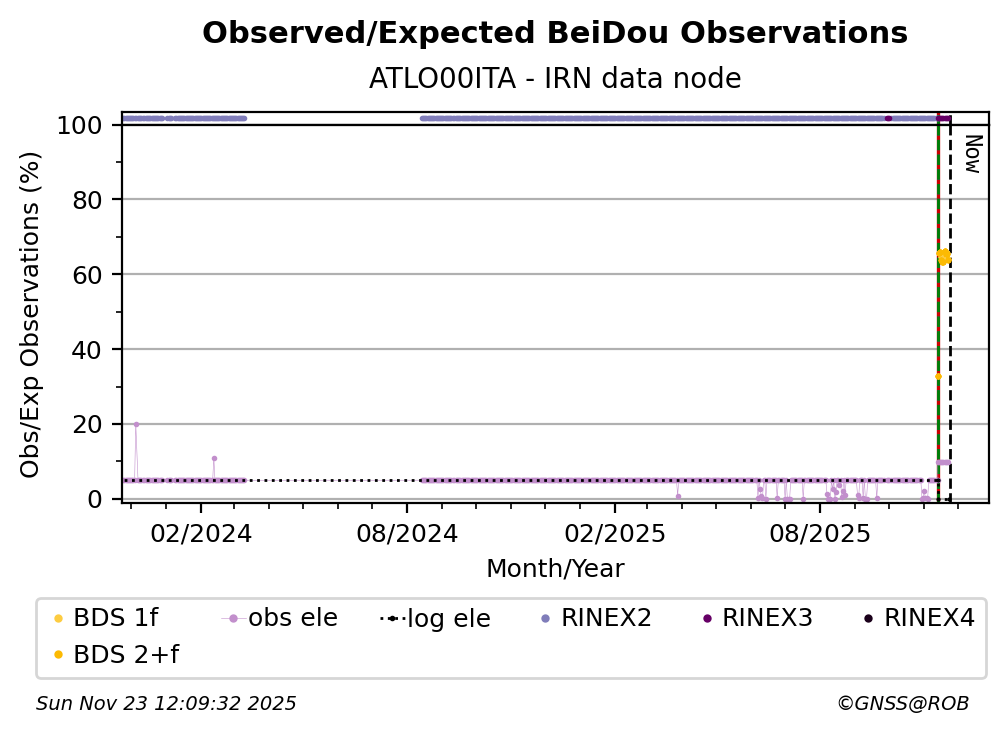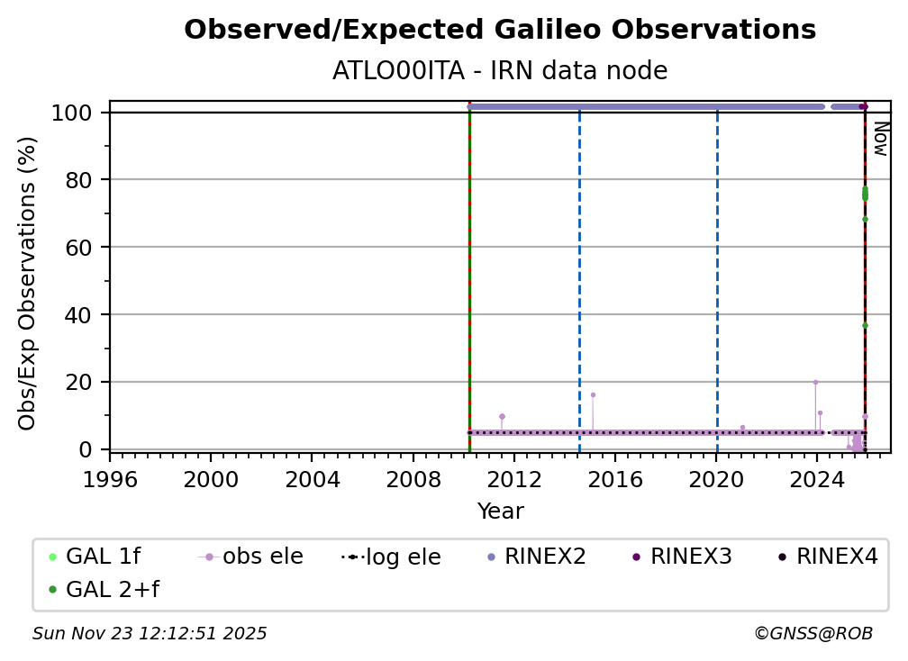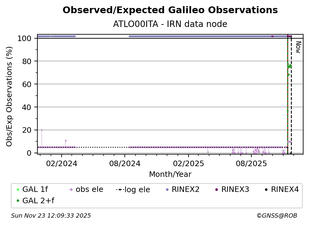 The percentage corresponds, for each constellation tracked by the station, to the ratio of the number of observations in the daily RINEX file with respect to the number of expected observations: