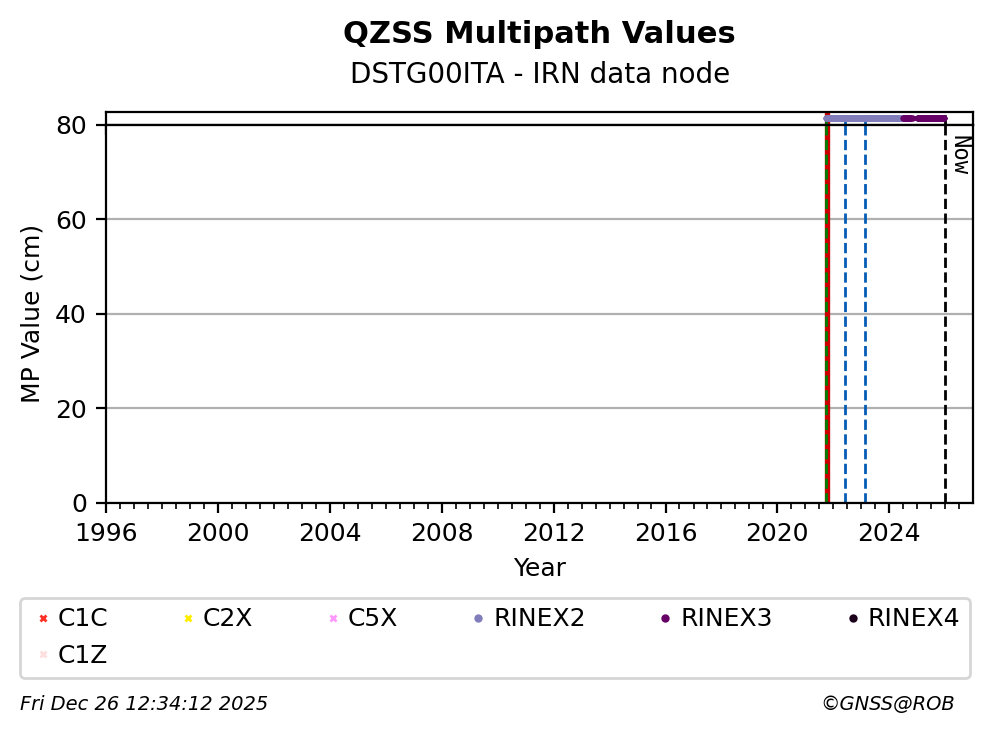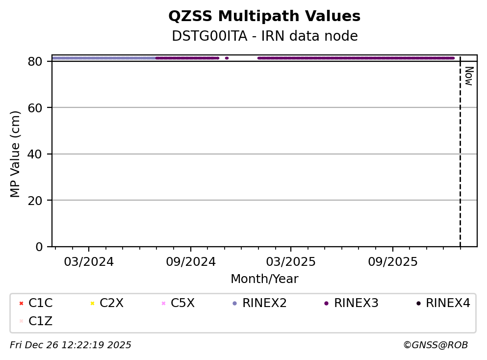These plots display the daily mean of code multipath per frequency band and satellite constellation. Code multipath statistics are calculated for all pseudorange codes of all GNSS satellites providing dual-frequency carrier-phase observations. The code multipath characterizes the quality of the observed signal and the site environment.