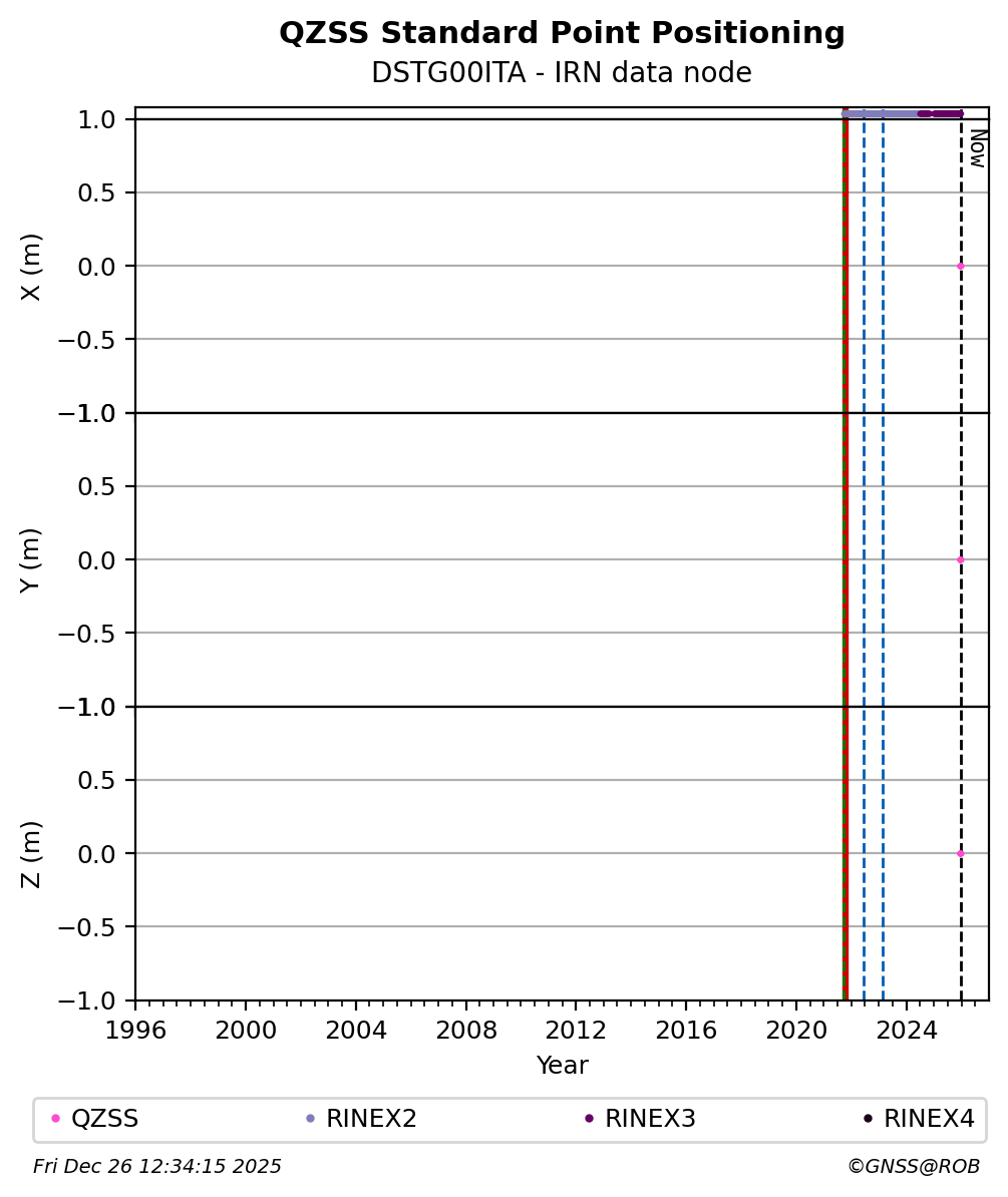 Red vertical lines, green and blue vertical dotted lines indicate respectively a change of antenna, receiver or receiver configuration (including firmware) as indicated by the station manager in the station site log available from the M3G GNSS Metadata Catalog. The purple points in the top of the plot indicate the daily RINEX data availability at the data node.