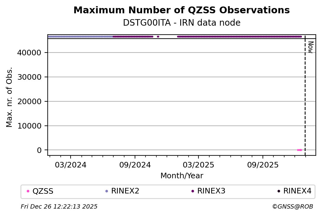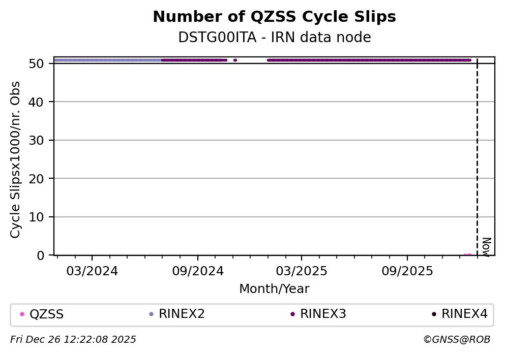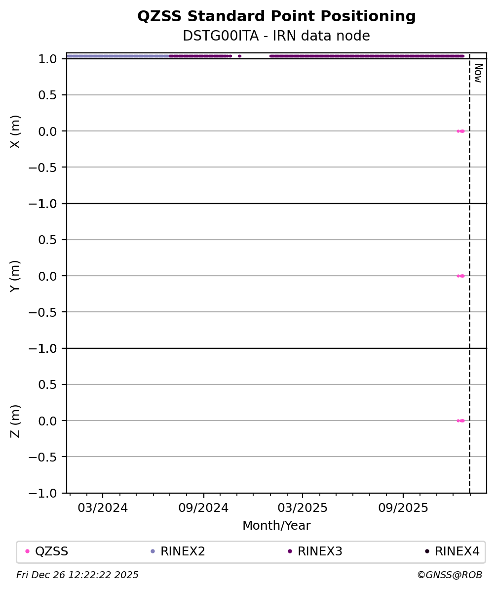 The plots below present the long-term tracking performance of the EPOS-GNSS station DSTG00ITA based on the daily RINEX data available from the IRN EPOS-GNSS data node. The data quality metrics have been computed at the data node using the G-Nut/Anubis software.