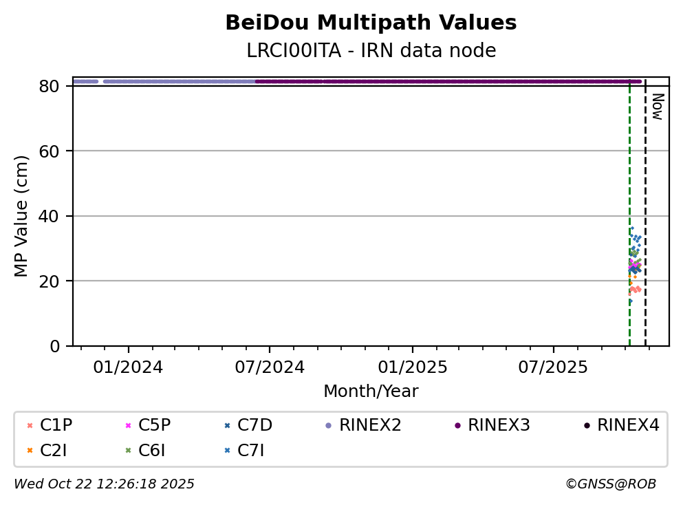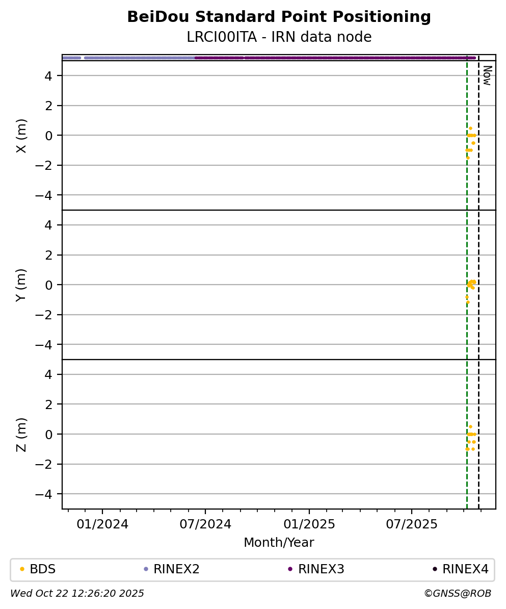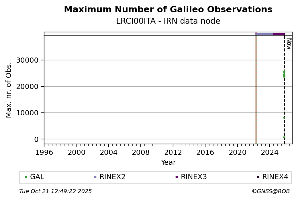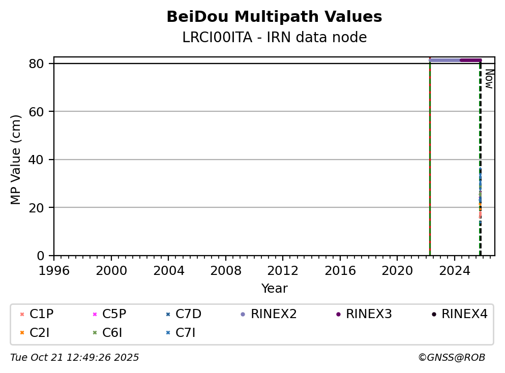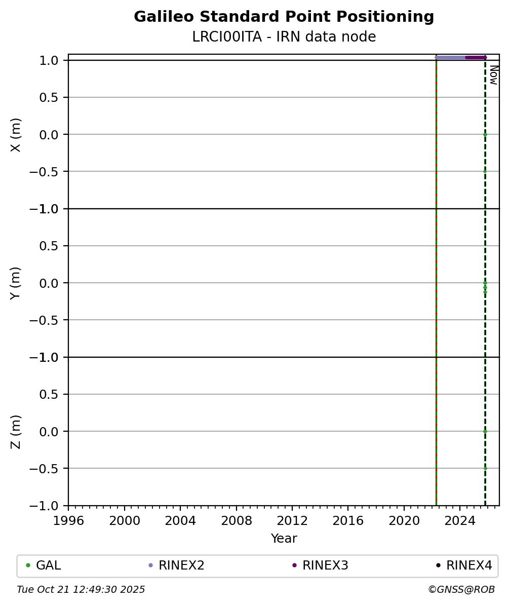 The plots below present the long-term tracking performance of the EPOS-GNSS station LRCI00ITA based on the daily RINEX data available from the IRN EPOS-GNSS data node. The data quality metrics have been computed at the data node using the G-Nut/Anubis software.