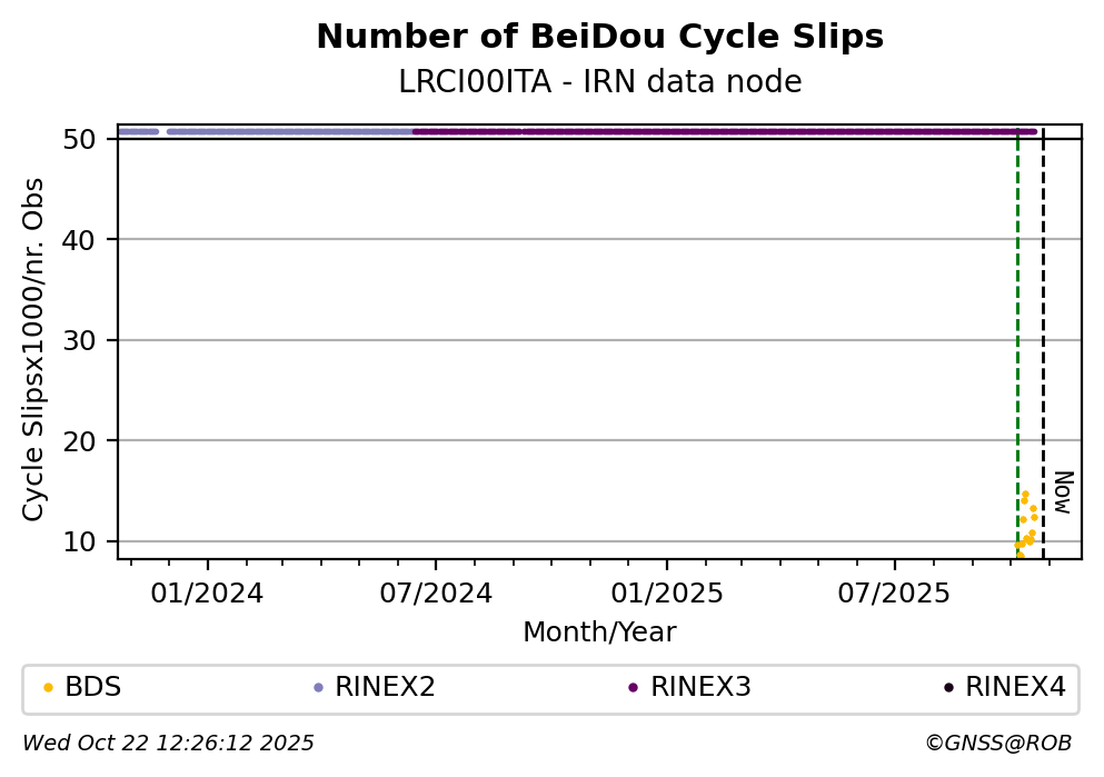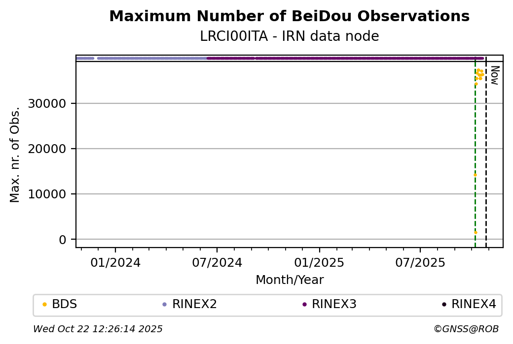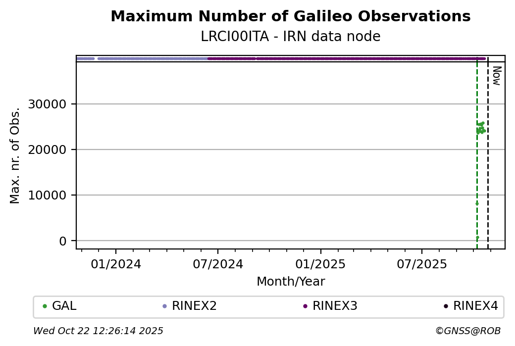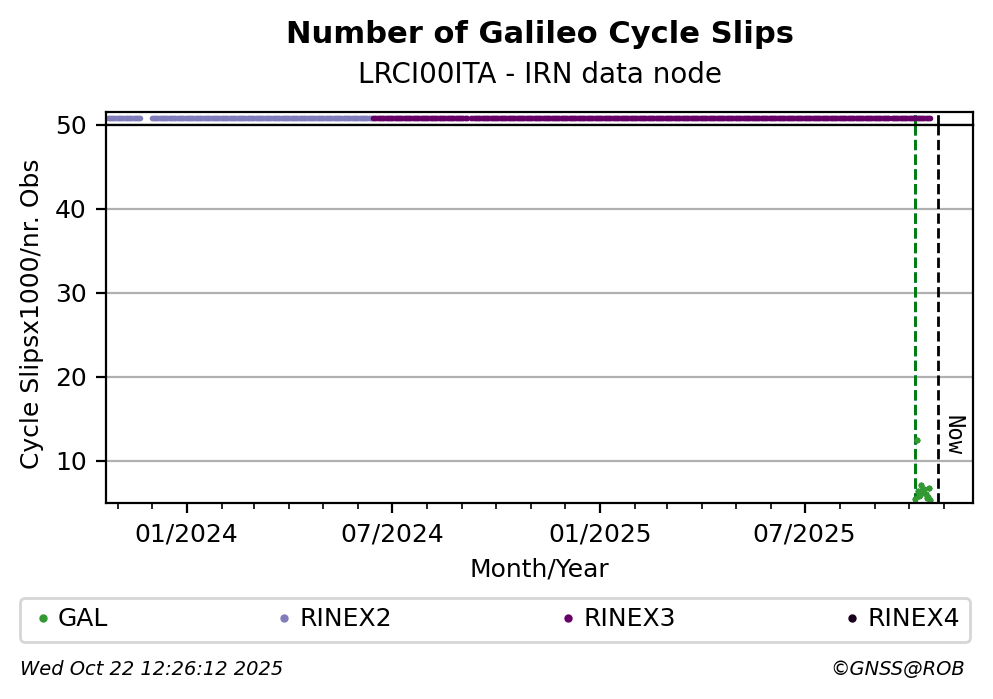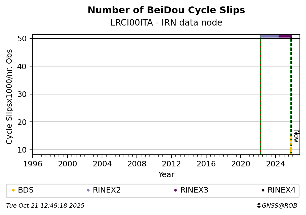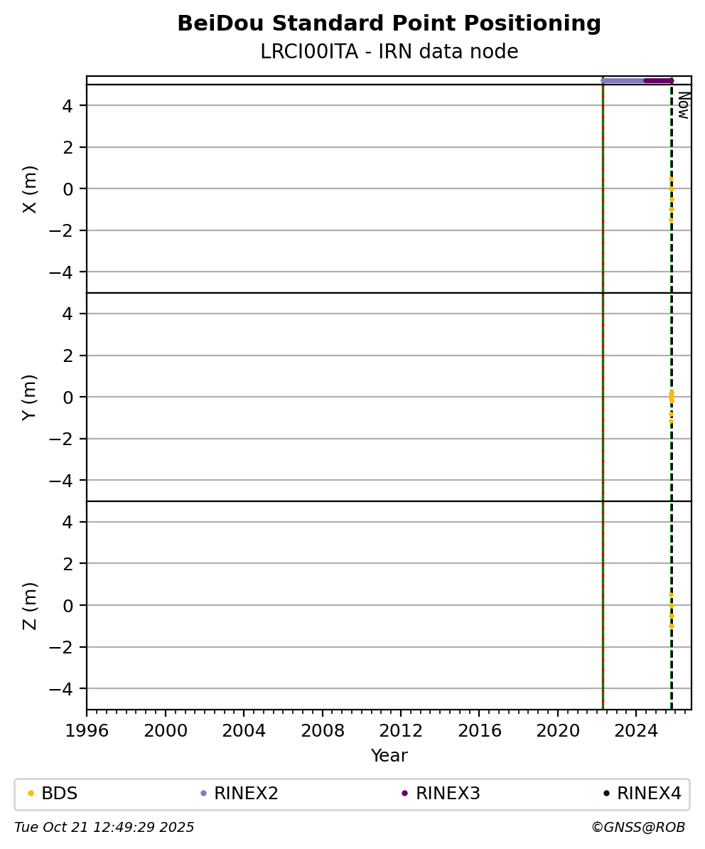 The plots below present the long-term tracking performance of the EPOS-GNSS station LRCI00ITA based on the daily RINEX data available from the IRN EPOS-GNSS data node. The data quality metrics have been computed at the data node using the G-Nut/Anubis software.