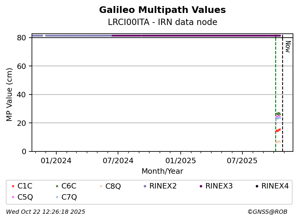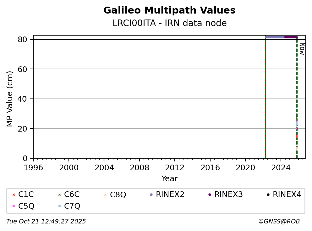 These plots display the daily mean of code multipath per frequency band and satellite constellation. Code multipath statistics are calculated for all pseudorange codes of all GNSS satellites providing dual-frequency carrier-phase observations. The code multipath characterizes the quality of the observed signal and the site environment.