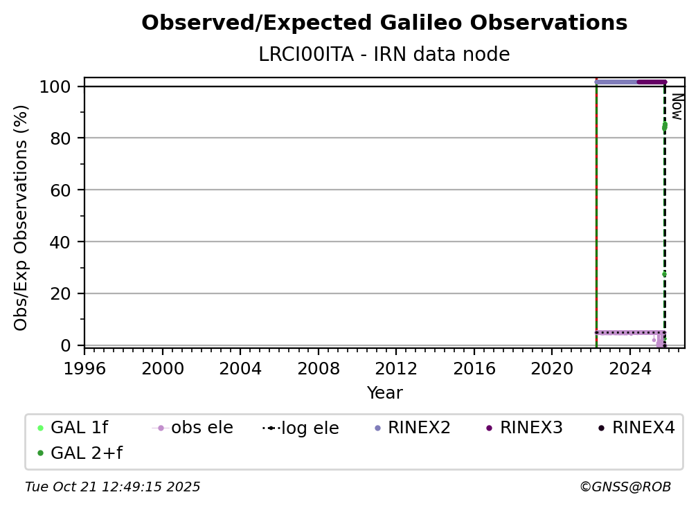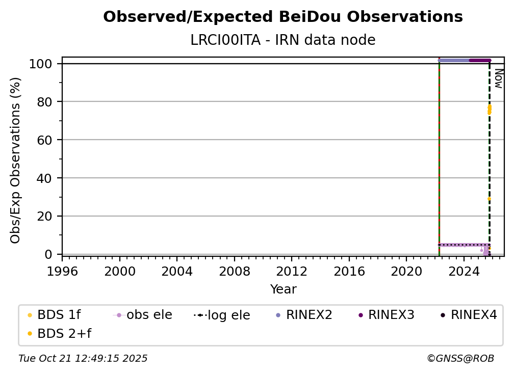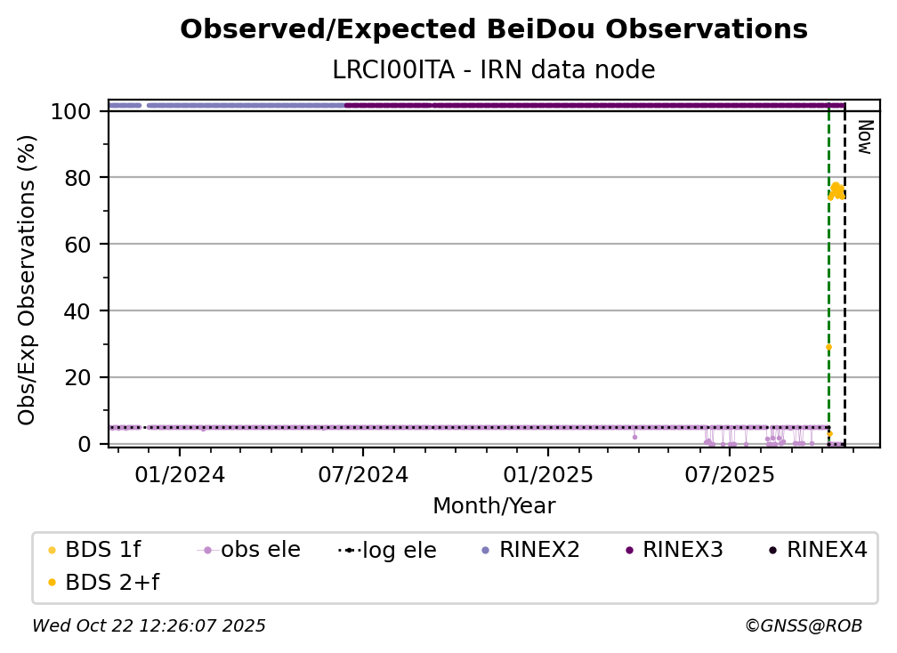 The percentage corresponds, for each constellation tracked by the station, to the ratio of the number of observations in the daily RINEX file with respect to the number of expected observations: