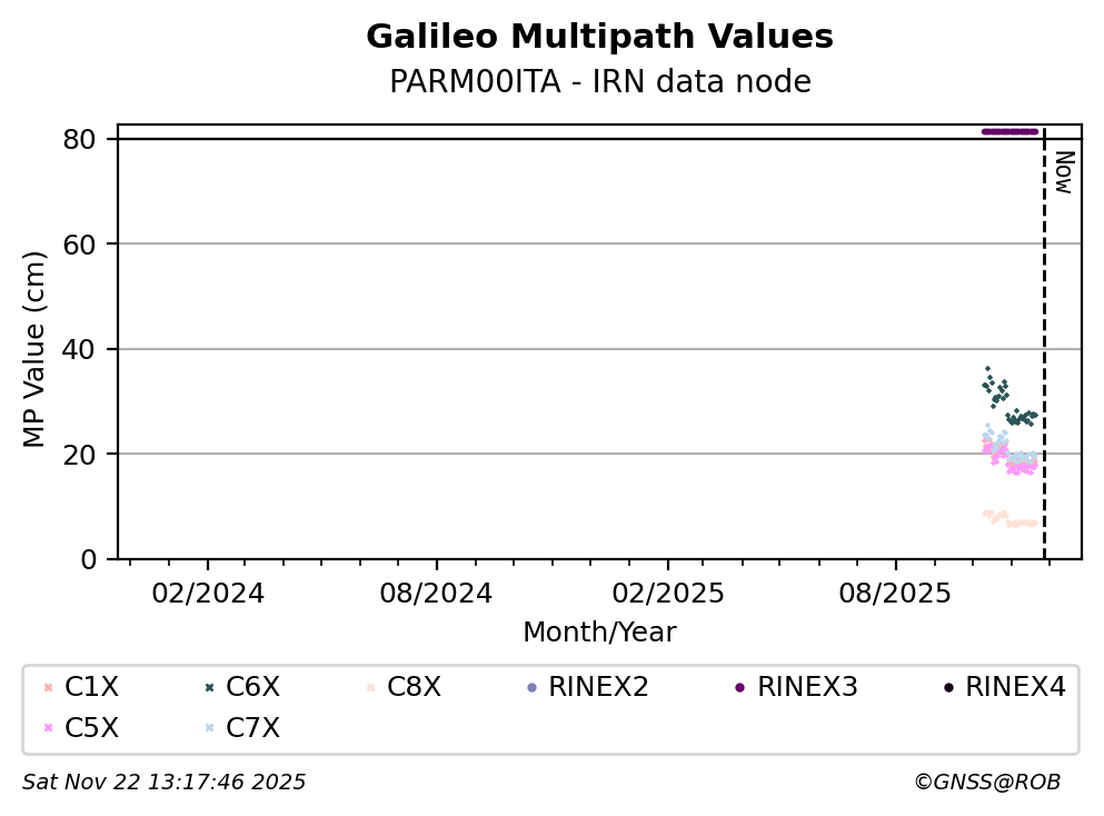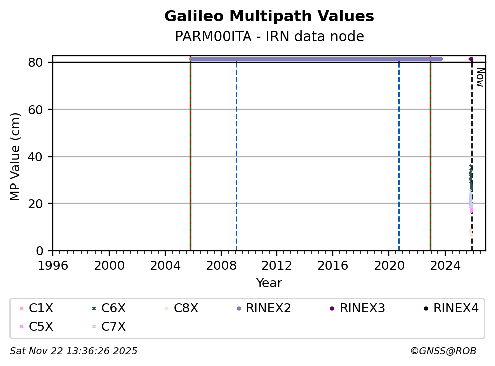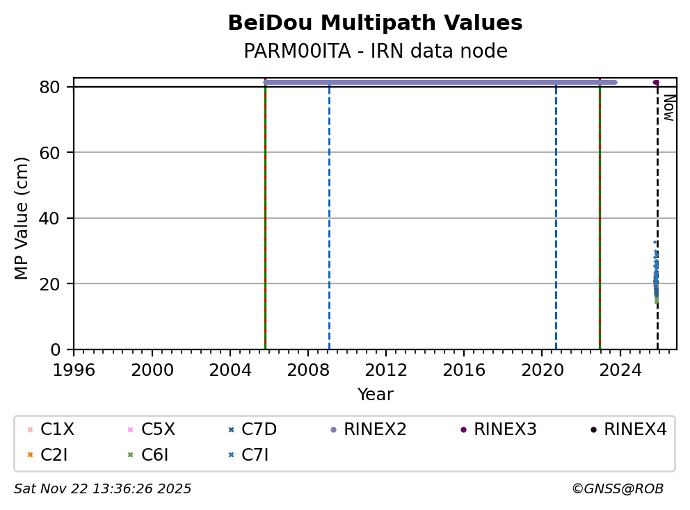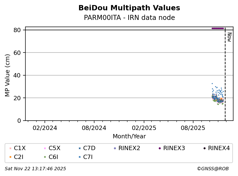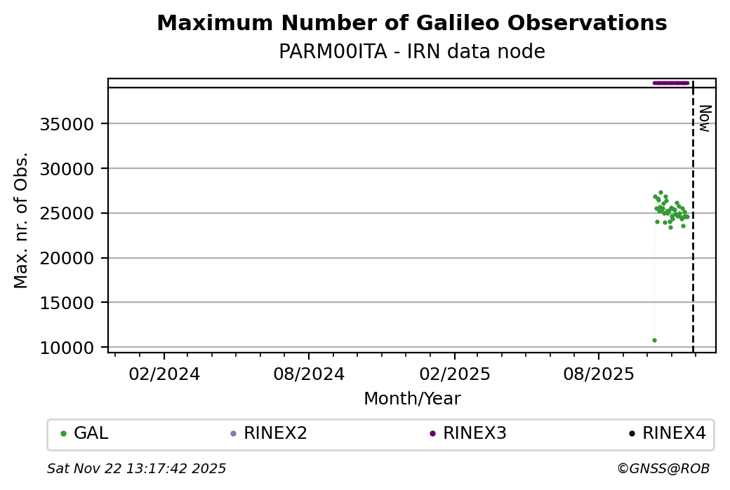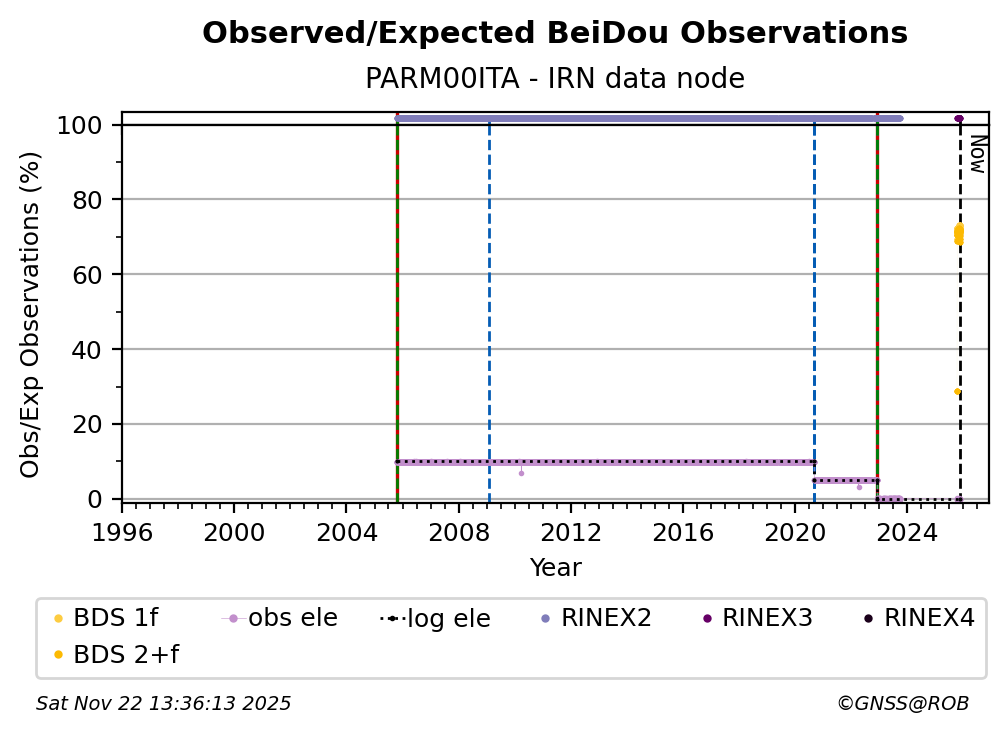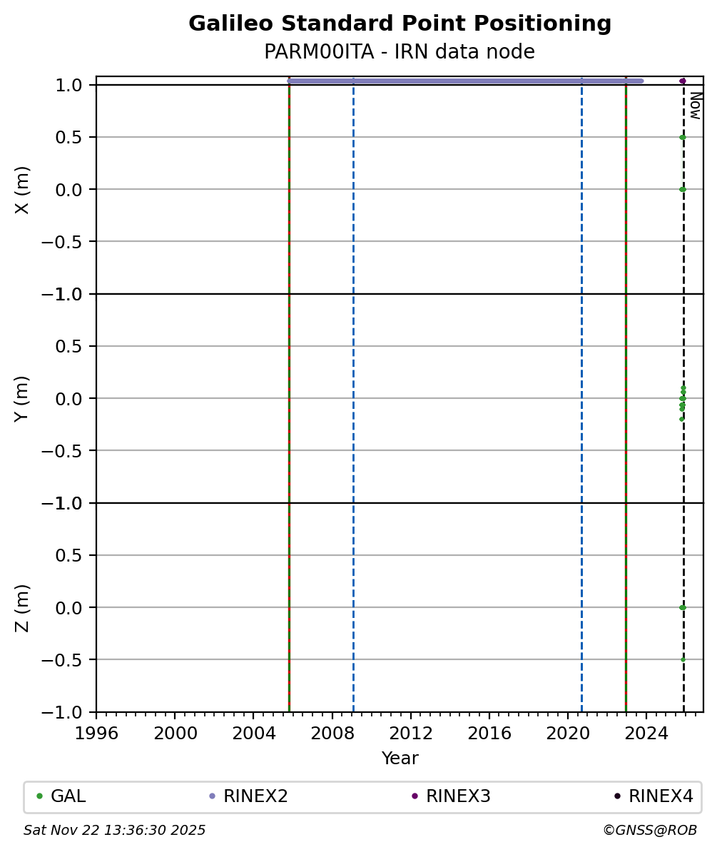 The plots below present the long-term tracking performance of the EPOS-GNSS station PARM00ITA based on the daily RINEX data available from the IRN EPOS-GNSS data node. The data quality metrics have been computed at the data node using the G-Nut/Anubis software.