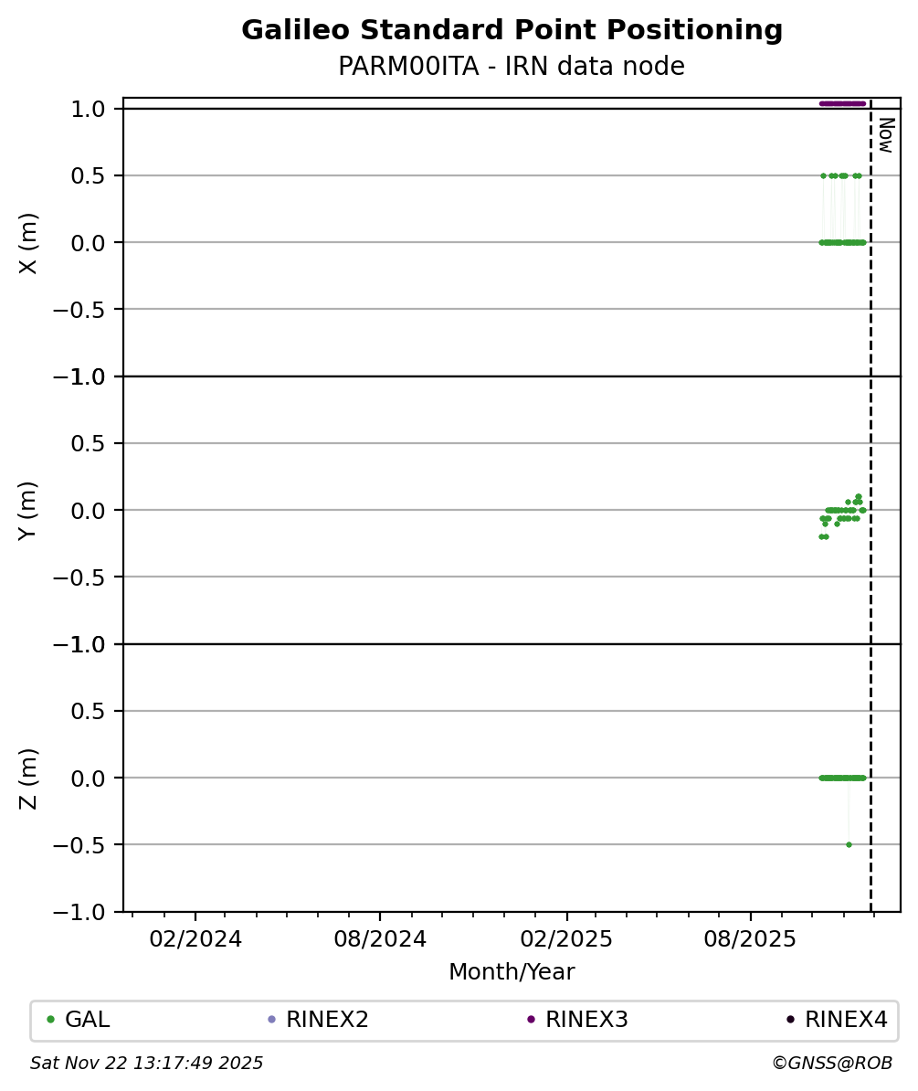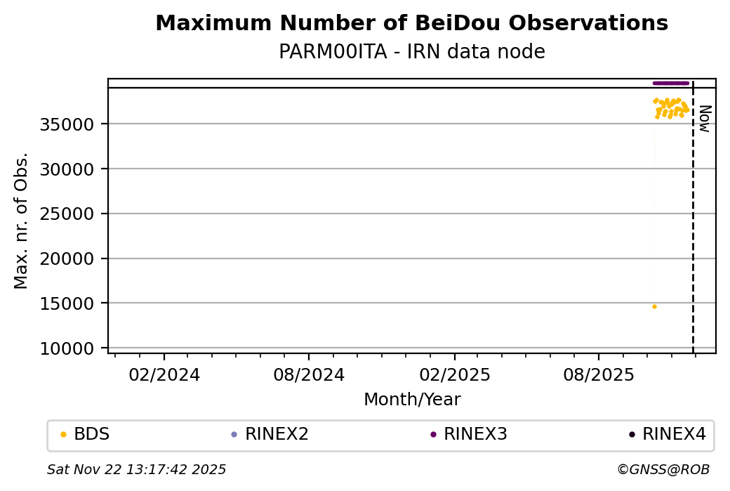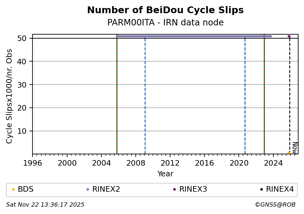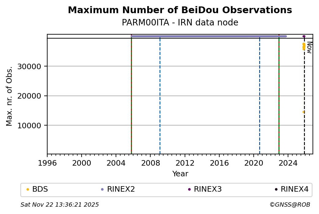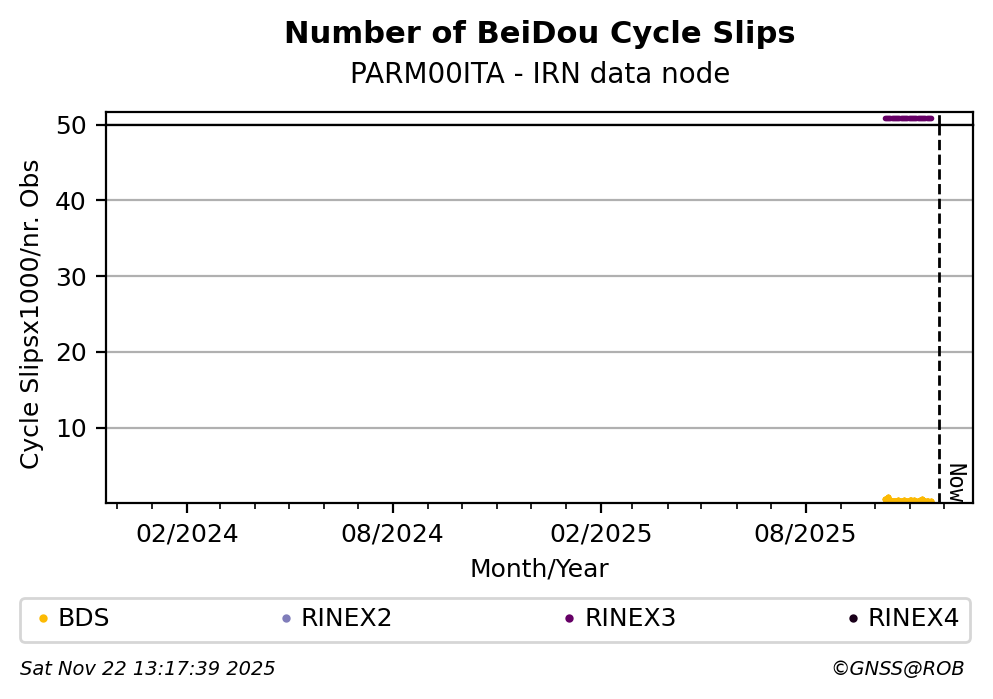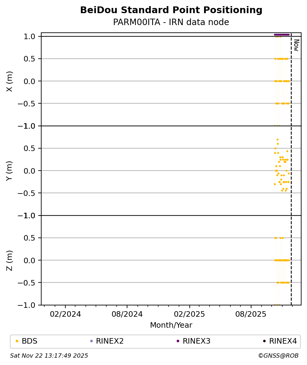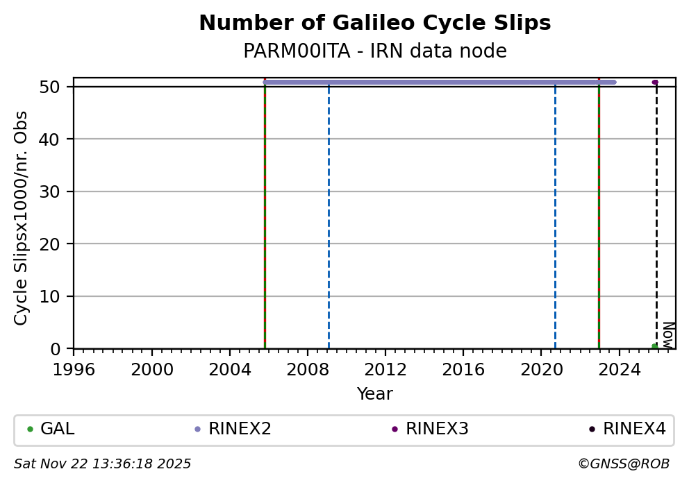 The plots below present the long-term tracking performance of the EPOS-GNSS station PARM00ITA based on the daily RINEX data available from the IRN EPOS-GNSS data node. The data quality metrics have been computed at the data node using the G-Nut/Anubis software.