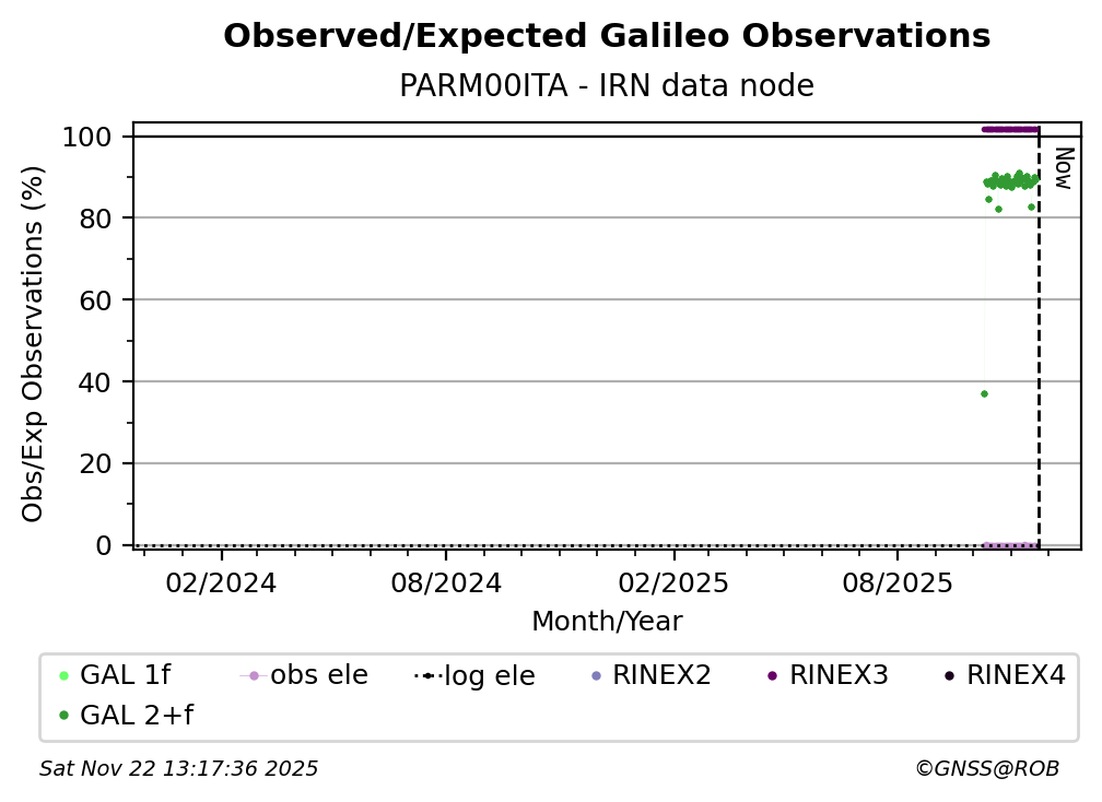 The percentage corresponds, for each constellation tracked by the station, to the ratio of the number of observations in the daily RINEX file with respect to the number of expected observations: