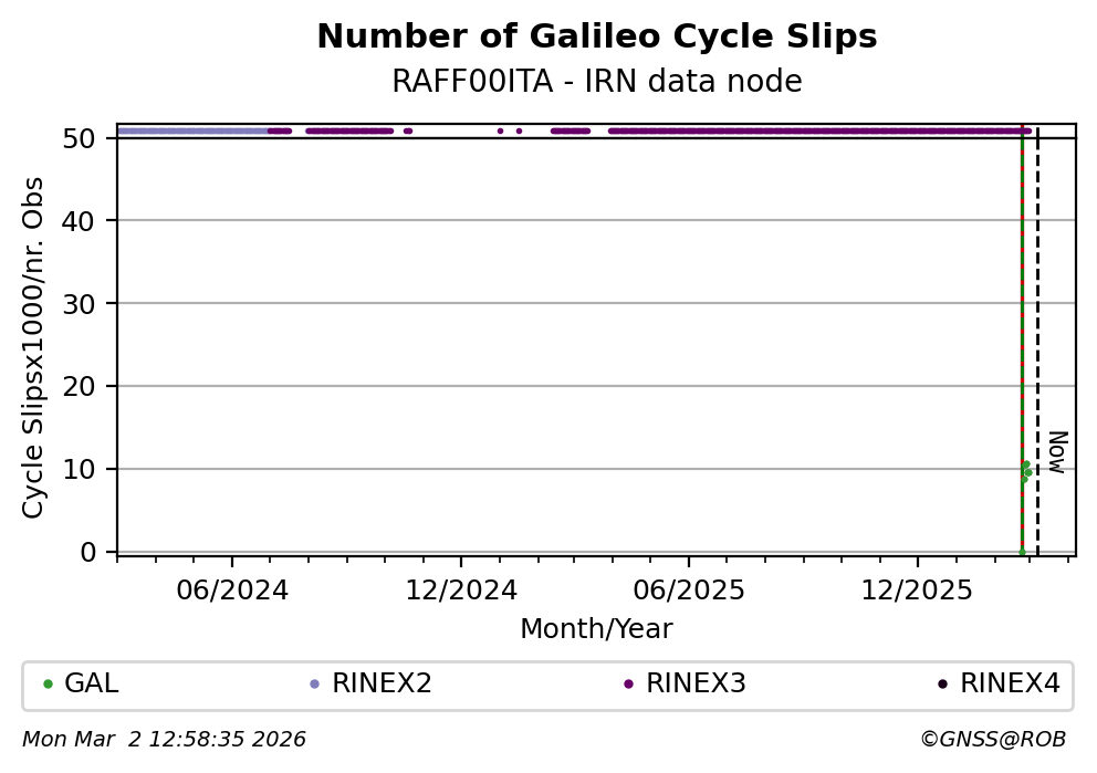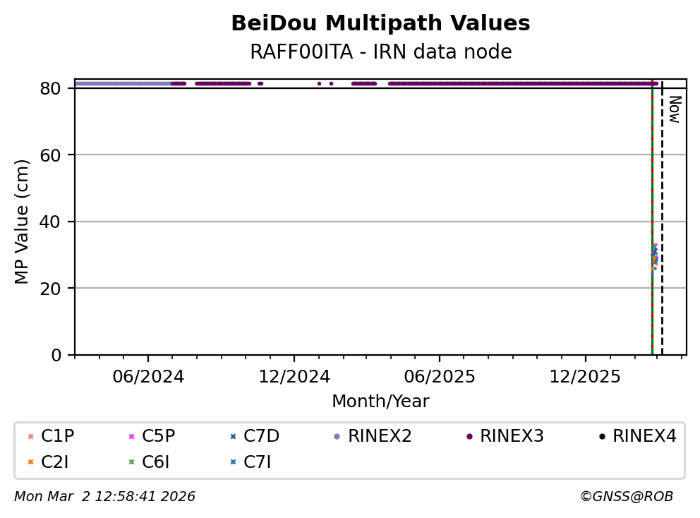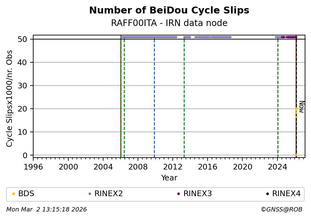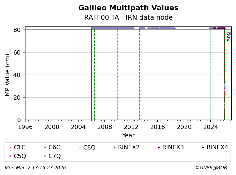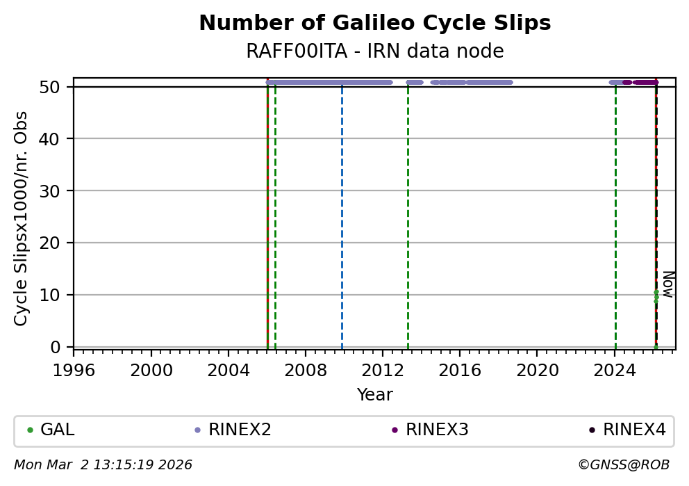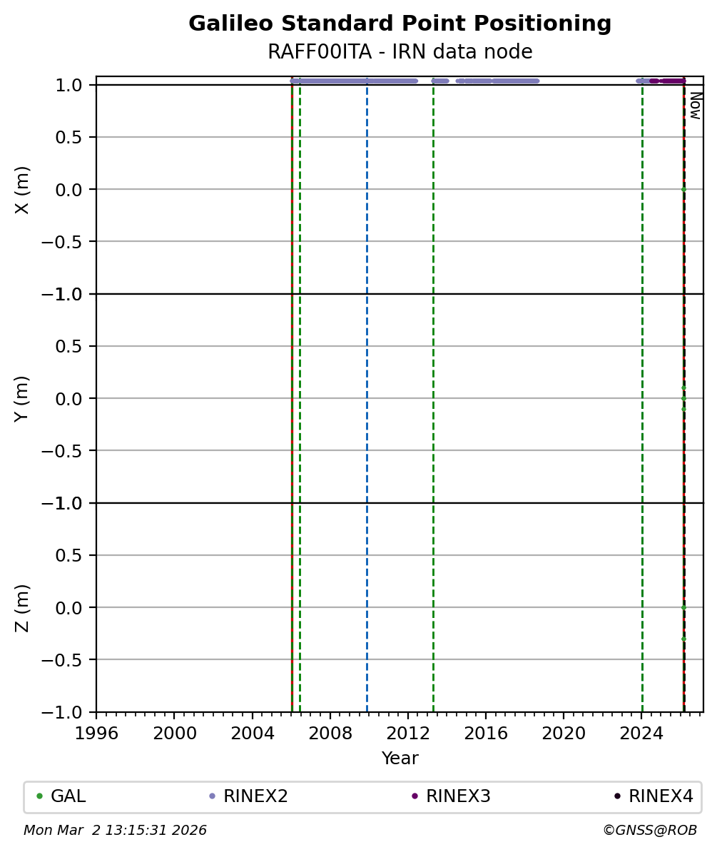 The plots below present the long-term tracking performance of the EPOS-GNSS station RAFF00ITA based on the daily RINEX data available from the IRN EPOS-GNSS data node. The data quality metrics have been computed at the data node using the G-Nut/Anubis software.