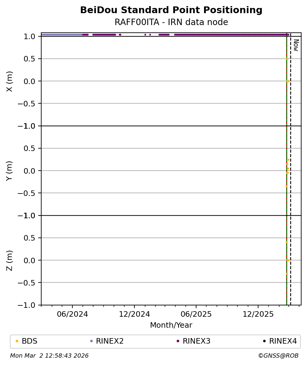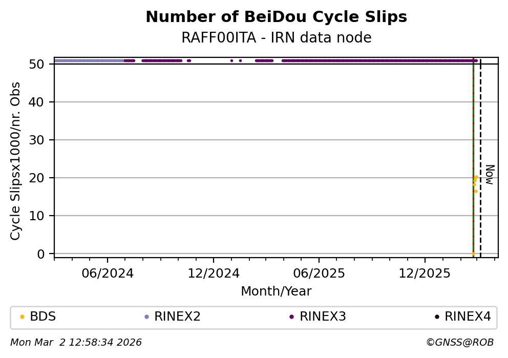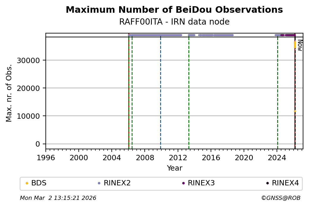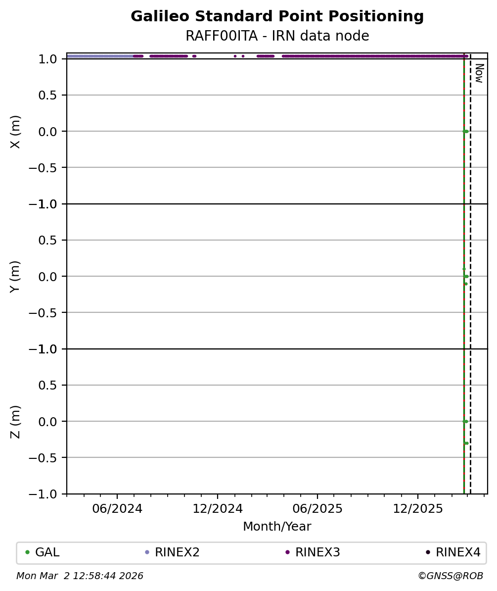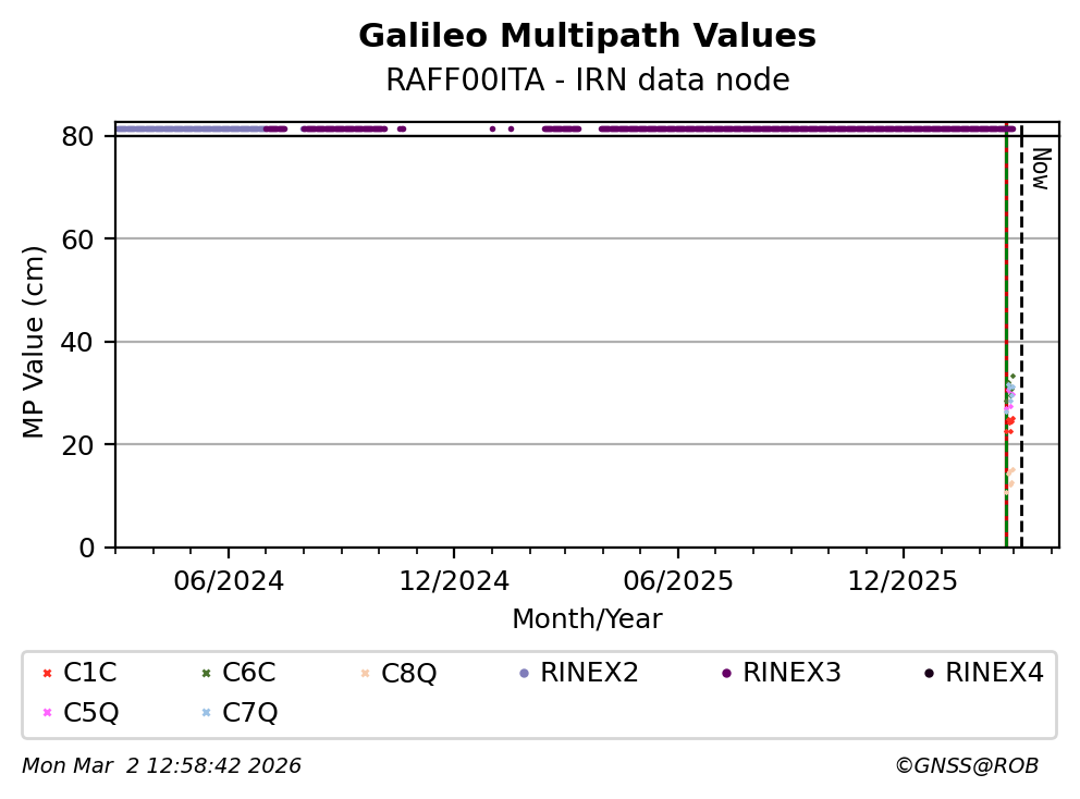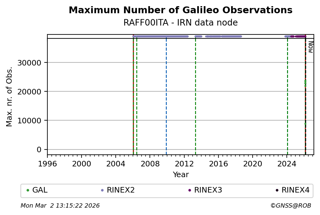 The plots below present the long-term tracking performance of the EPOS-GNSS station RAFF00ITA based on the daily RINEX data available from the IRN EPOS-GNSS data node. The data quality metrics have been computed at the data node using the G-Nut/Anubis software.