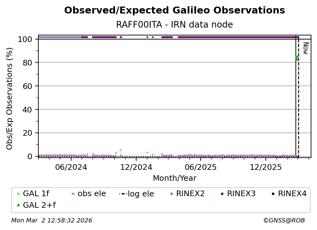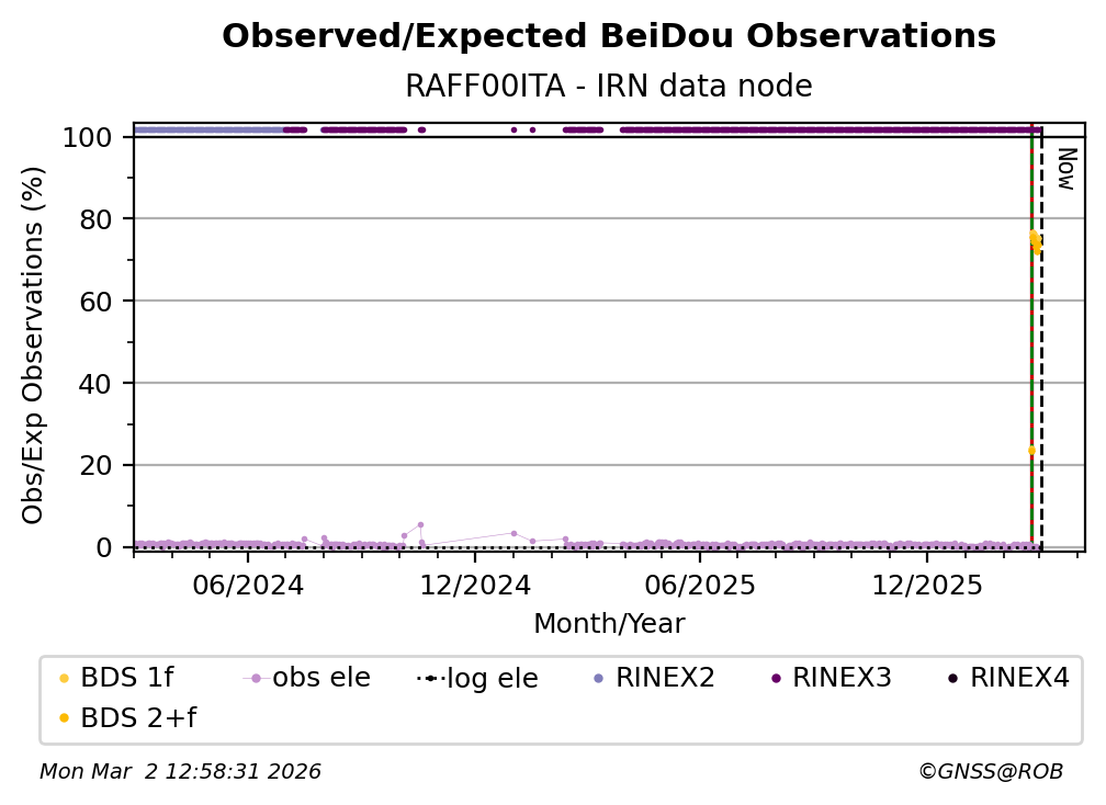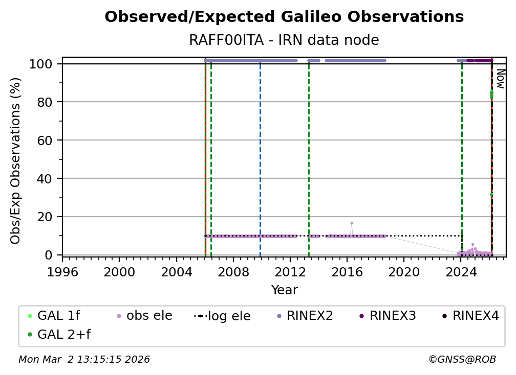 The percentage corresponds, for each constellation tracked by the station, to the ratio of the number of observations in the daily RINEX file with respect to the number of expected observations: