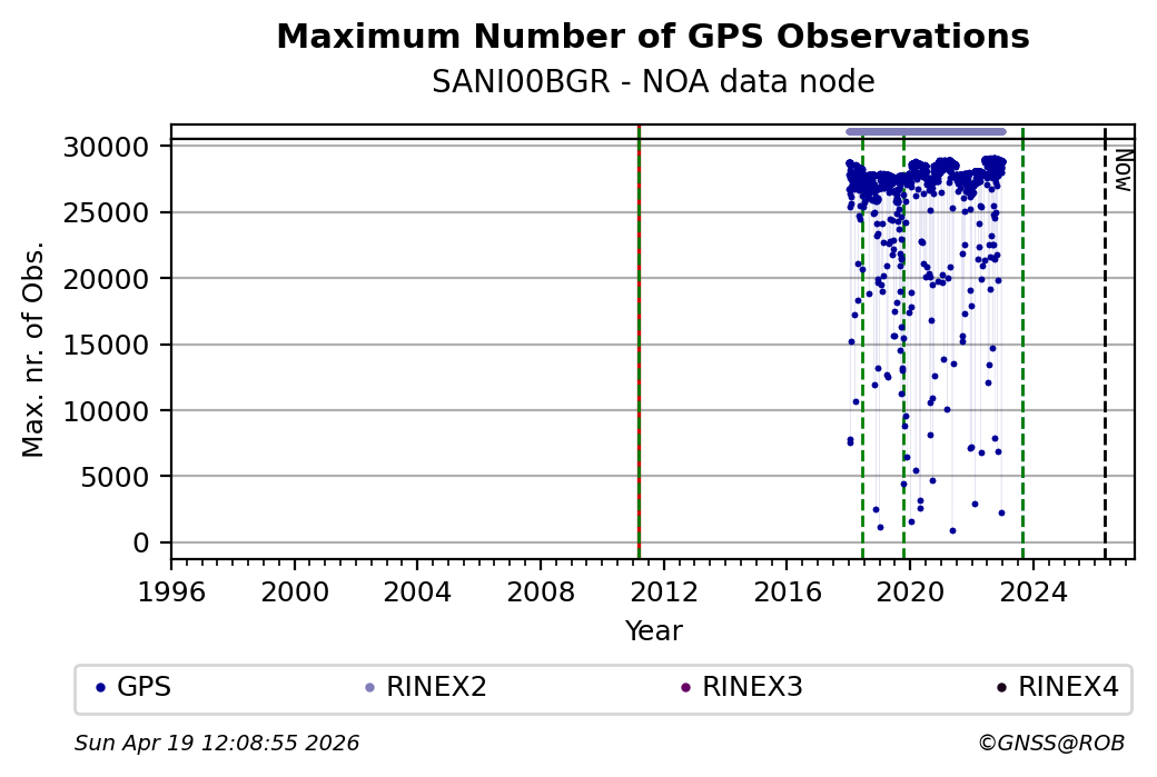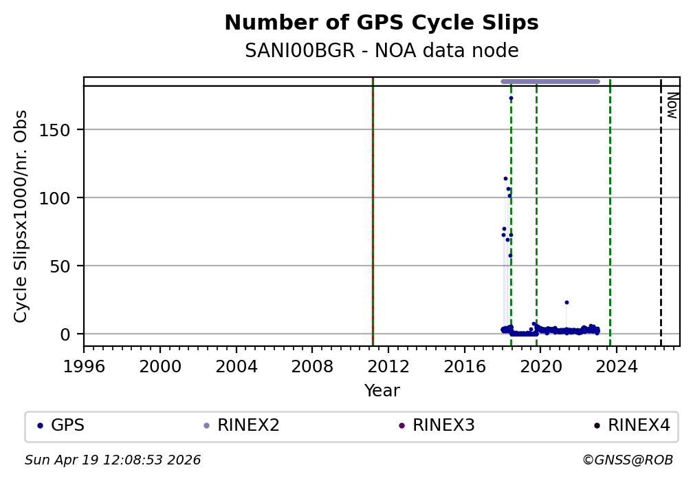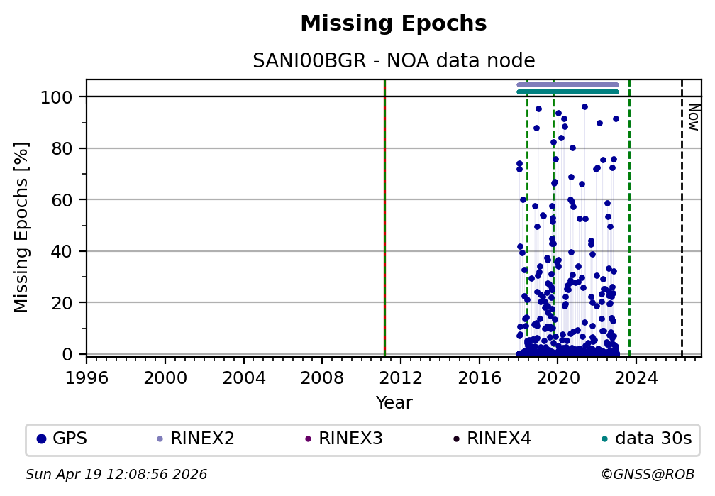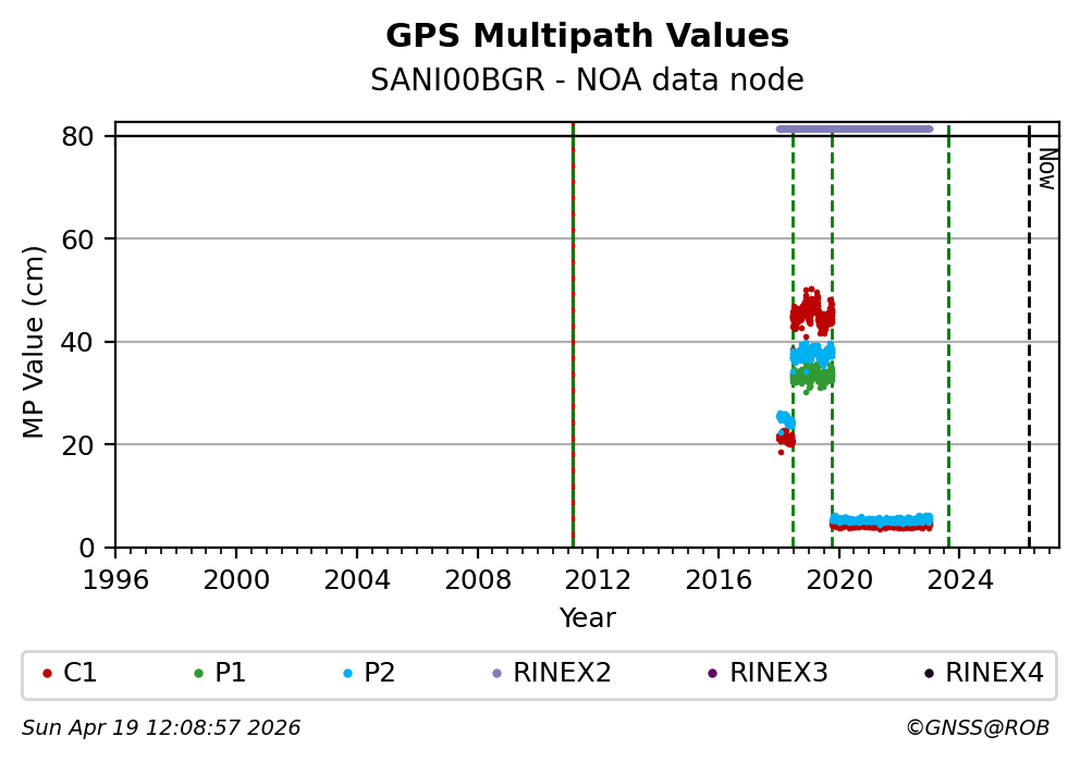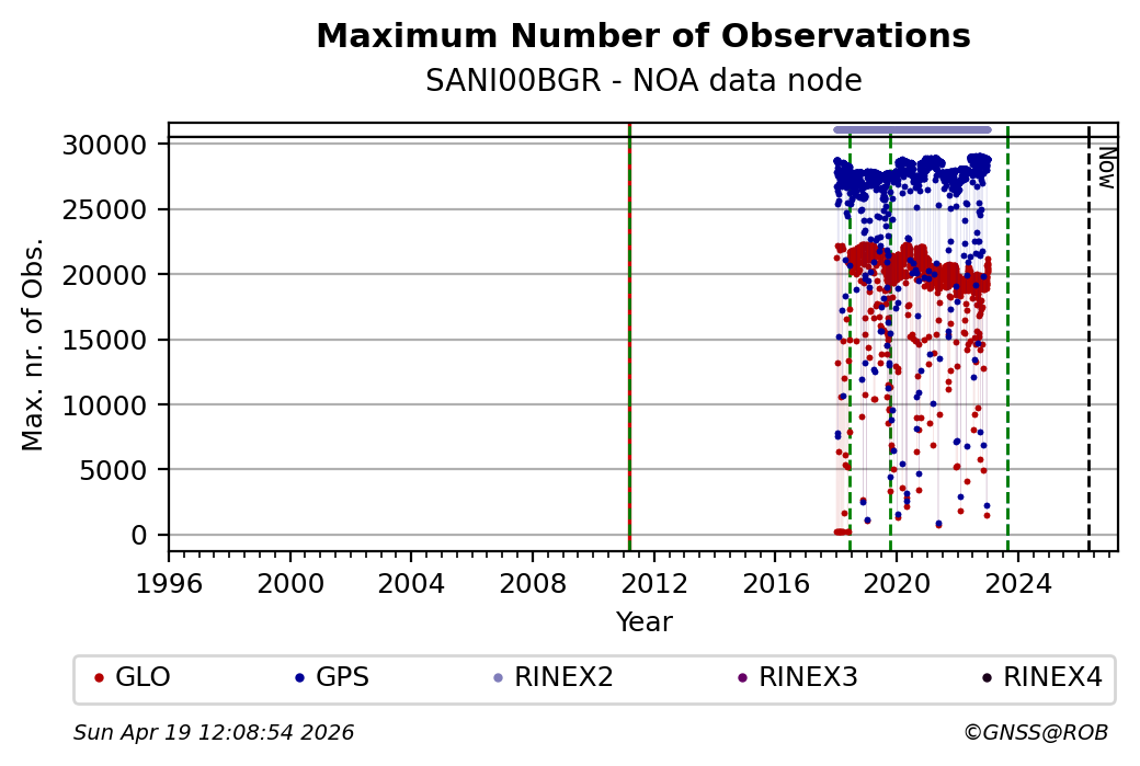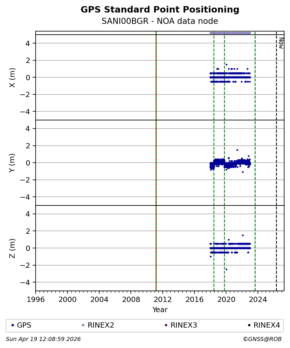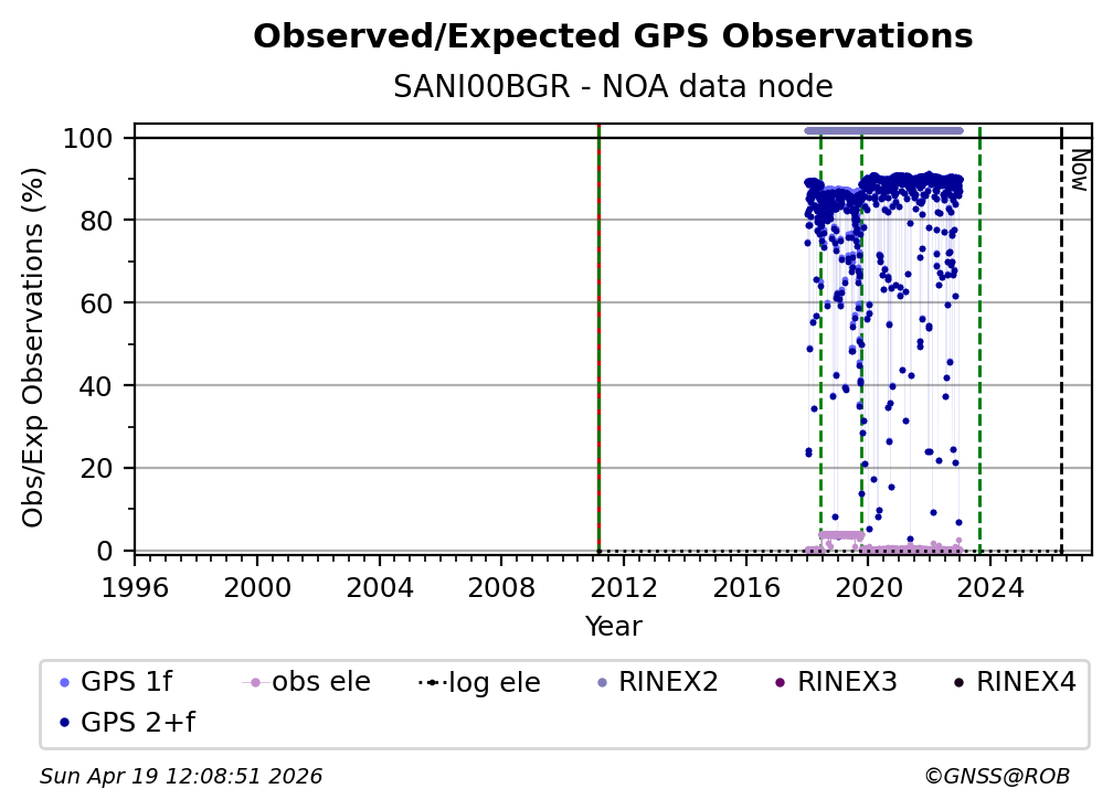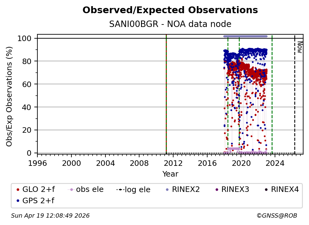 The plots below present the long-term tracking performance of the EPOS-GNSS station SANI00BGR based on the daily RINEX data available from the NOA EPOS-GNSS data node. The data quality metrics have been computed at the data node using the G-Nut/Anubis software.