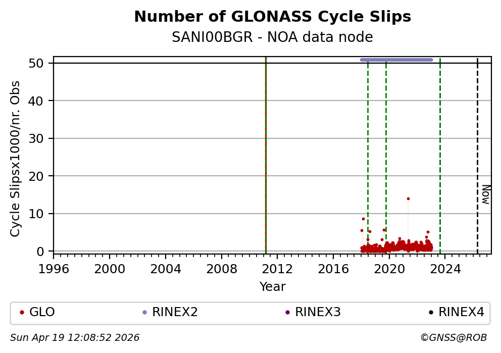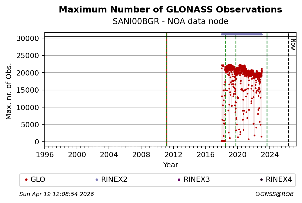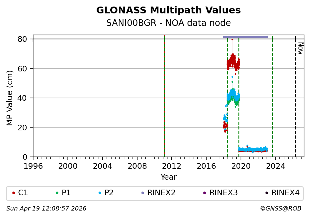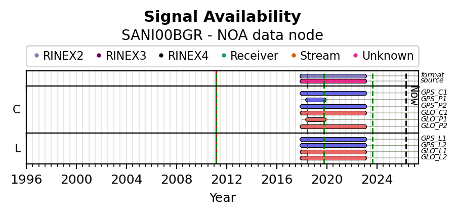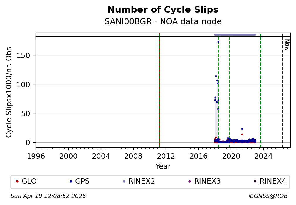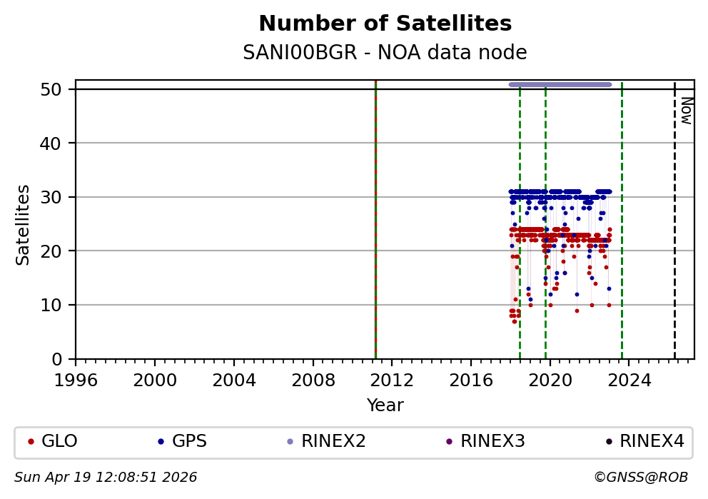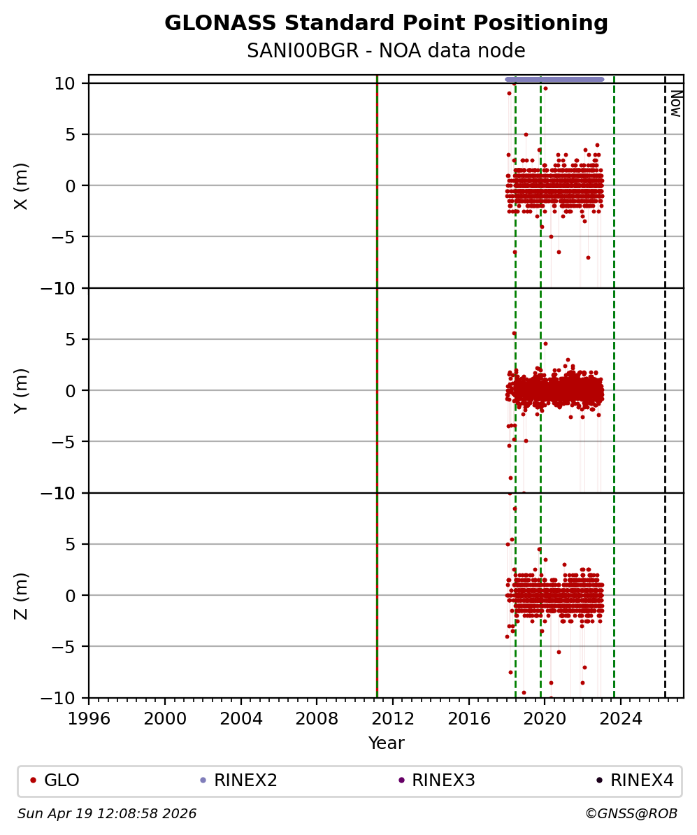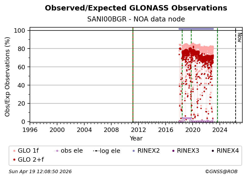 The plots below present the long-term tracking performance of the EPOS-GNSS station SANI00BGR based on the daily RINEX data available from the NOA EPOS-GNSS data node. The data quality metrics have been computed at the data node using the G-Nut/Anubis software.