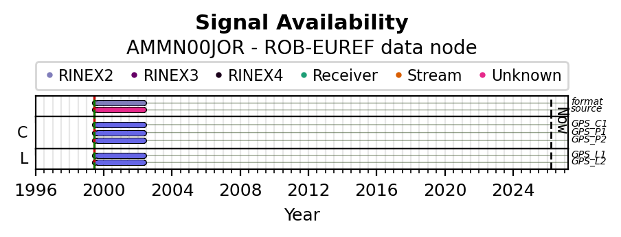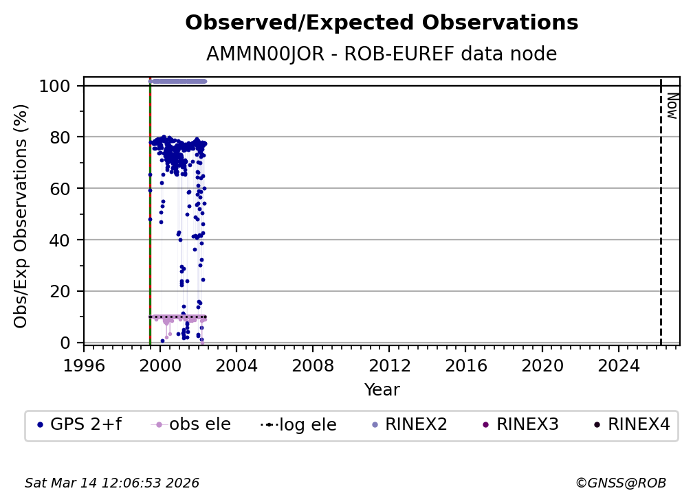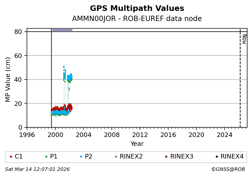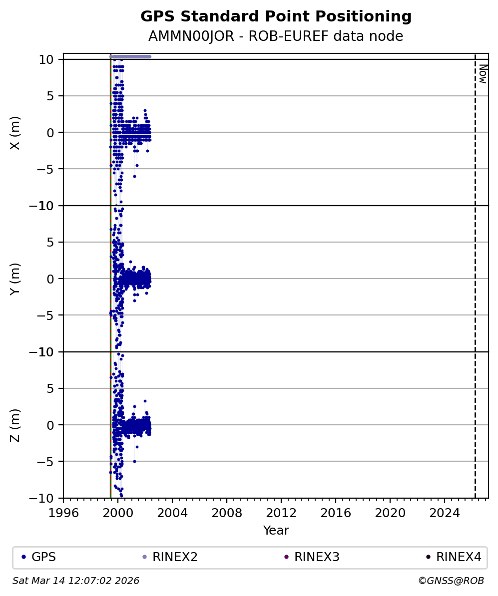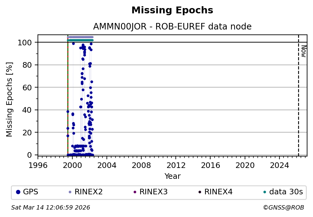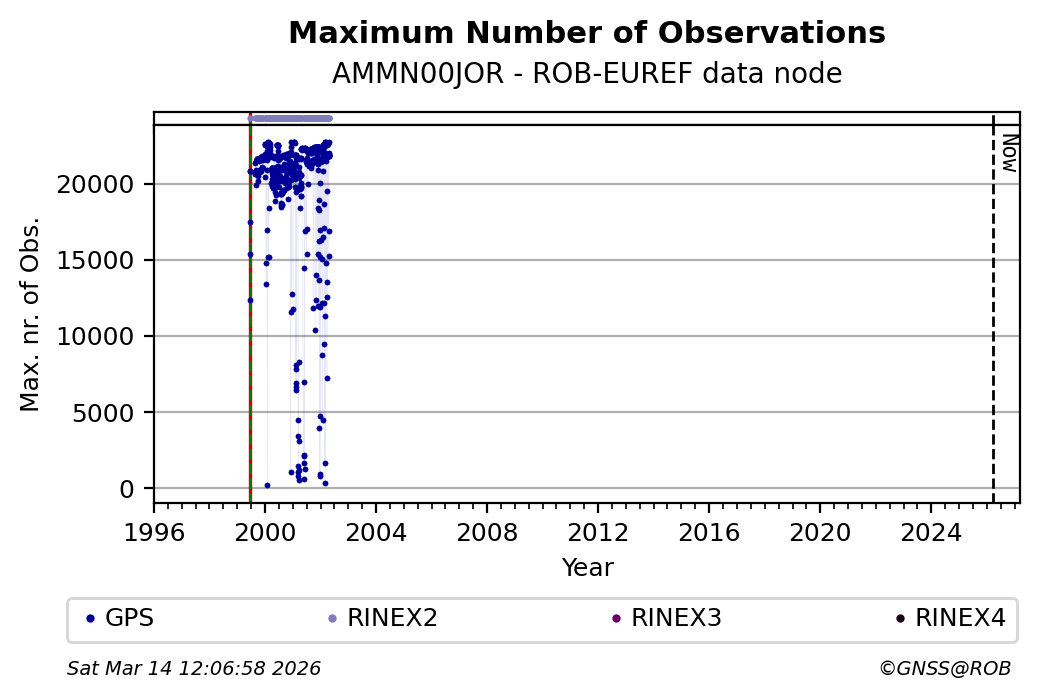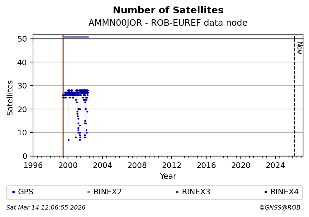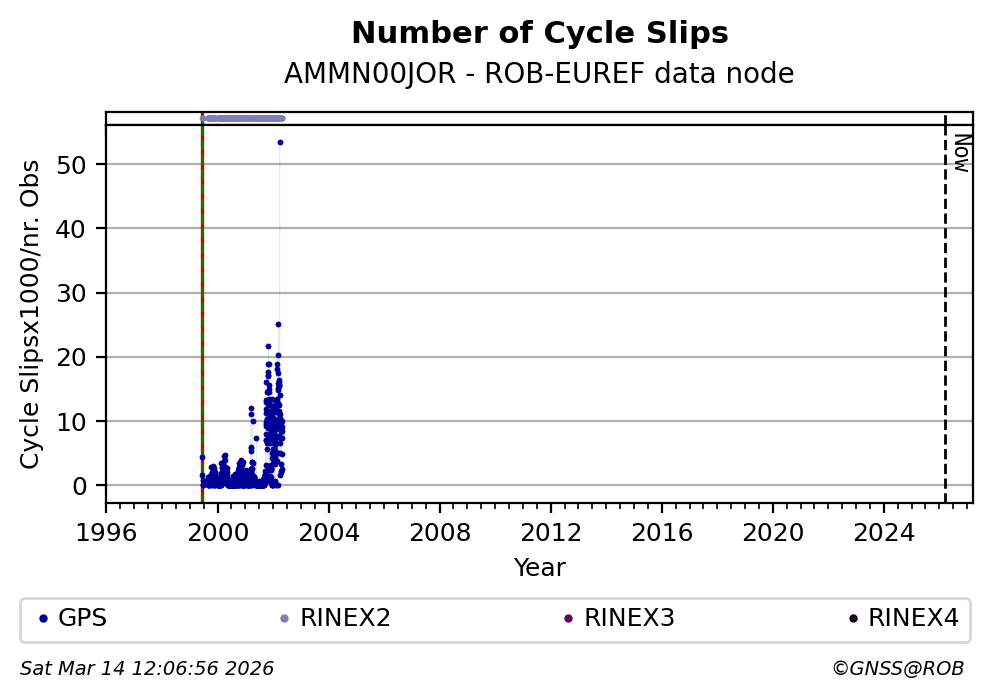 The plots below present the long-term tracking performance of the EPOS-GNSS station AMMN00JOR based on the daily RINEX data available from the ROB-EUREF EPOS-GNSS data node. The data quality metrics have been computed at the data node using the G-Nut/Anubis software. Input files are the daily RINEX (V2 or V3) observation files available from ROB-EUREF EPOS-GNSS data node.