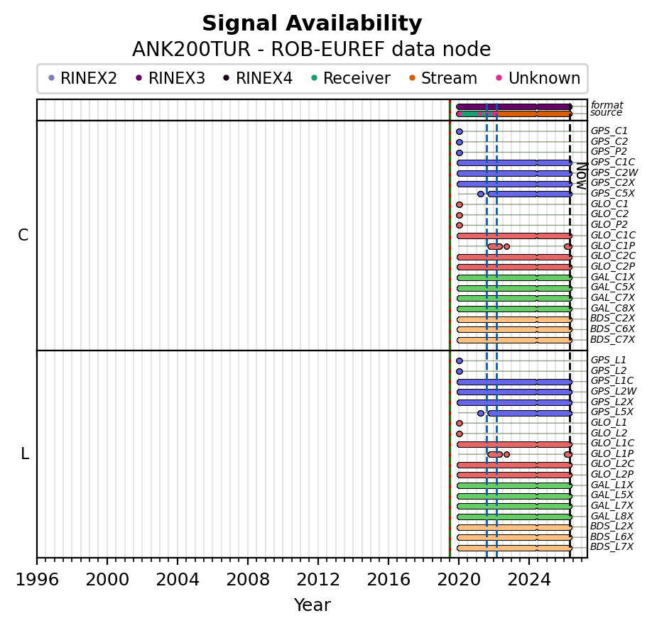 Red vertical lines, green and blue vertical dotted lines indicate respectively a change of antenna, receiver or receiver configuration (including firmware) as indicated by the station manager in the station site log available from the M3G GNSS Metadata Catalog. The purple points in the top of the plot indicate the daily RINEX data availability at the data node.